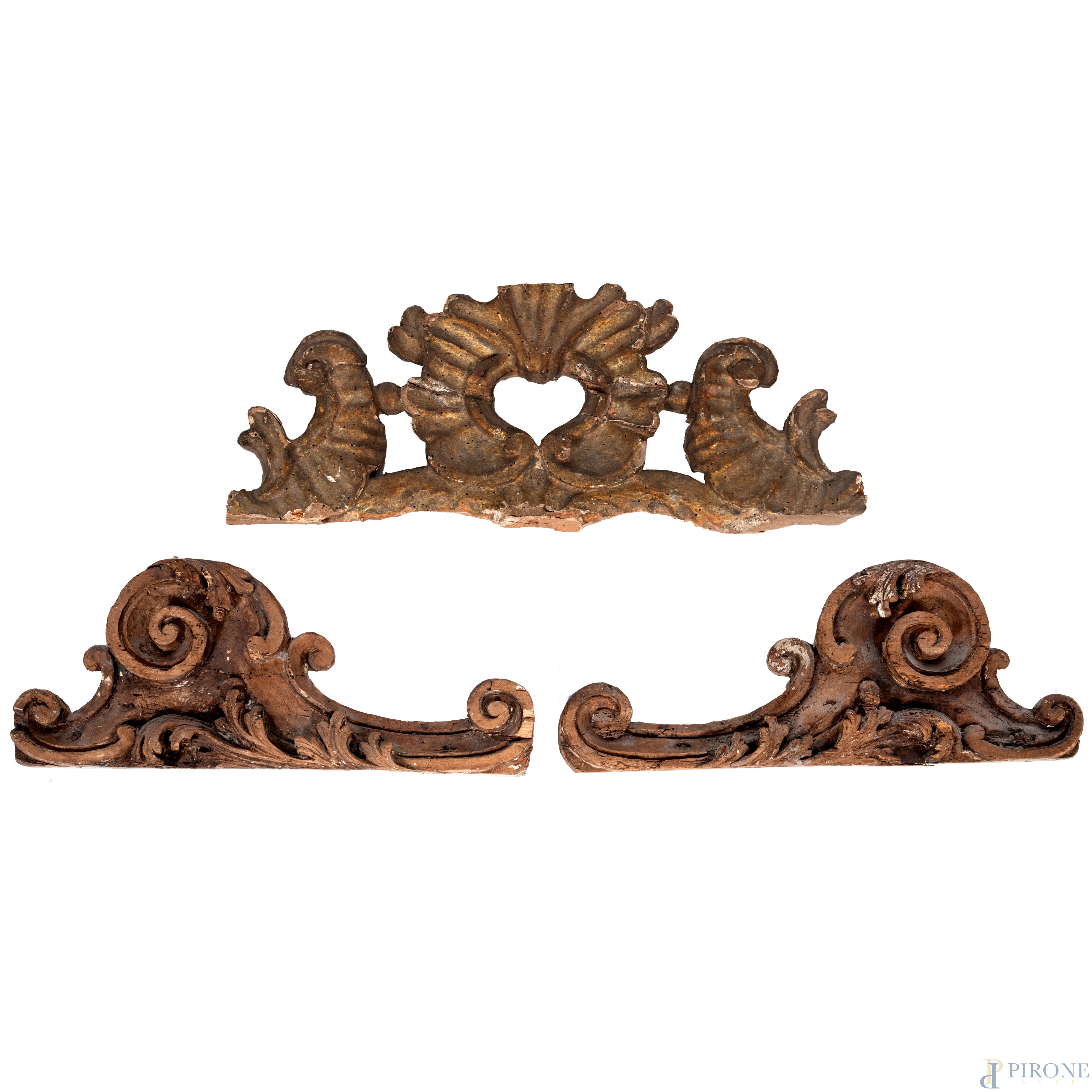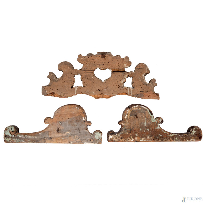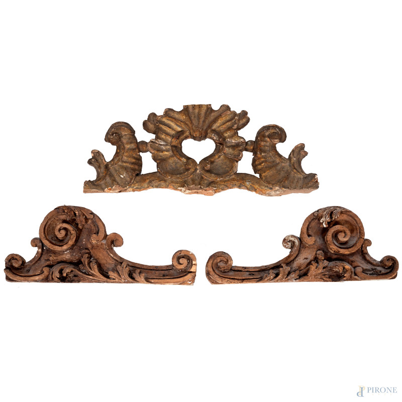 Lotto di tre fregi in legno intagliato e dorato, XIX secolo, misure massime cm 48x19 (segni di usura, scalfiture, difetti)