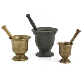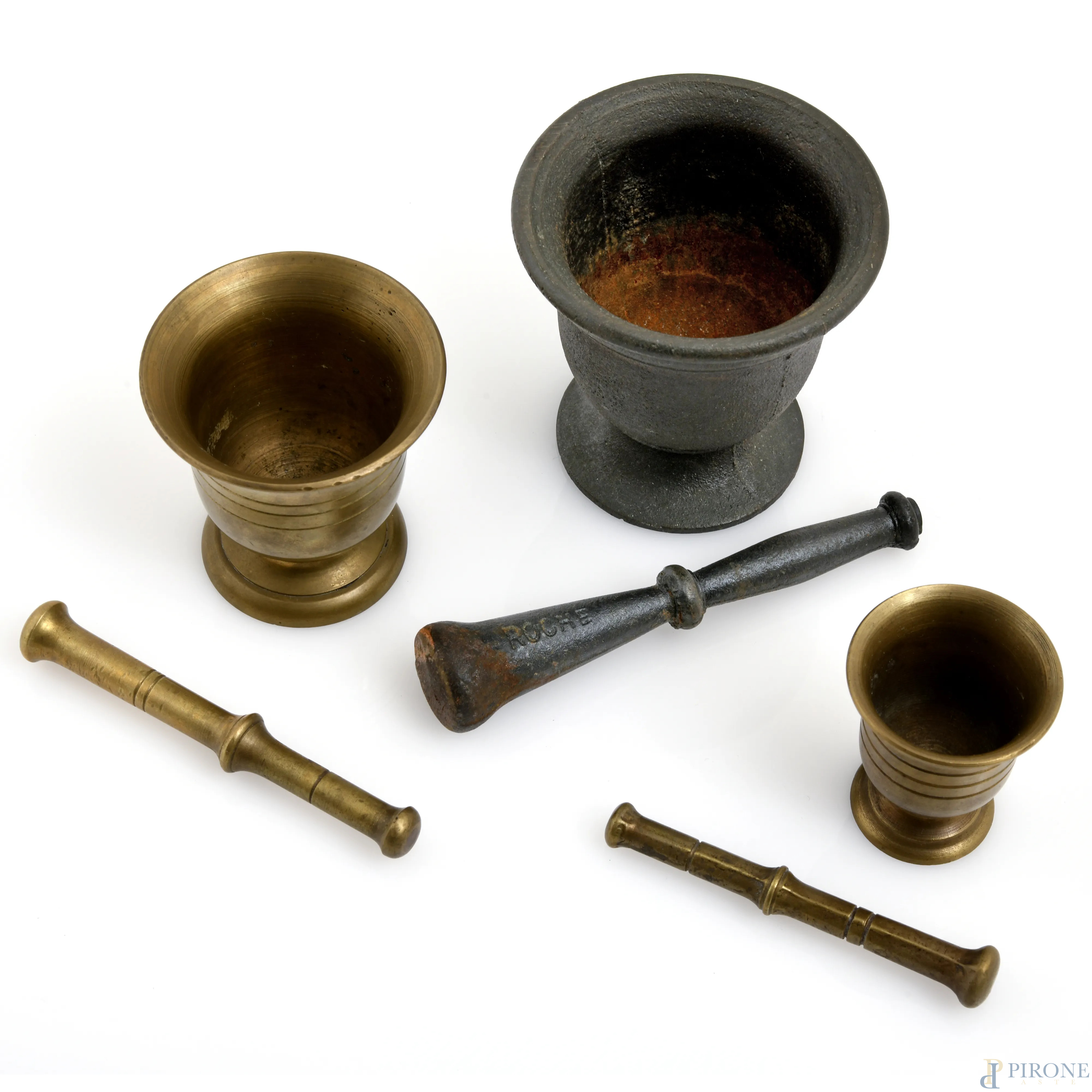 Lotto di tre mortai in ottone e bronzo, XX secolo, altezza massima cm 7,5, (segni di usura)