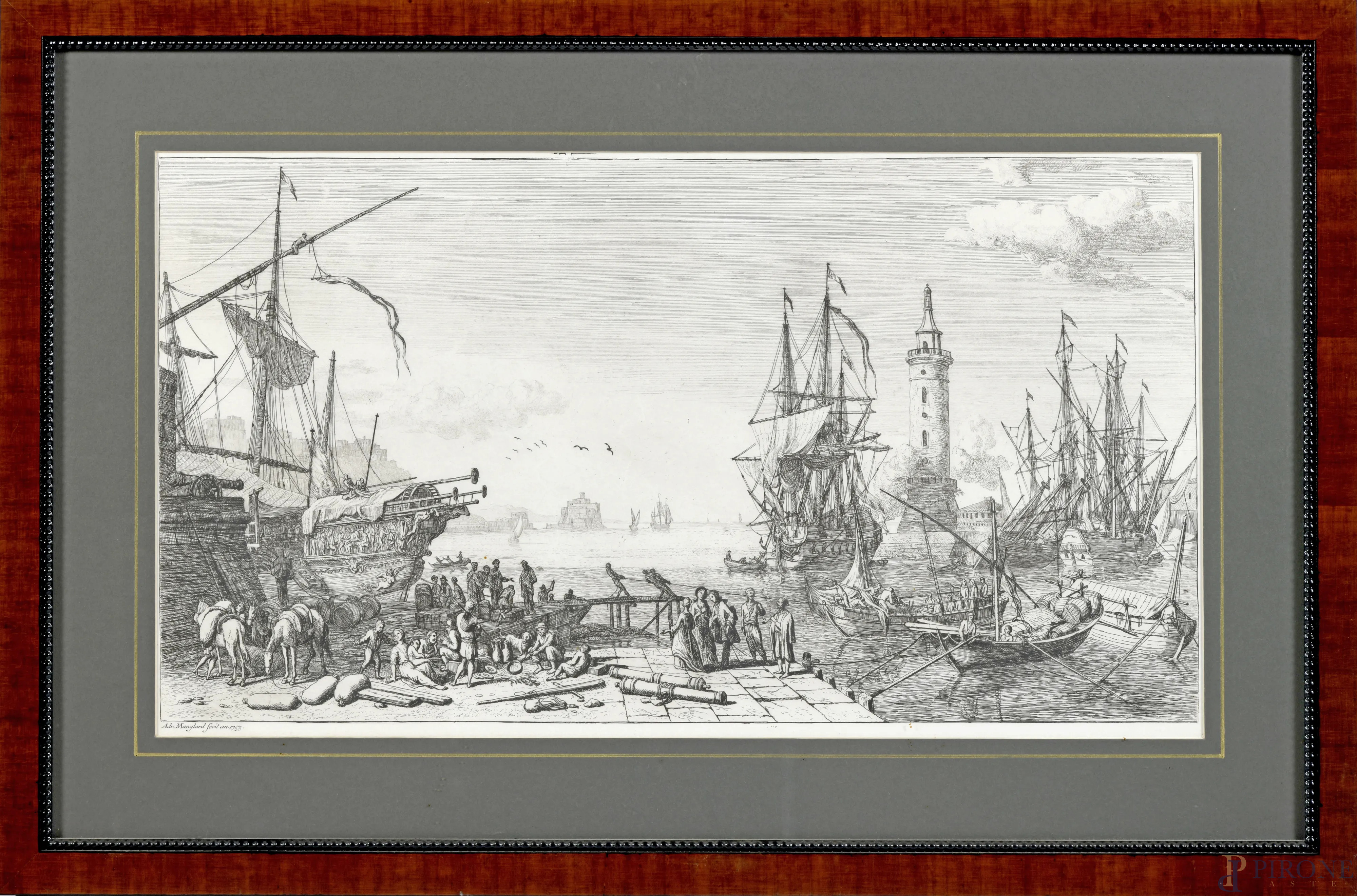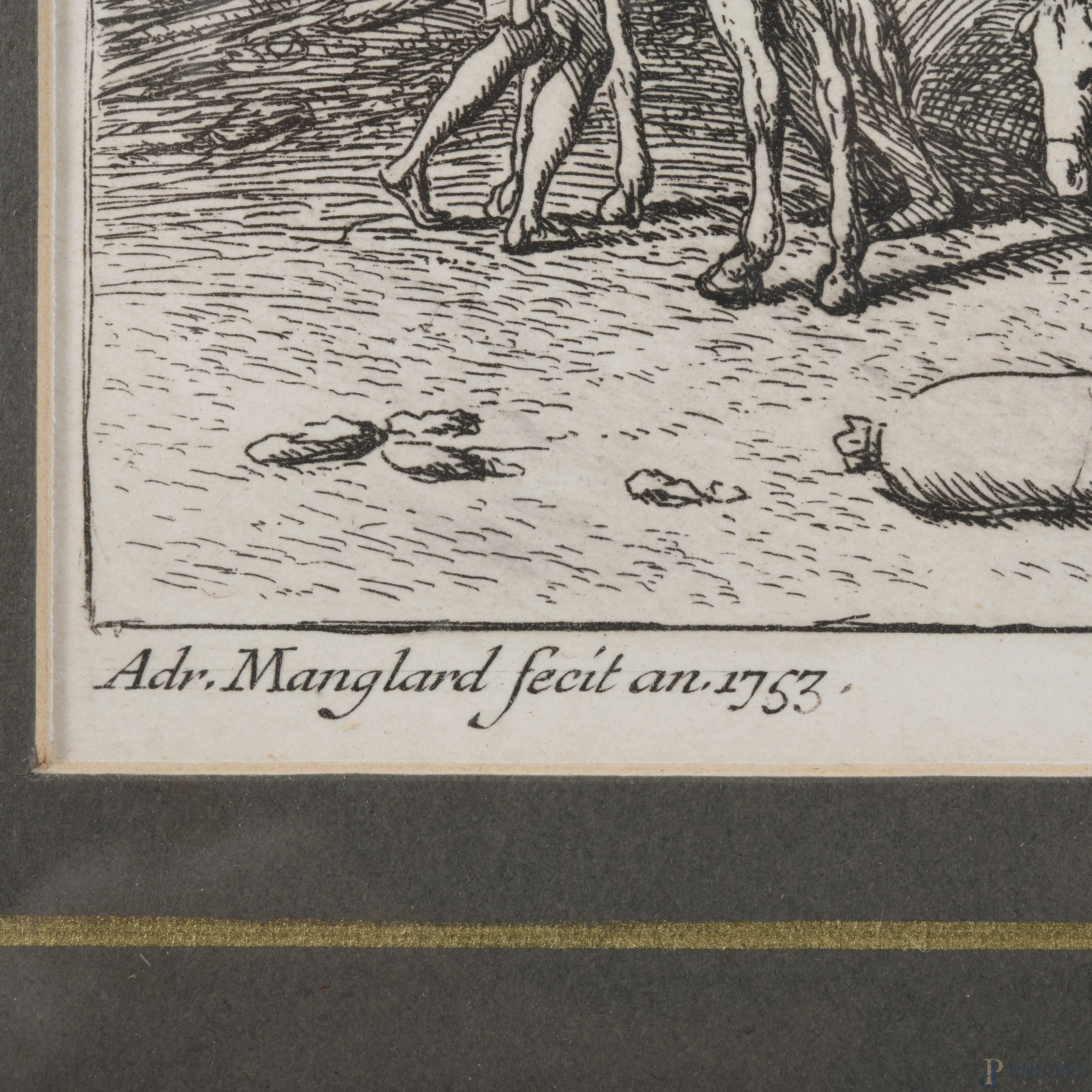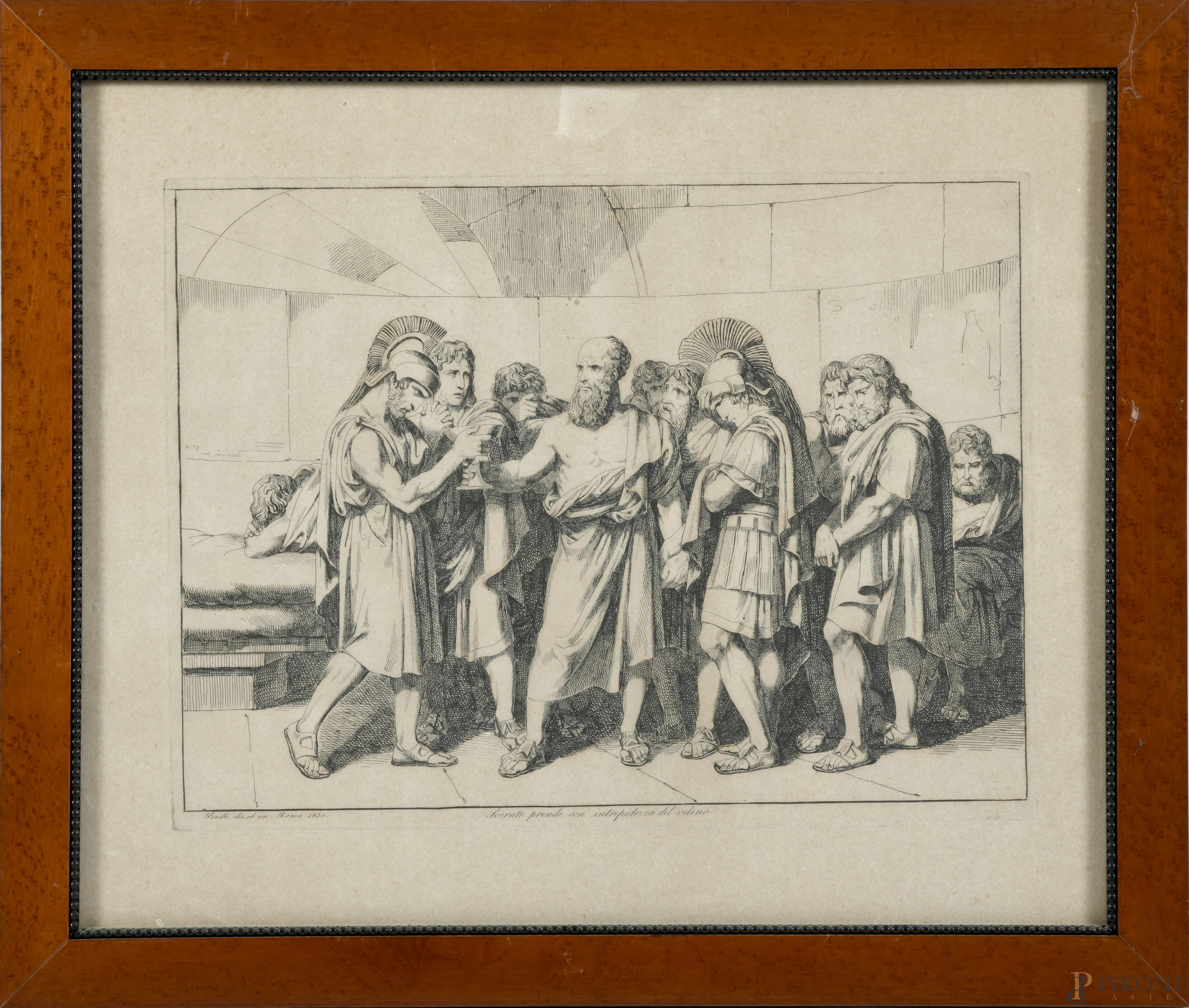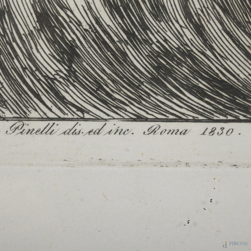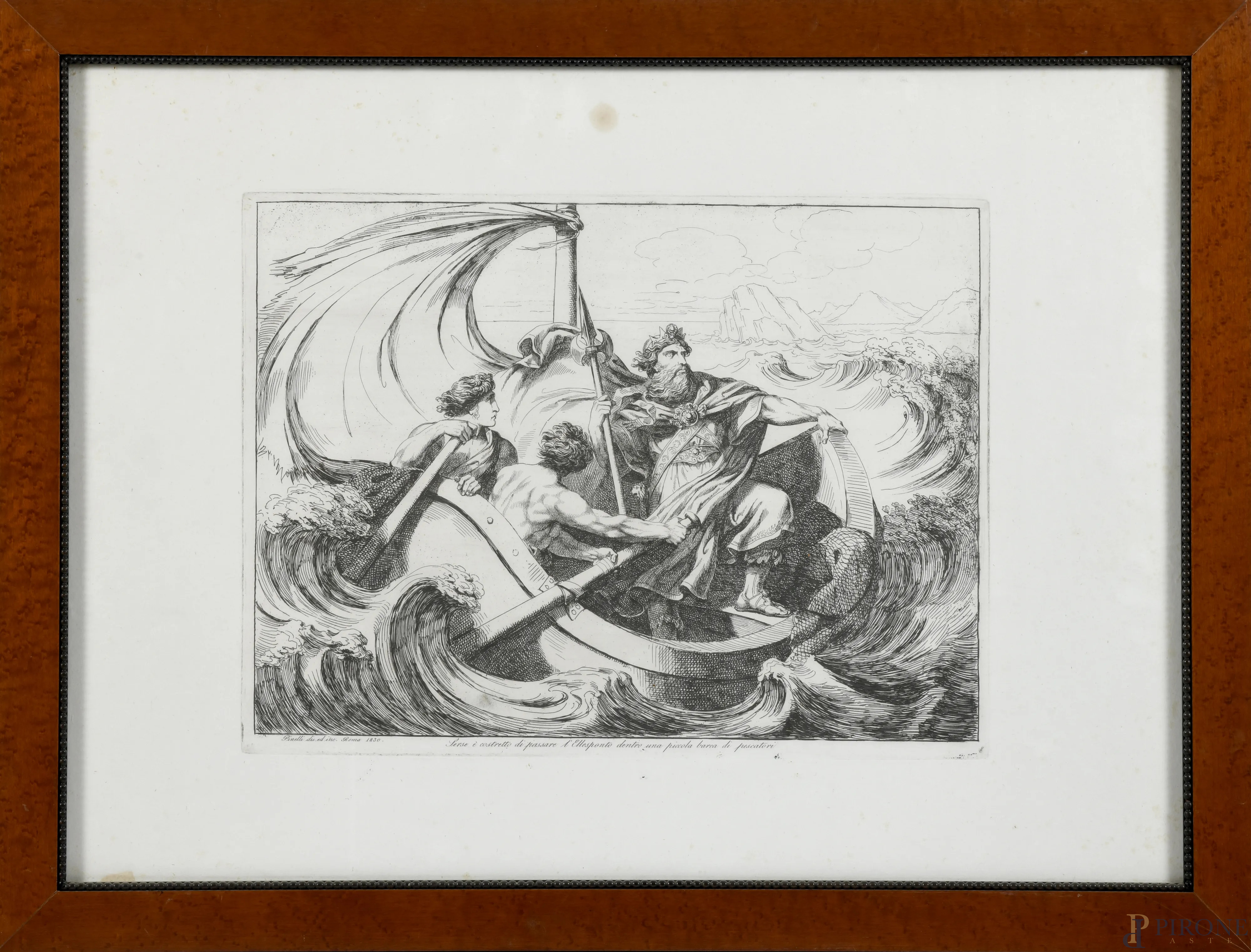 Lotto di tre stampe a soggetto vario, XX secolo, misure massime cm 47x64, entro cornice, (tracce di umidità, foxing, piegatura, difetti)