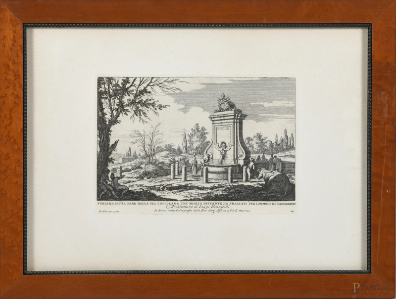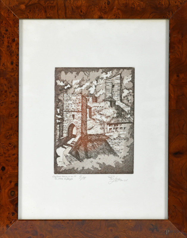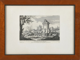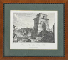 Lotto di tre stampe con vedute, XX secolo, misure massime cm 35x49, entro cornice, (tracce di umidità, foxing, difetti)