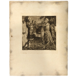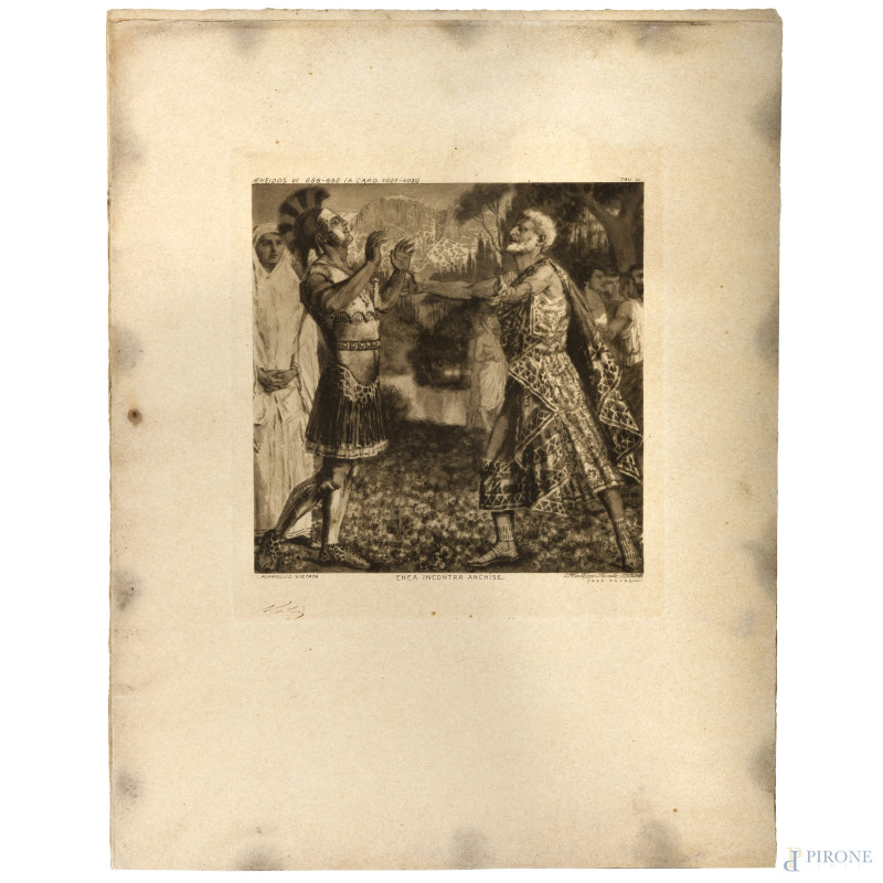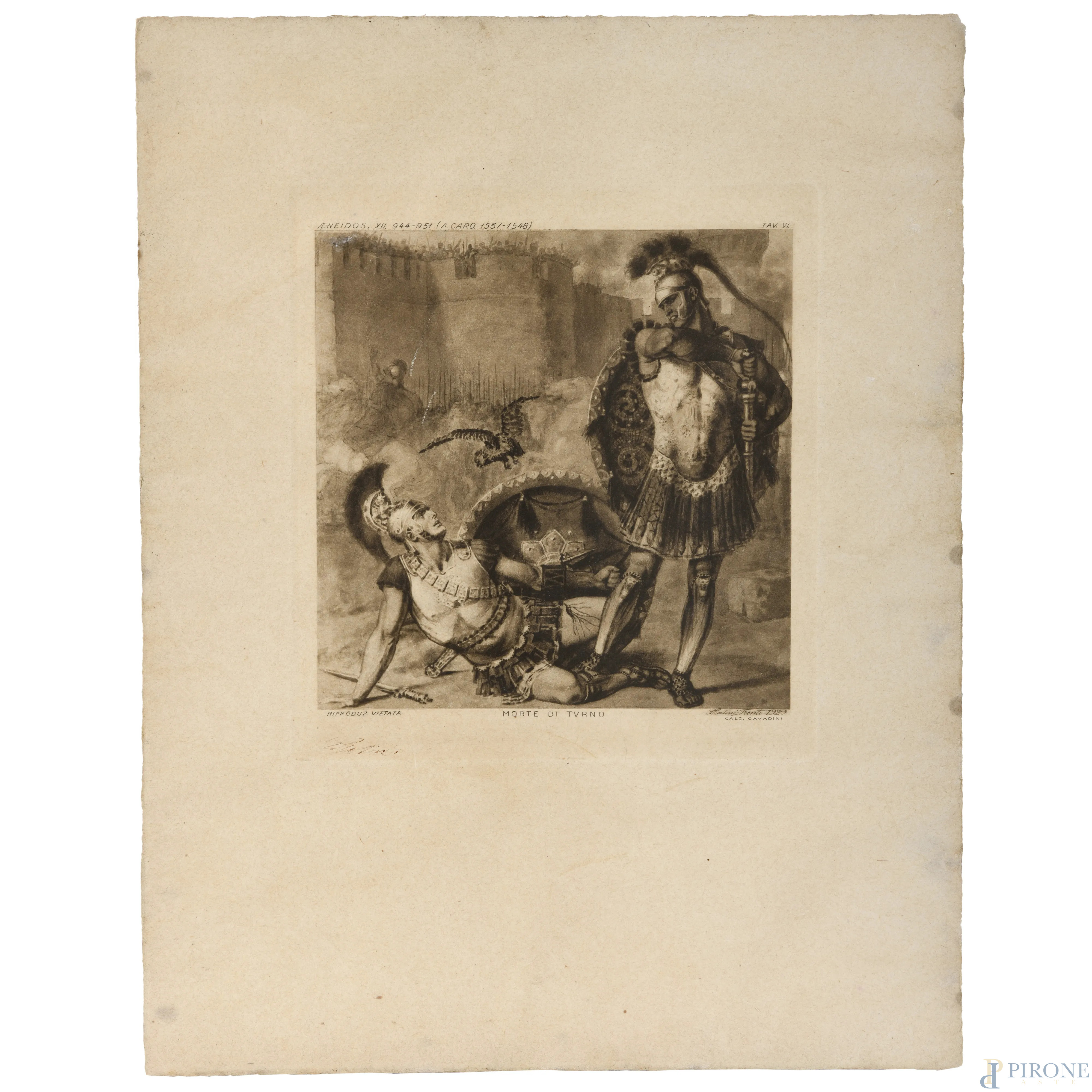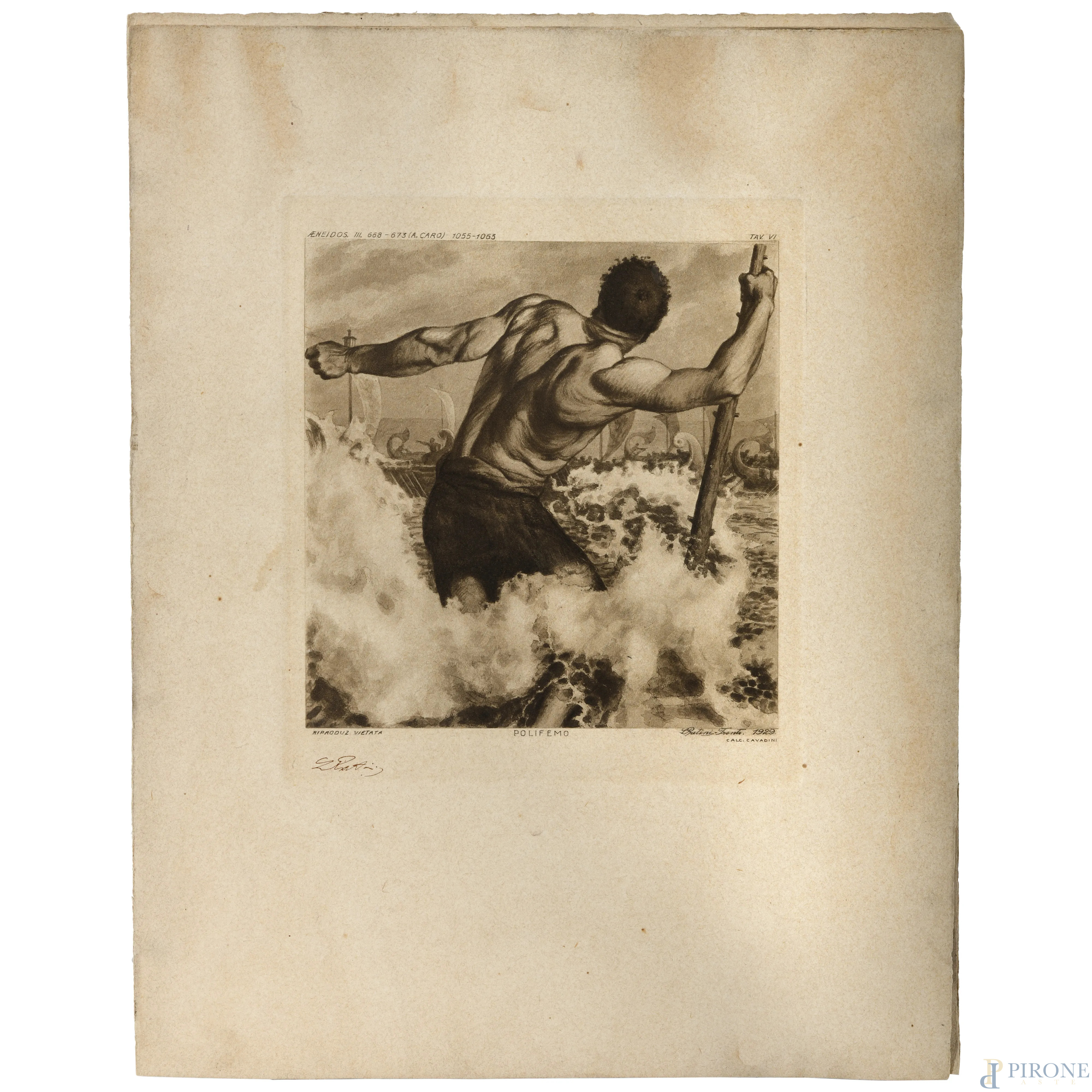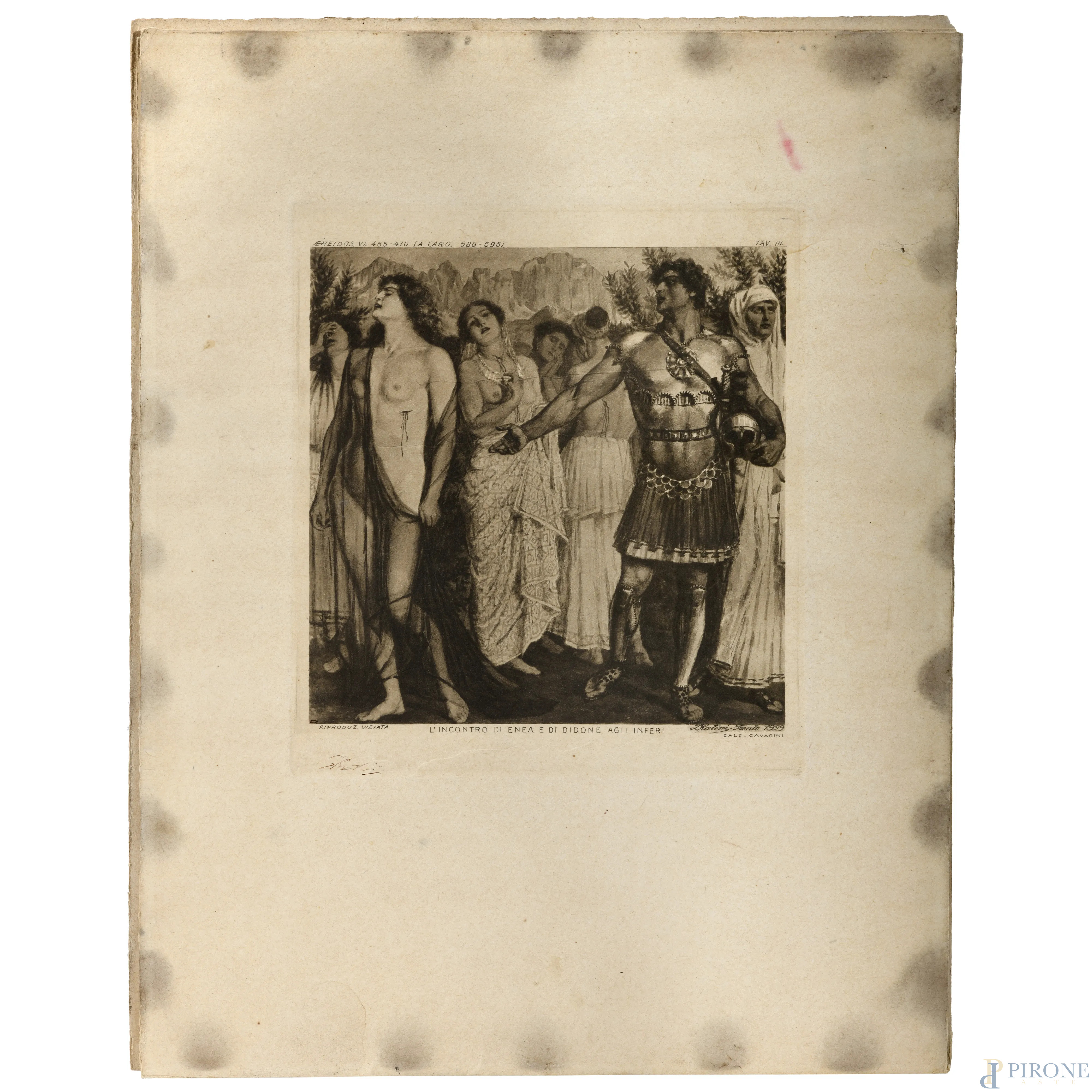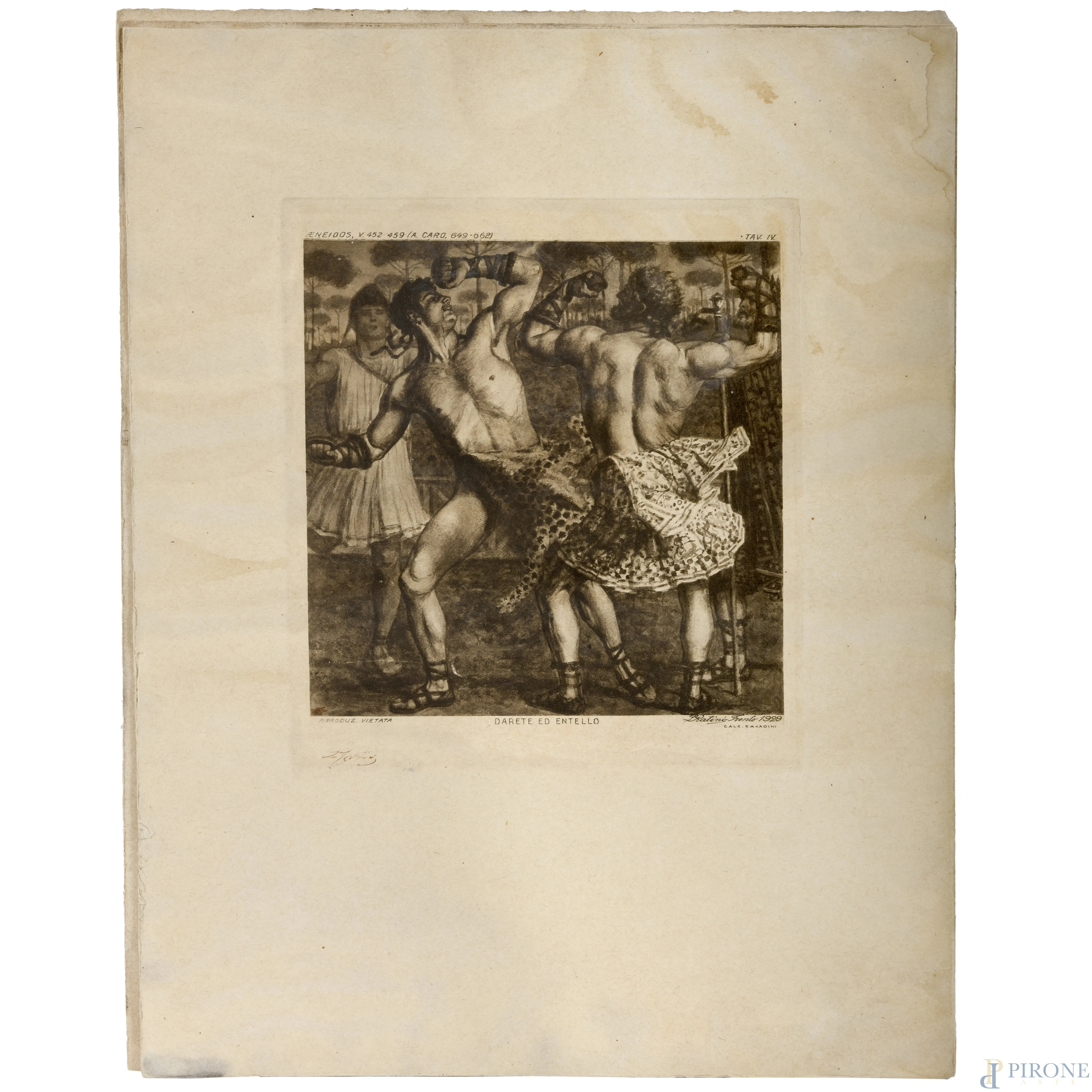 Luigi Ratini (1880-1934), Lotto di cinque acqueforti raffiguranti scene epico-mitologiche, cm 36x28, (segni di usura, foxing, piegature, strappi, tracce di usura)