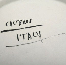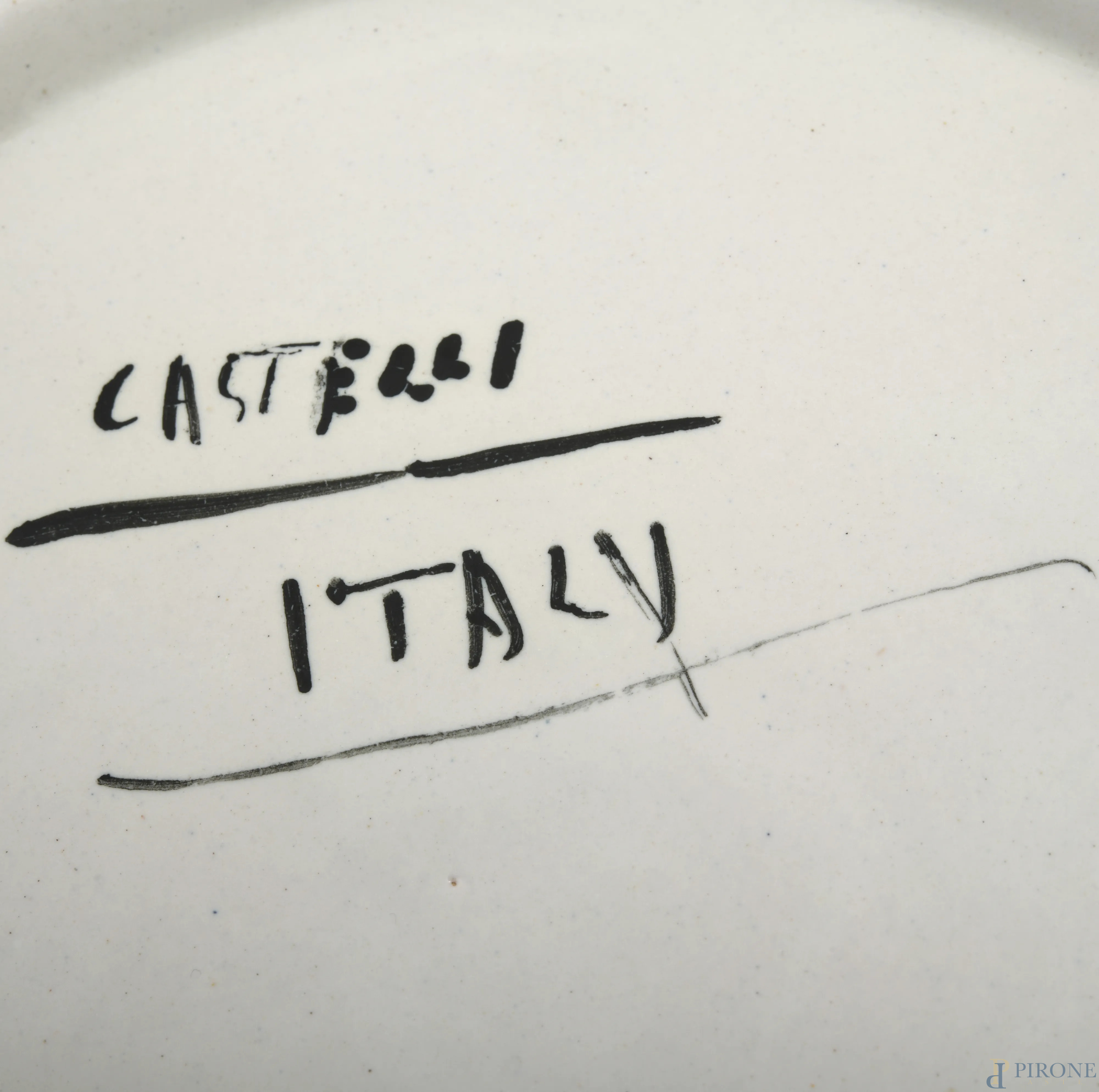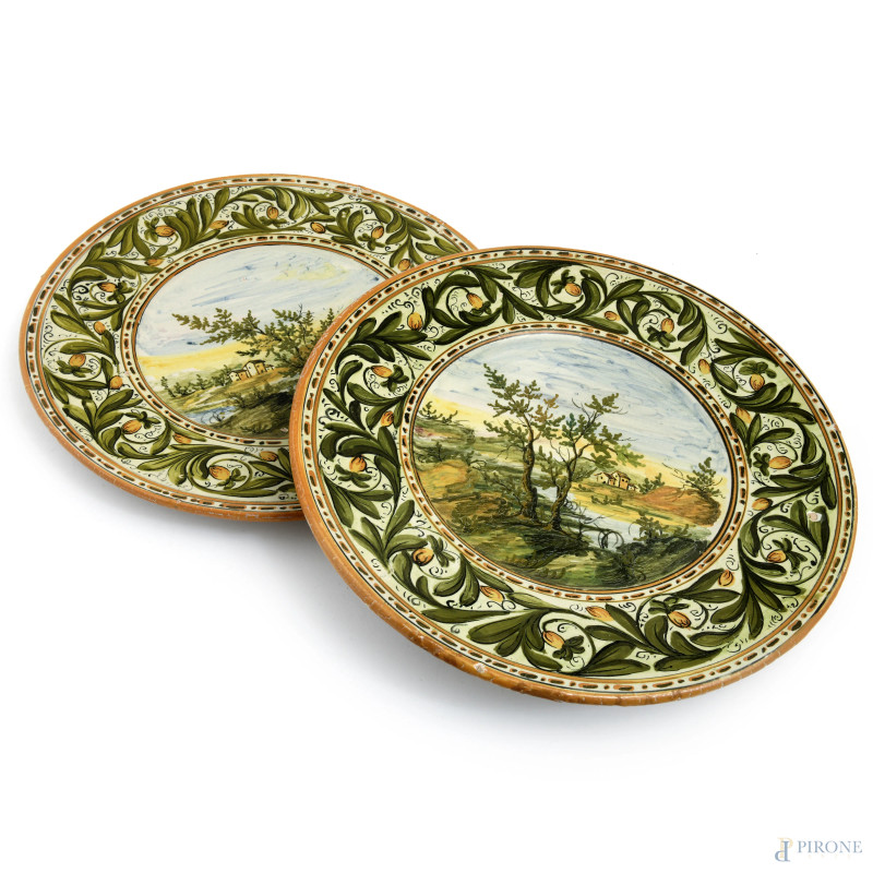 Manifattura Castelli, Coppia di piatti in maiolica con scene di paesaggio entro cornice dipinta di frutta e volute,, XX secolo, diametro cm 32, (segni di usura, scalfiture, cadute di smalto, difetti di cottura)