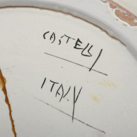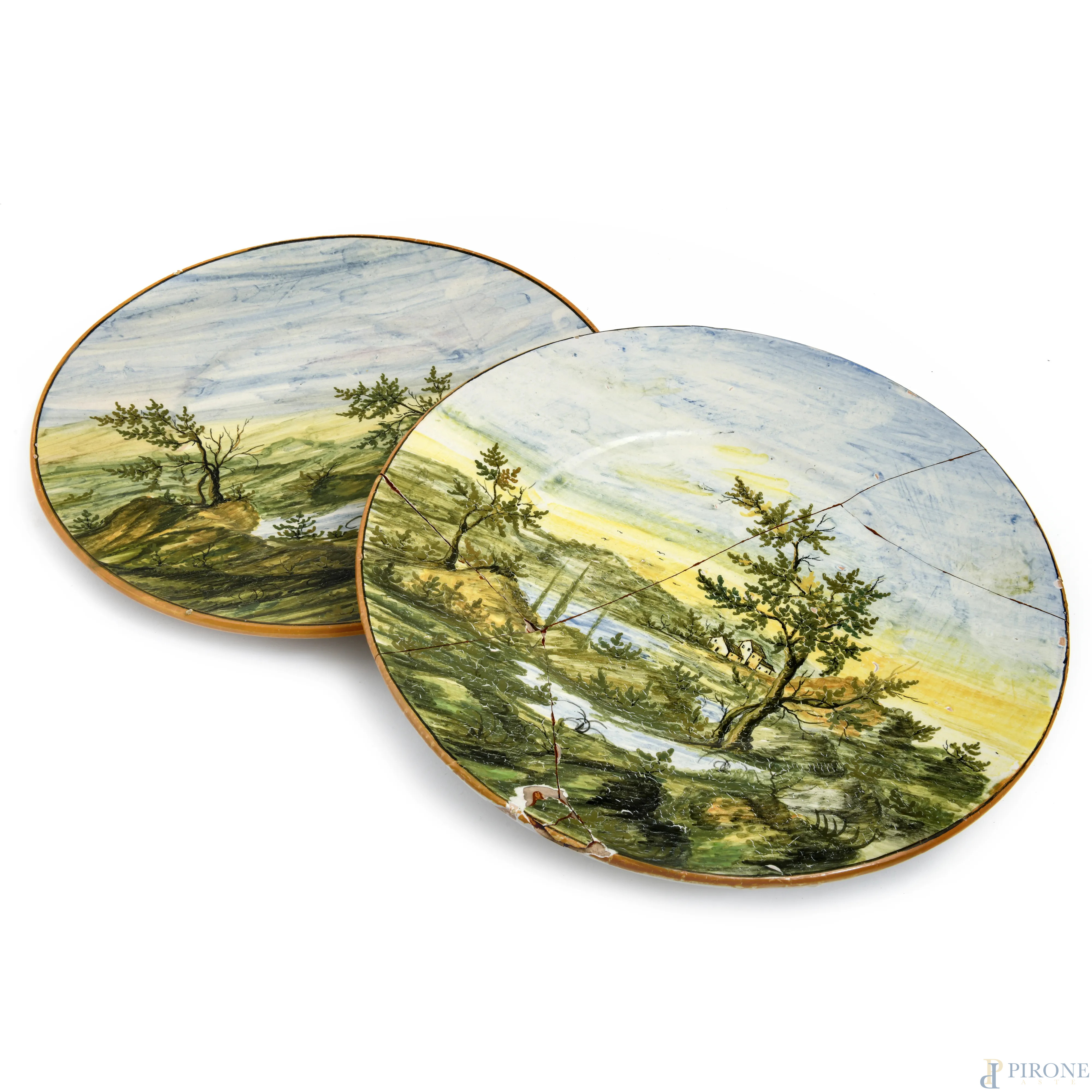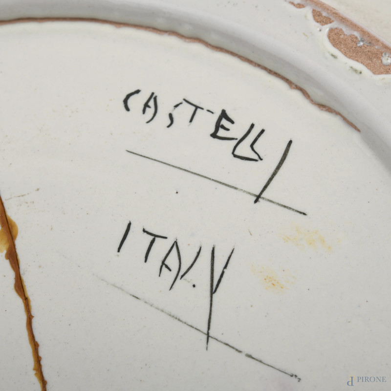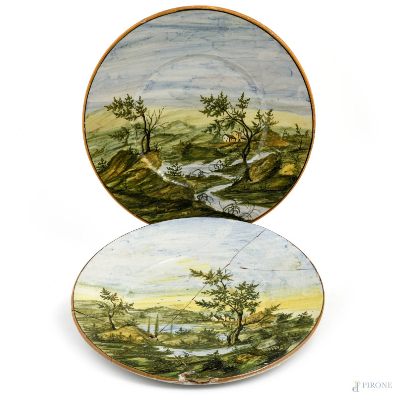 Manifattura Castelli, Coppia di piatti in maiolica con scene di paesaggio, XX secolo, diametro cm 32, (rotture, restauri, segni di usura, scalfiture, cadute di smalto, difetti di cottura)