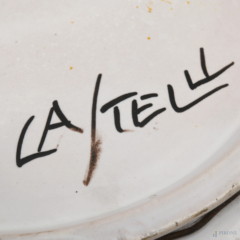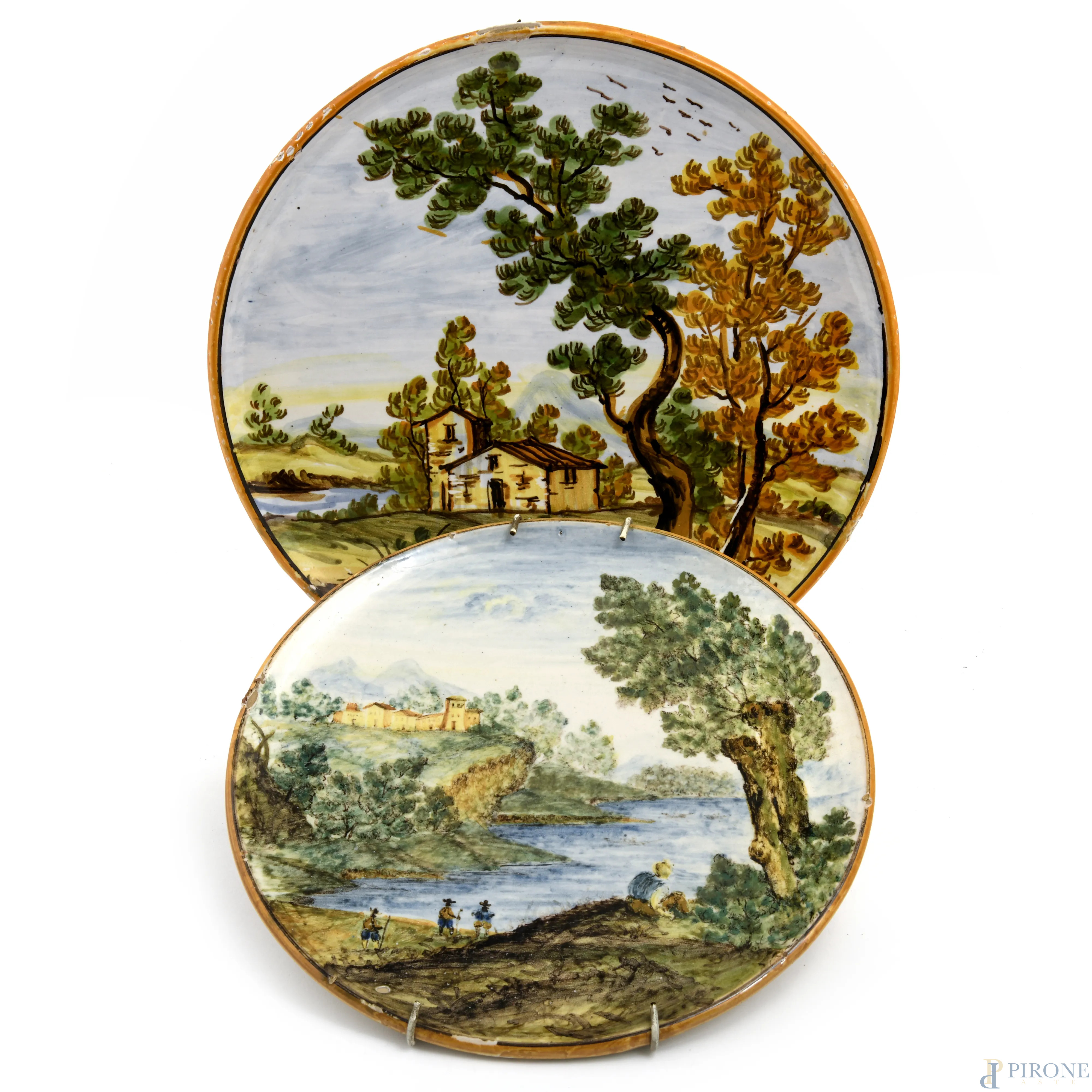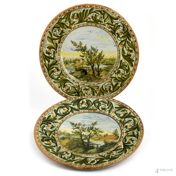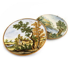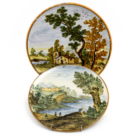 Manifattura Castelli, Lotto di due di piatti in maiolica con scene di paesaggio, XX secolo, diametro massimo cm 24, (segni di usura, scalfiture, cadute di smalto, difetti di cottura)
