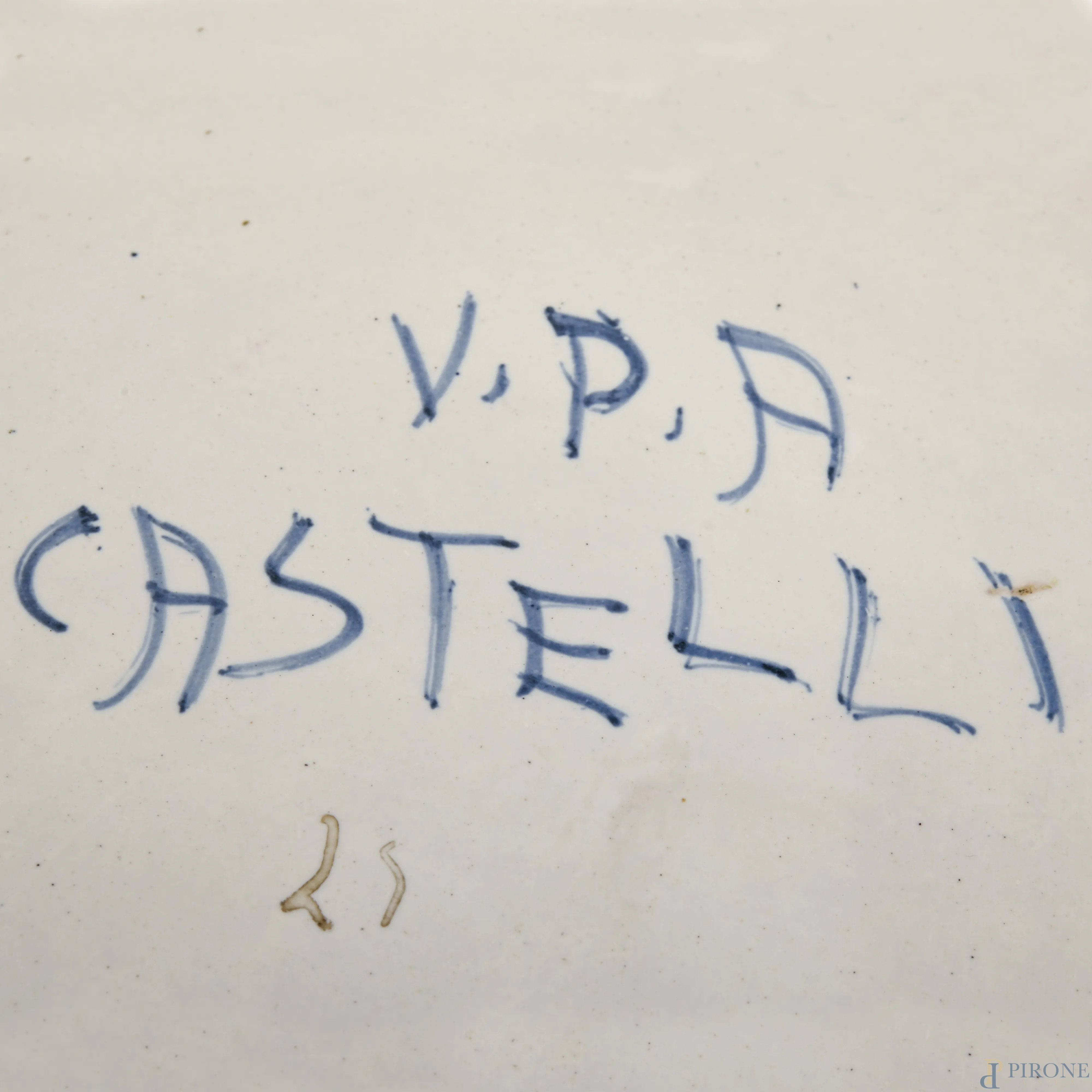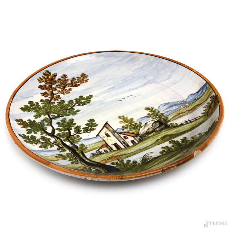 Manifattura Castelli, Piatto in maiolica con scene di paesaggio, XX secolo, diametro cm 33,5, (rotture, segni di usura, scalfiture, cadute di smalto, difetti di cottura)