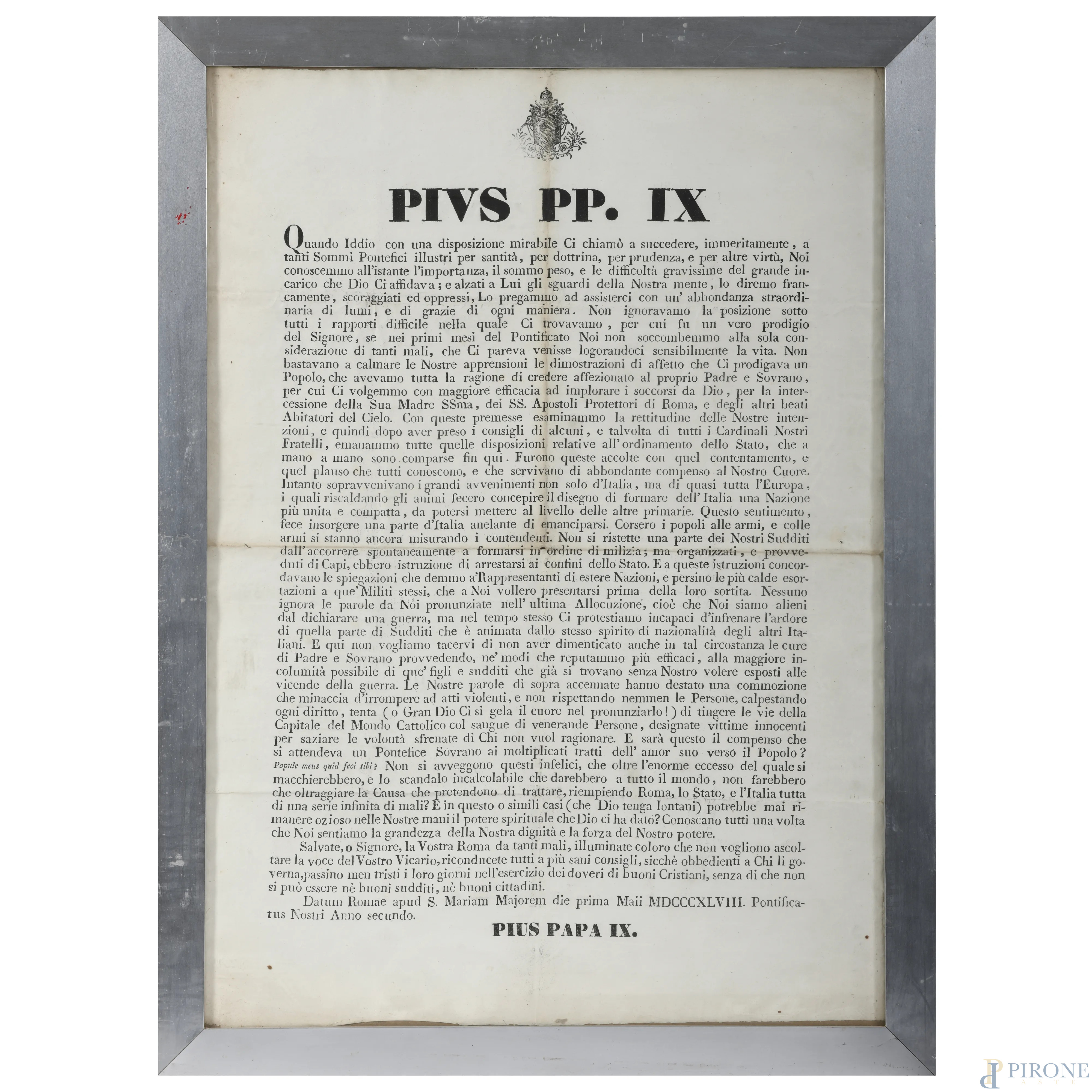 Manifesto PIUS PAPA IX, 1848, cm 68x48, entro cornice, (bruniture, tracce di umidità, segni di piegatura, piccole lacerazioni)