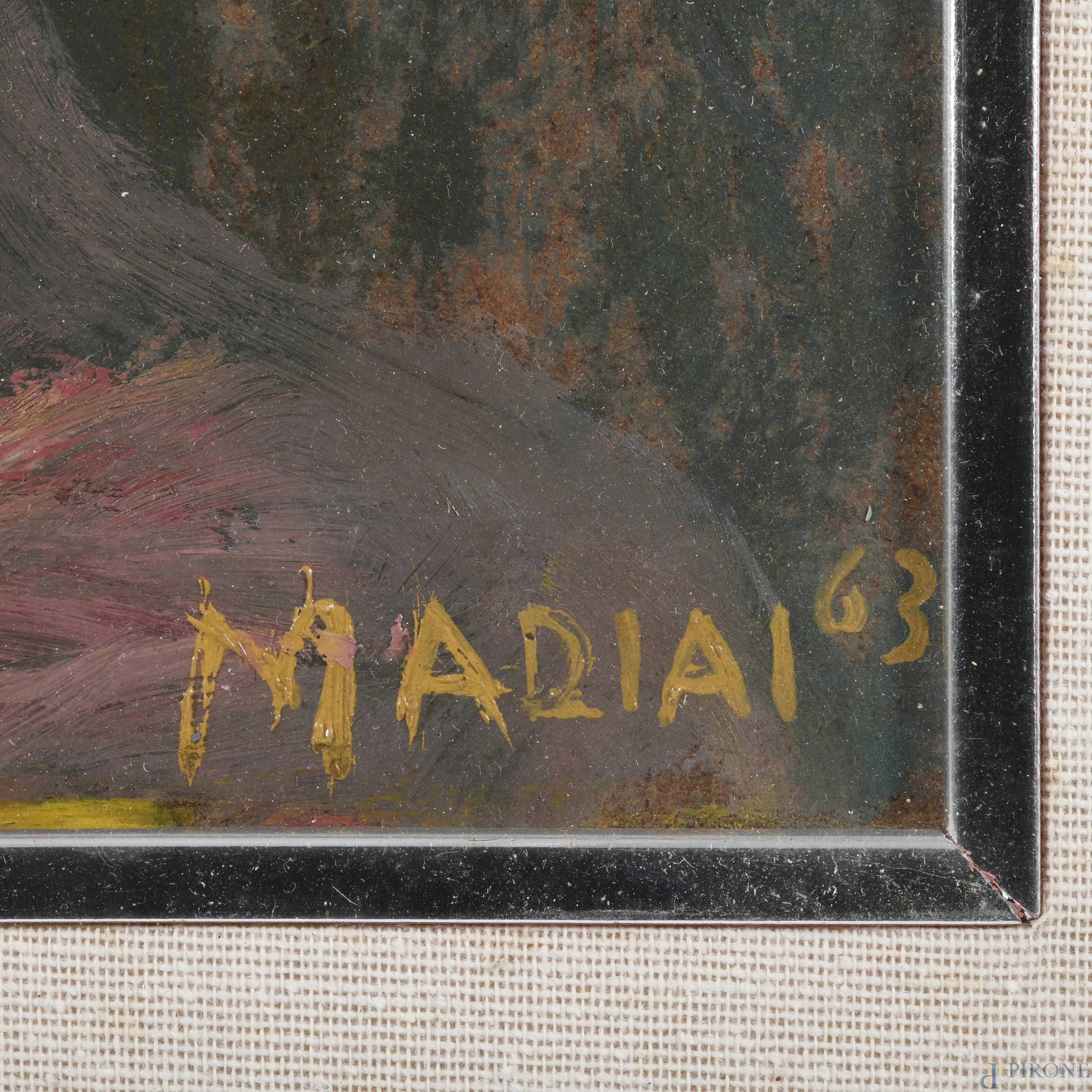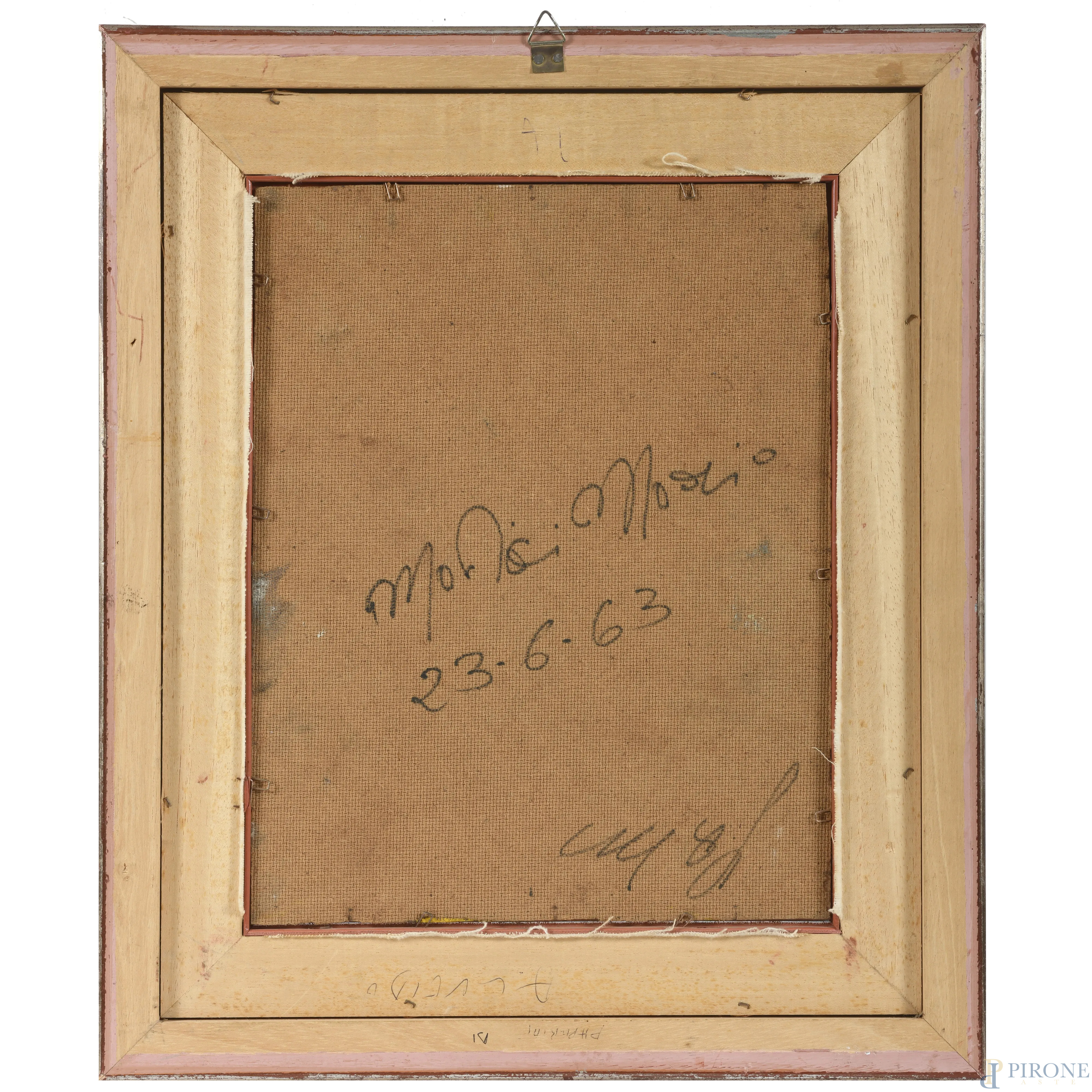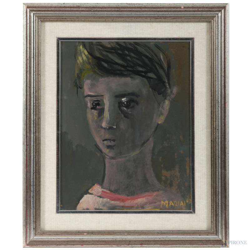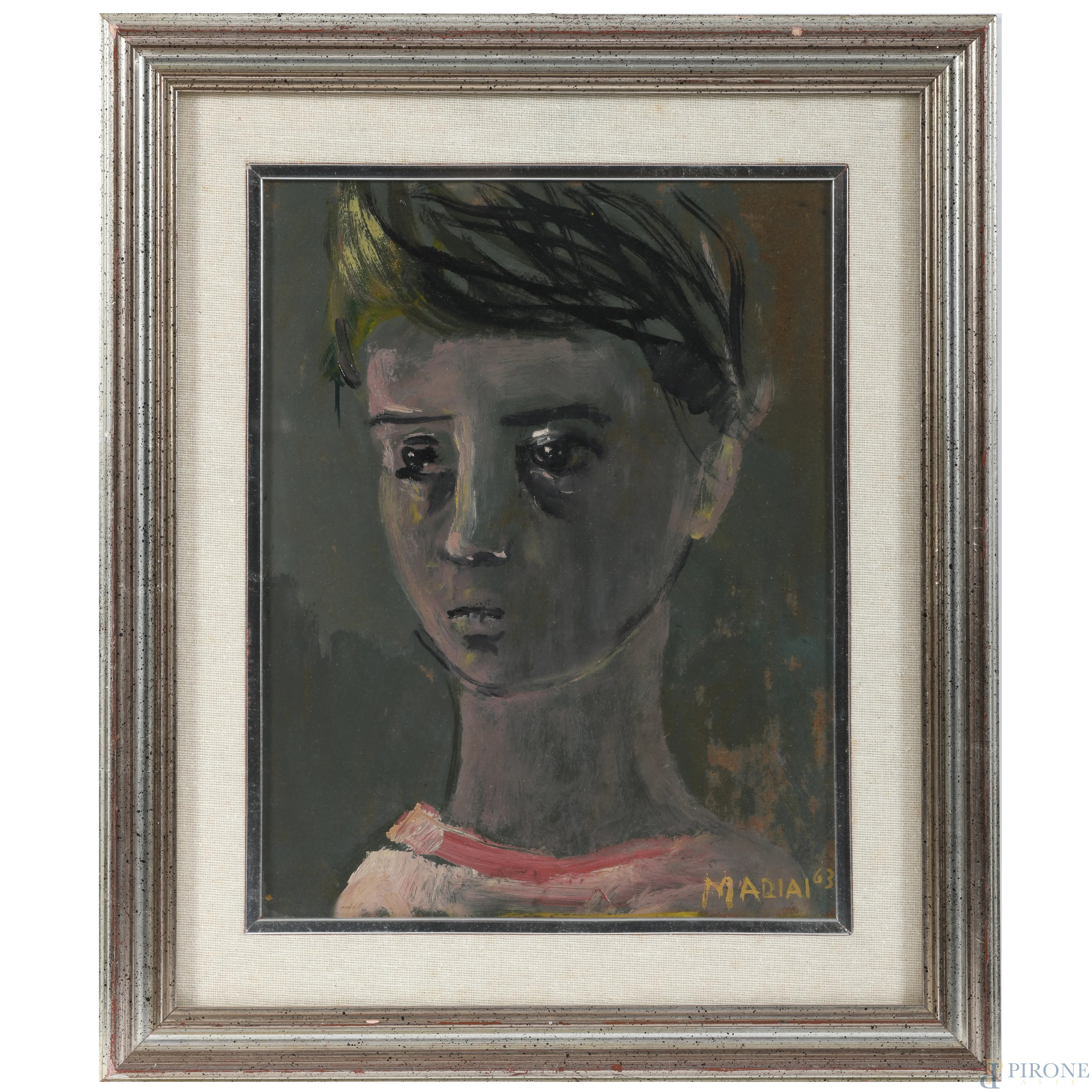 Mario Madiai (1944), Volto di fanciullo, olio su faesite, cm 33x25,5, firmato e datato "63" in basso a destra e al retro, entro cornice