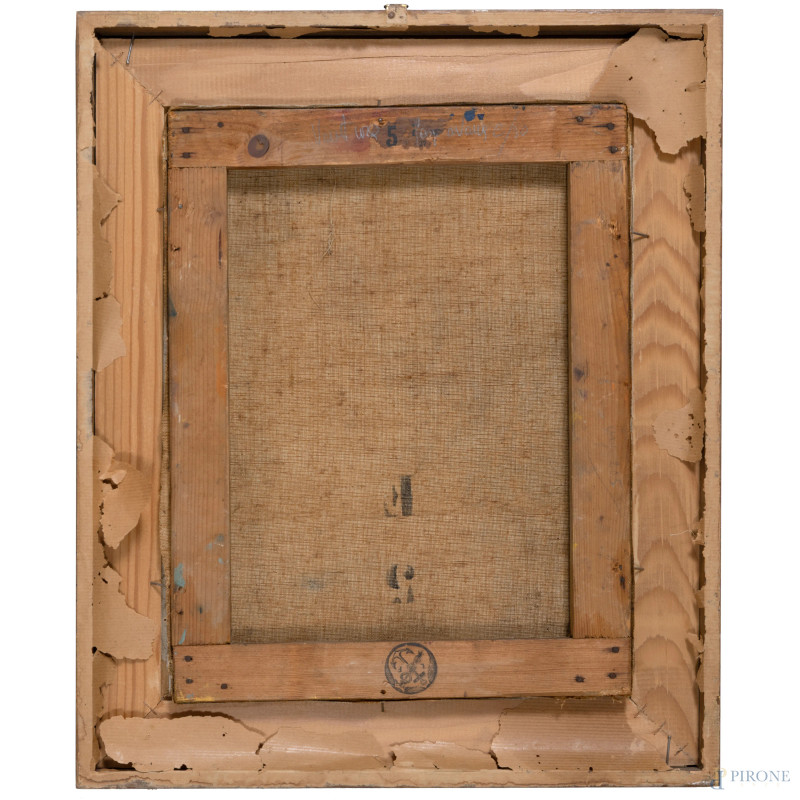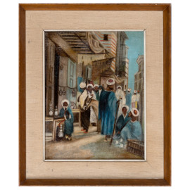 Mercato arabo, XX secolo, olio su tela, cm 35x27,5, entro cornice, (piccole abrasioni e cadute di colore)