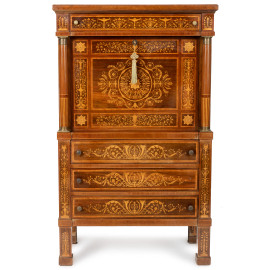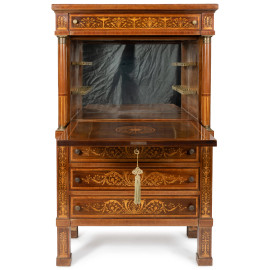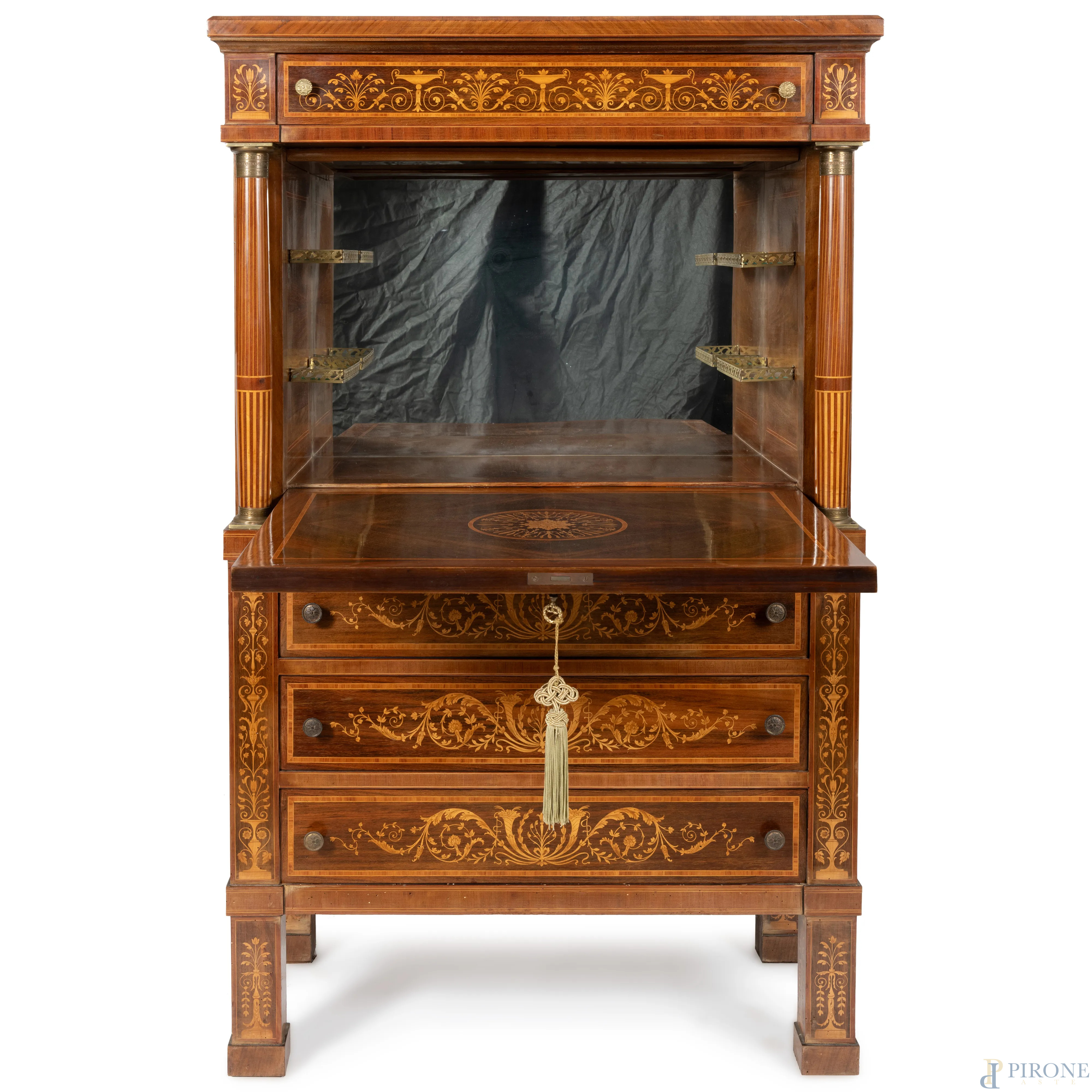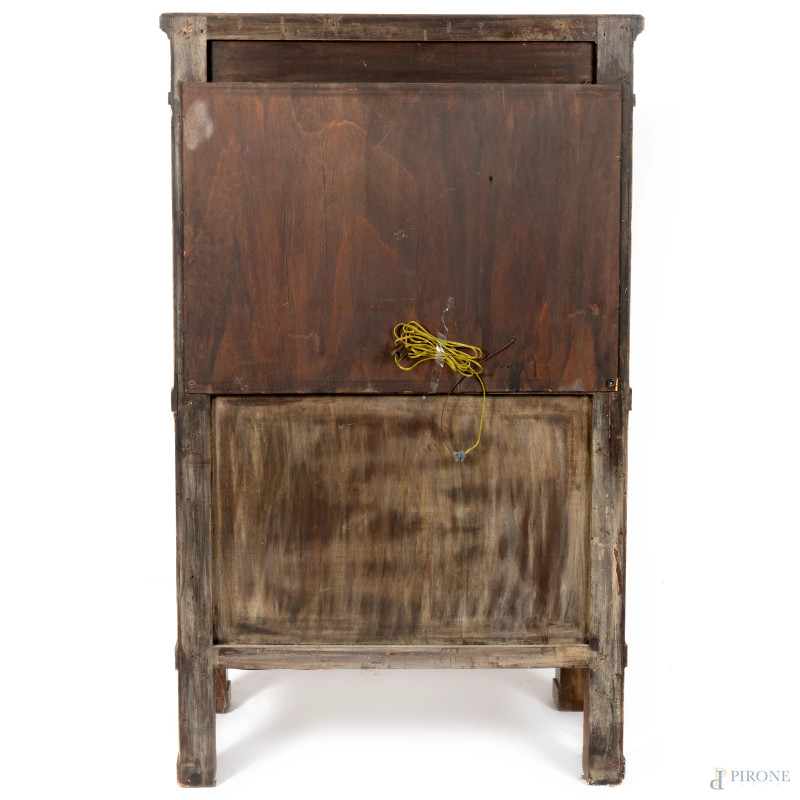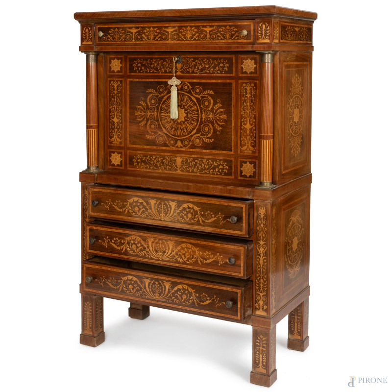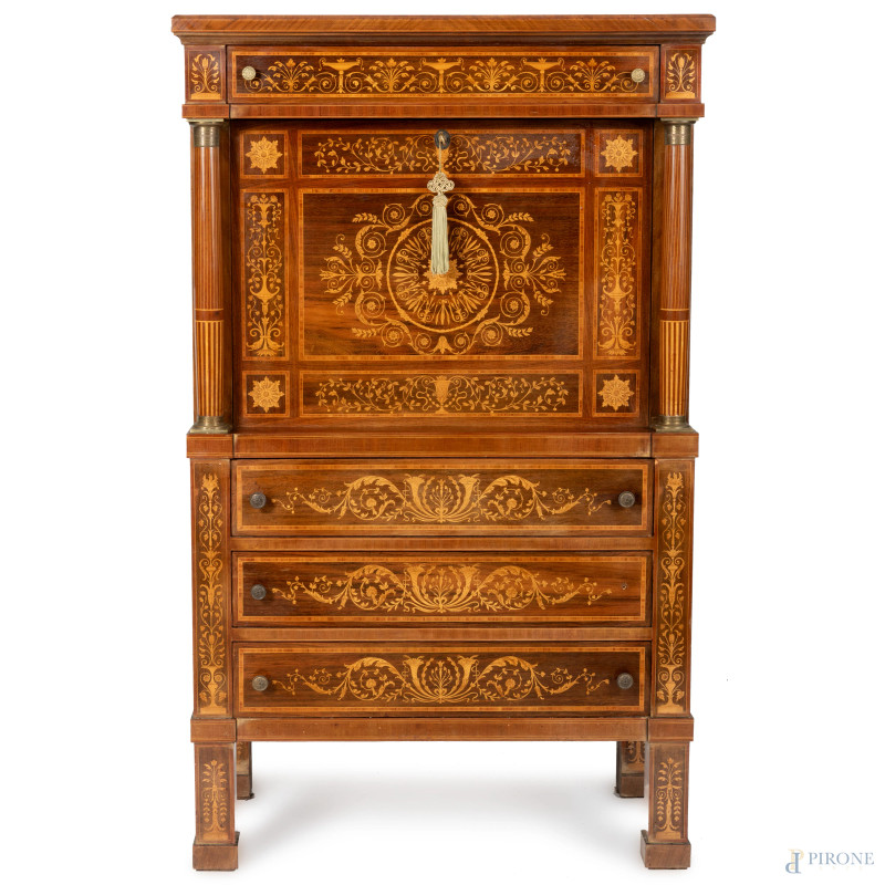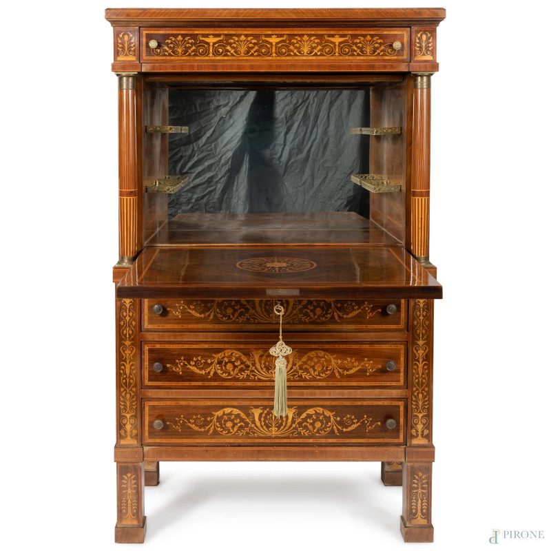 Mobile bar in legno impiallacciato e intarsiato a tre cassetti in colonna sormontati da sportello a ribalta celante vano bar specchiato, affiancato da due colonne e sormontato da un cassetto, XX secolo, cm 153x93x48,5, (segni di usura, graffi, scalfiture)