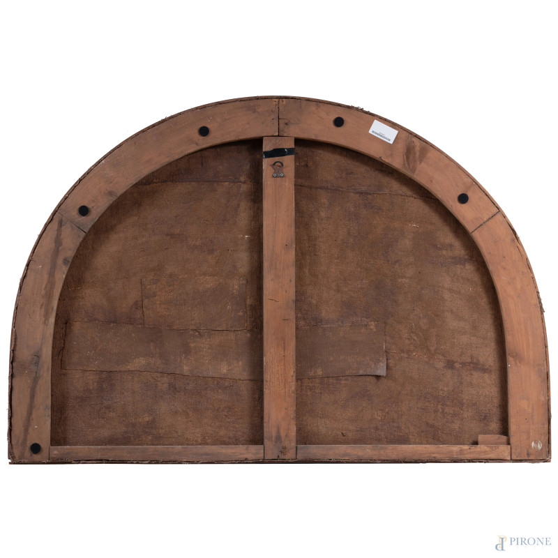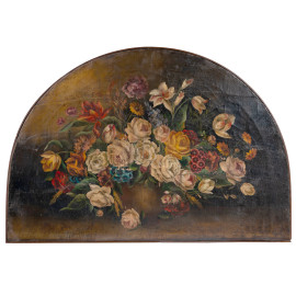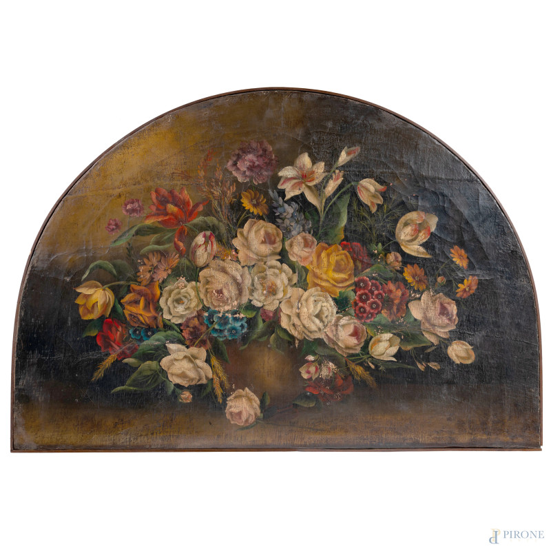 Natura morta con fiori, XX secolo, olio su tela centinata, cm 79x116, (segni di usura, craquelure, sollevamenti di colore, cadute di colore)