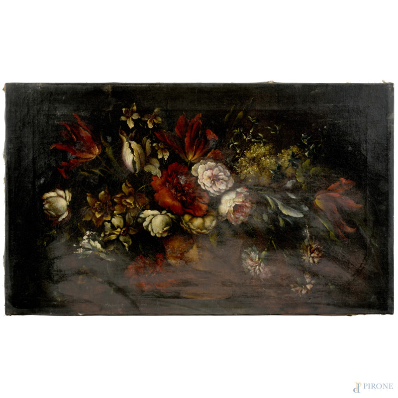 Natura morta di fiori, XX secolo, olio su tela, cm 48x80, (difetti, lacerazioni, piccole abrasioni, segni di battitura del telaio)