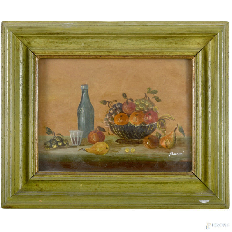Natura morta, XX secolo, olio su rame, cm 9x12, firmato in basso a destra, entro cornice