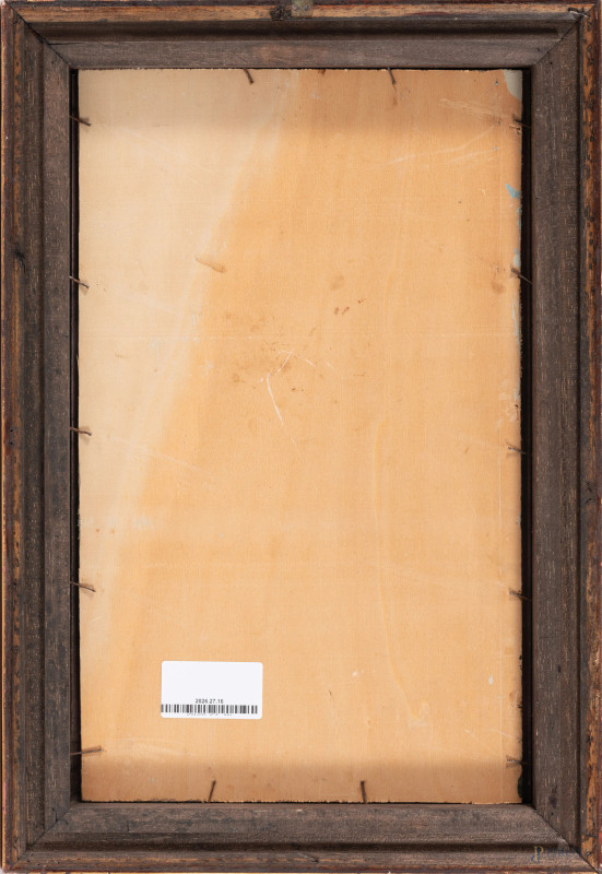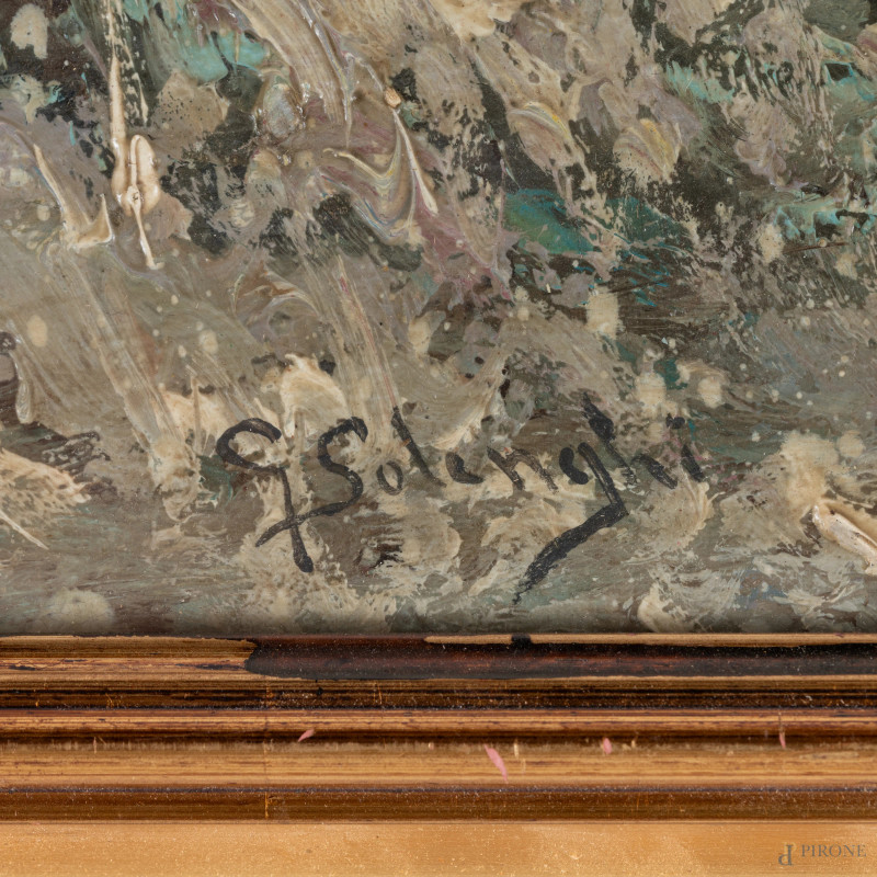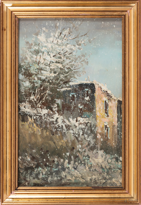 Nevicata, XX secolo, olio su compensato, cm 41x25,5, firmato in basso a destra, entro cornice