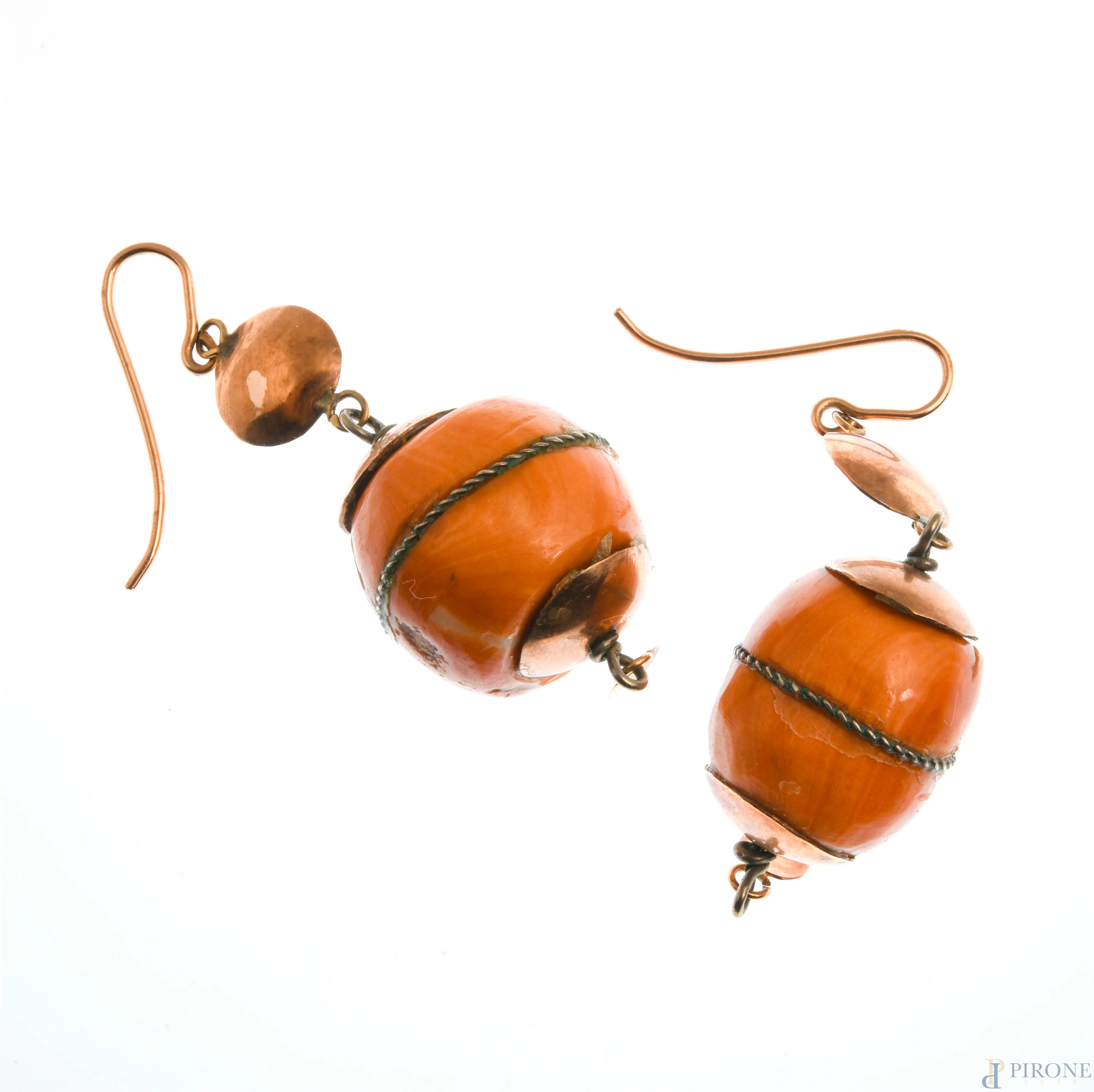 Orecchini in corallo di bambù e oro basso, XX secolo, cm 2,5x1,5, (segni di usura, piccole scalfiture)