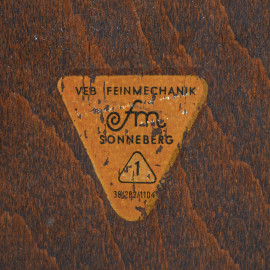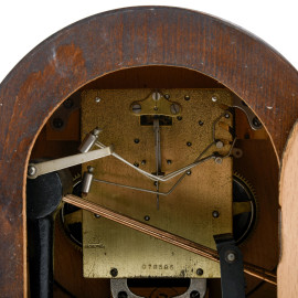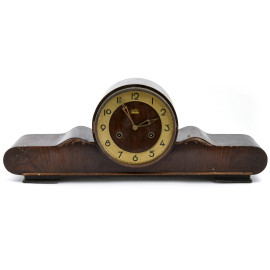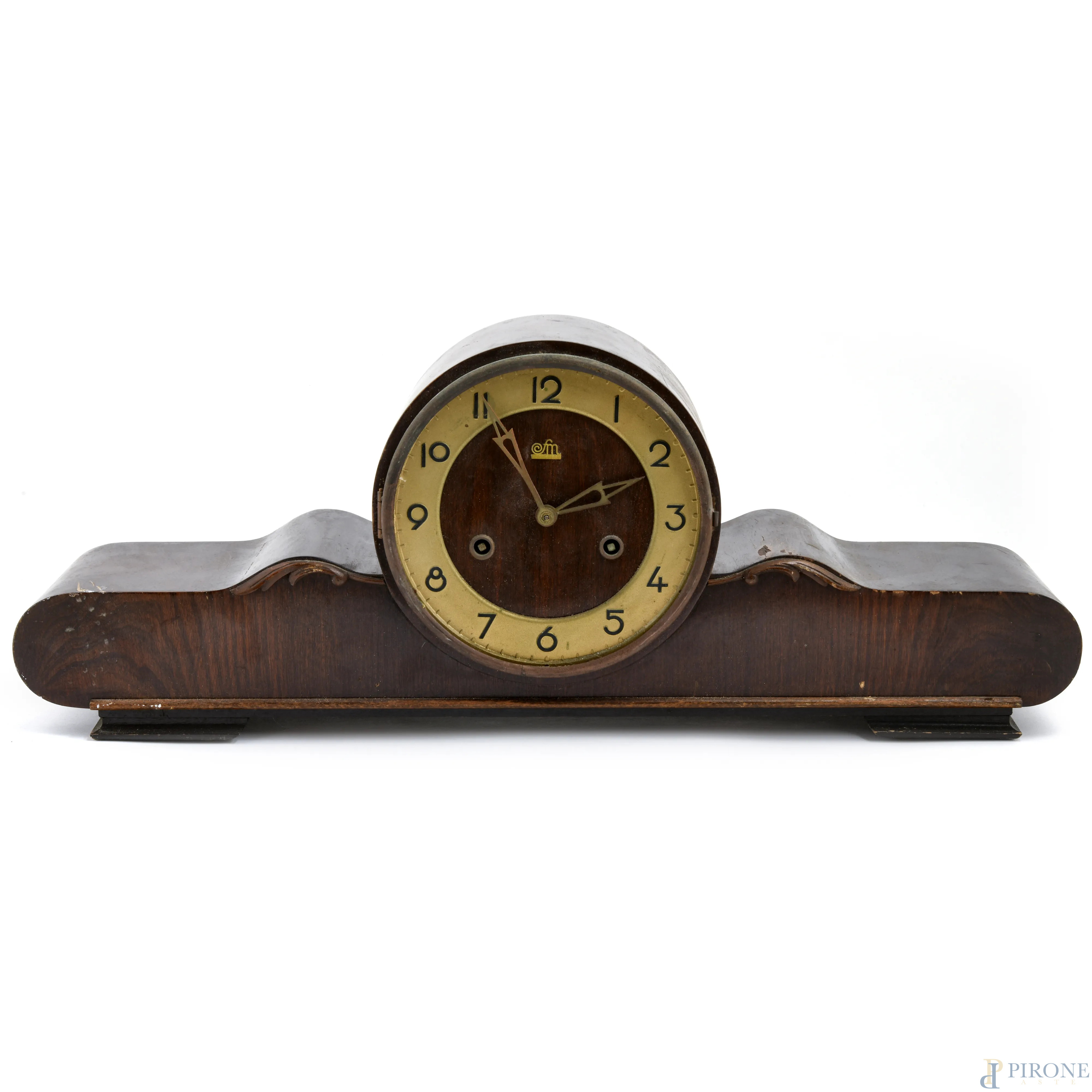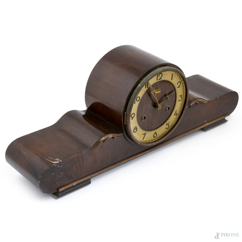 Orologio da camino in noce, FM Sonneberg, Germania, metà XX secolo, quadrante circolare a numeri arabi in metallo dorato, cm h 22,5x58x1 , (difetti, vetro mancante, meccanismo da revisionare)