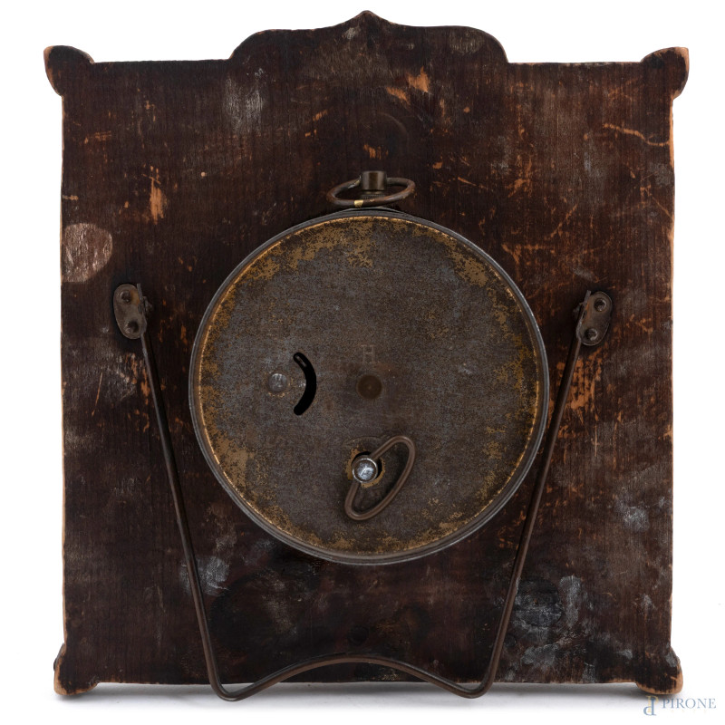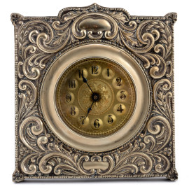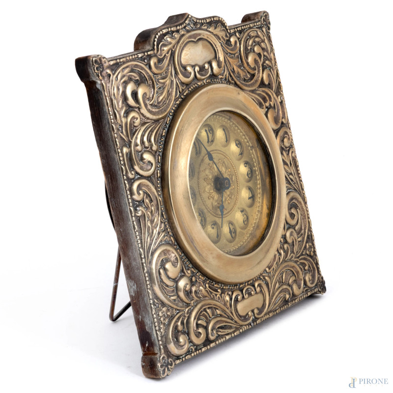 Orologio da tavolo con struttura in legno e cassa rivestita in Electro Plated Nichel Silver a rilievo con ricca decorazione a volute. Quadrante circolare in metallo dorato e numeri romani, cm 22x20, (segni di usura, da revisionare)
