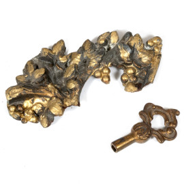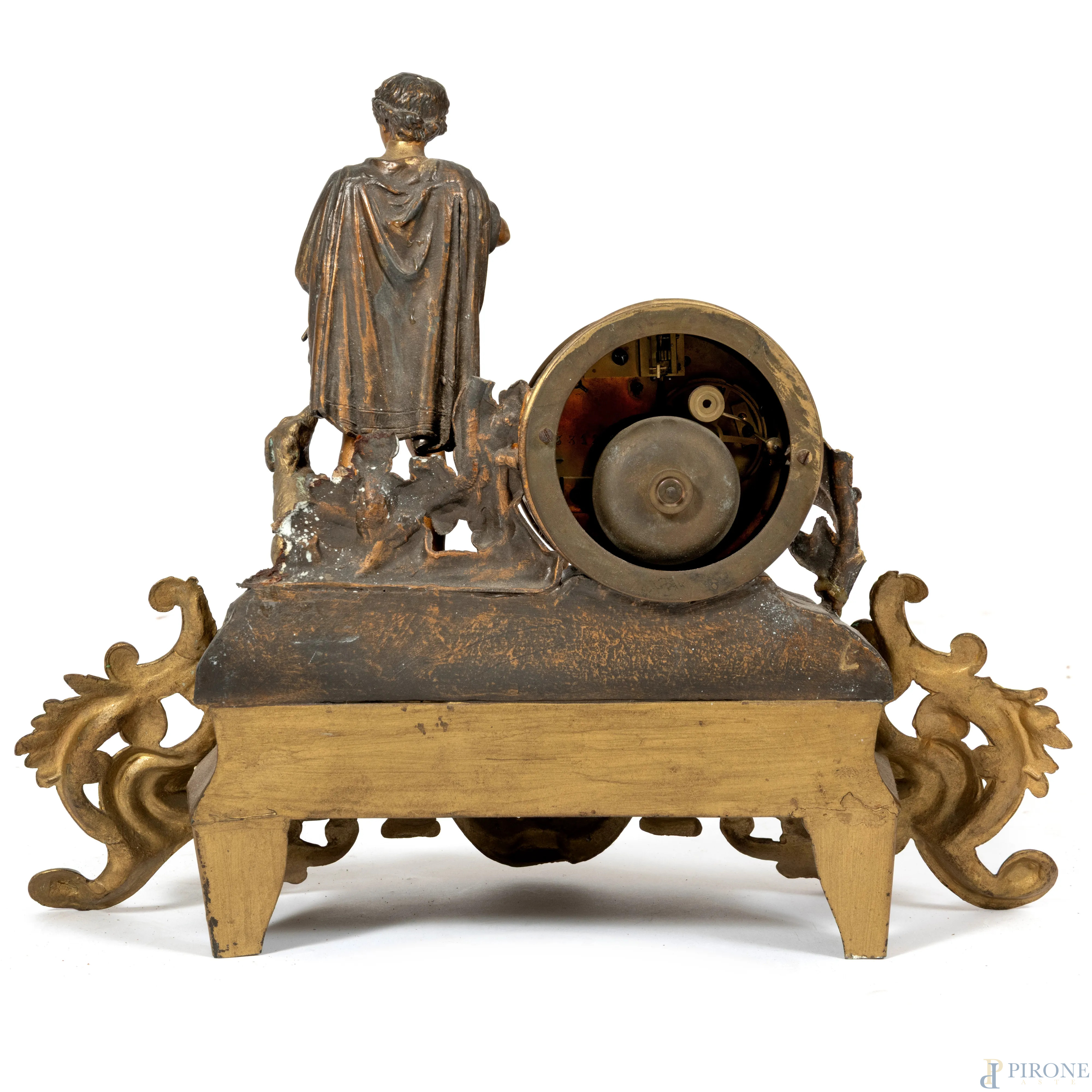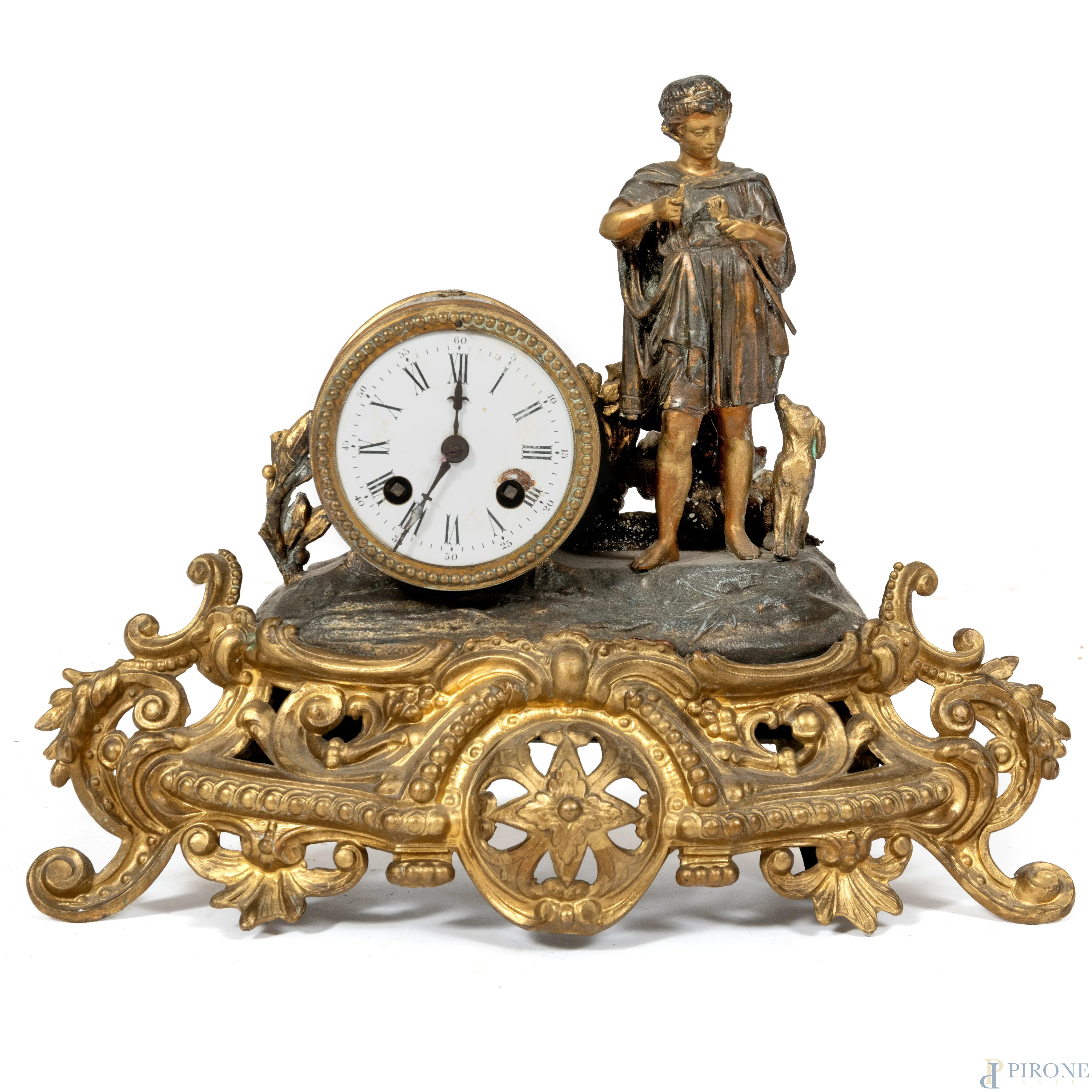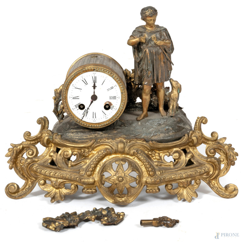 Orologio da tavolo in antimonio con quadrante circolare a numeri romani e cassa finemente cesellata affiancata da figura di fanciullo con cane. XX secolo, cm 29x36x13, (segni di usura, difetti, da revisionare)