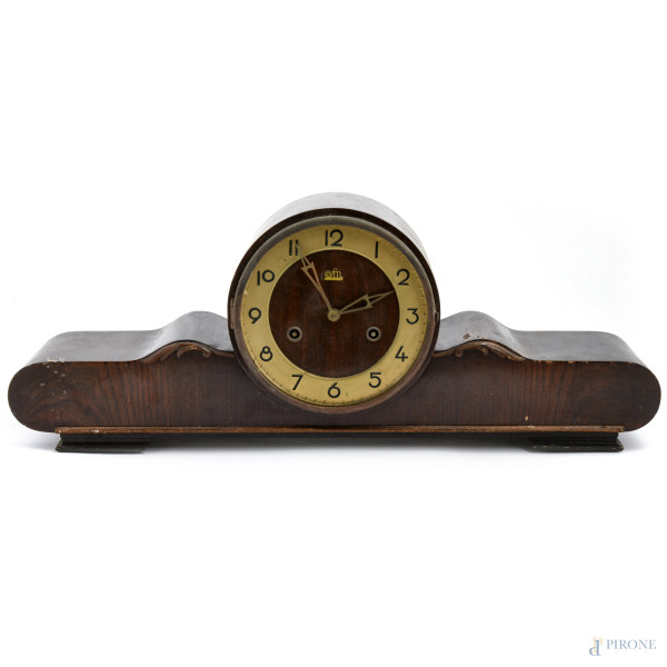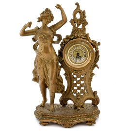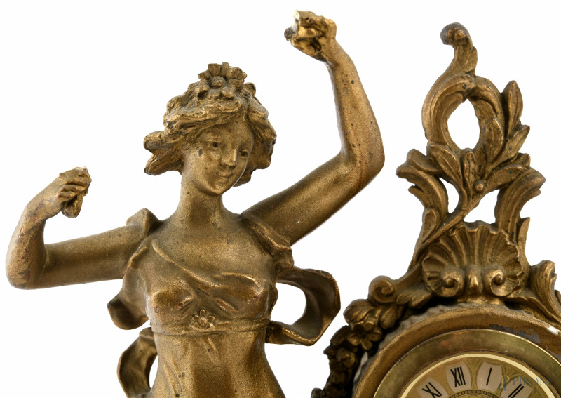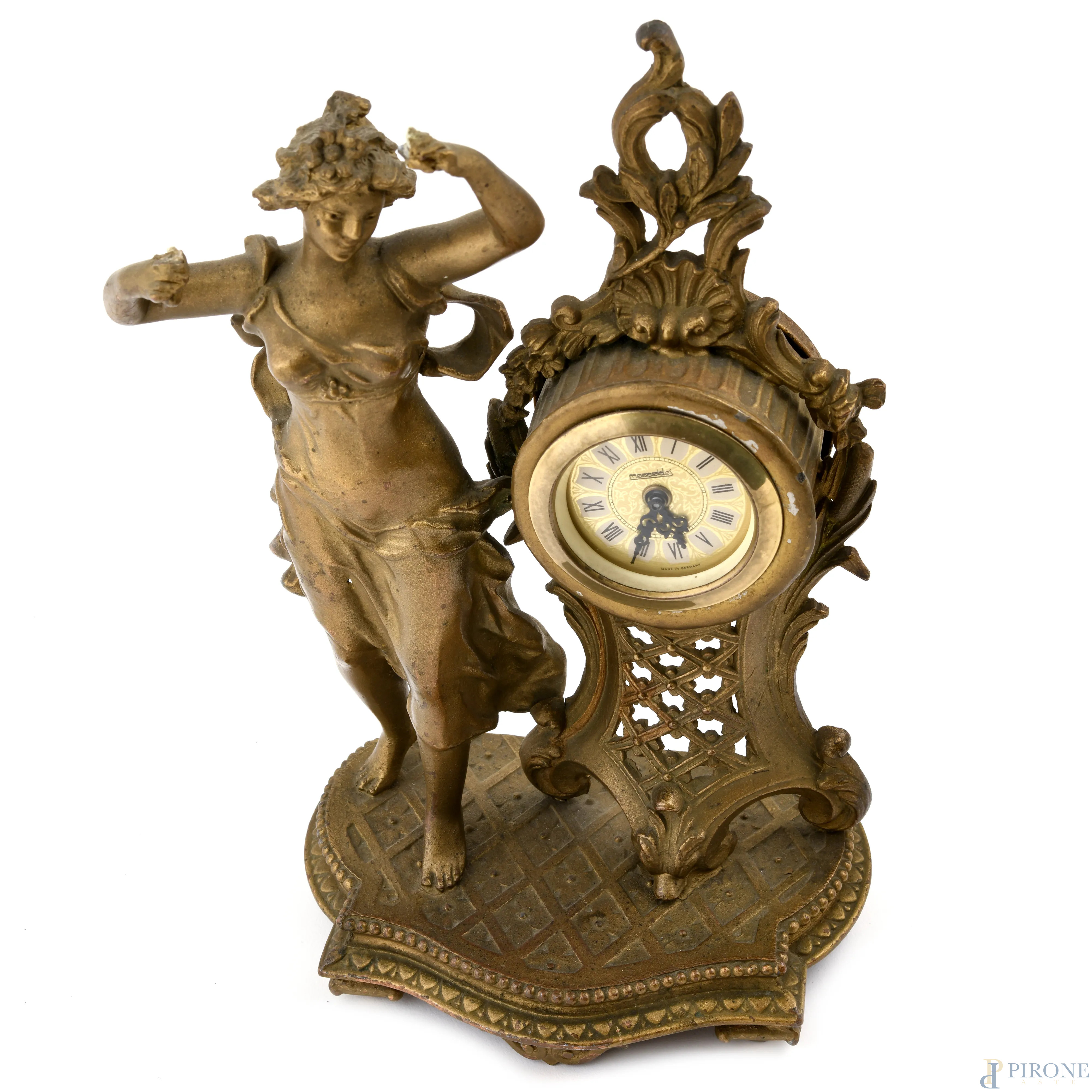 Orologio da tavolo in antimonio dorato con figura femminile danzante, XX secolo. Quadrante circolare con numeri romani, altezza cm 30, (difetti, usura del tempo, mancanze, da revisionare)