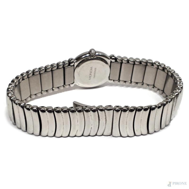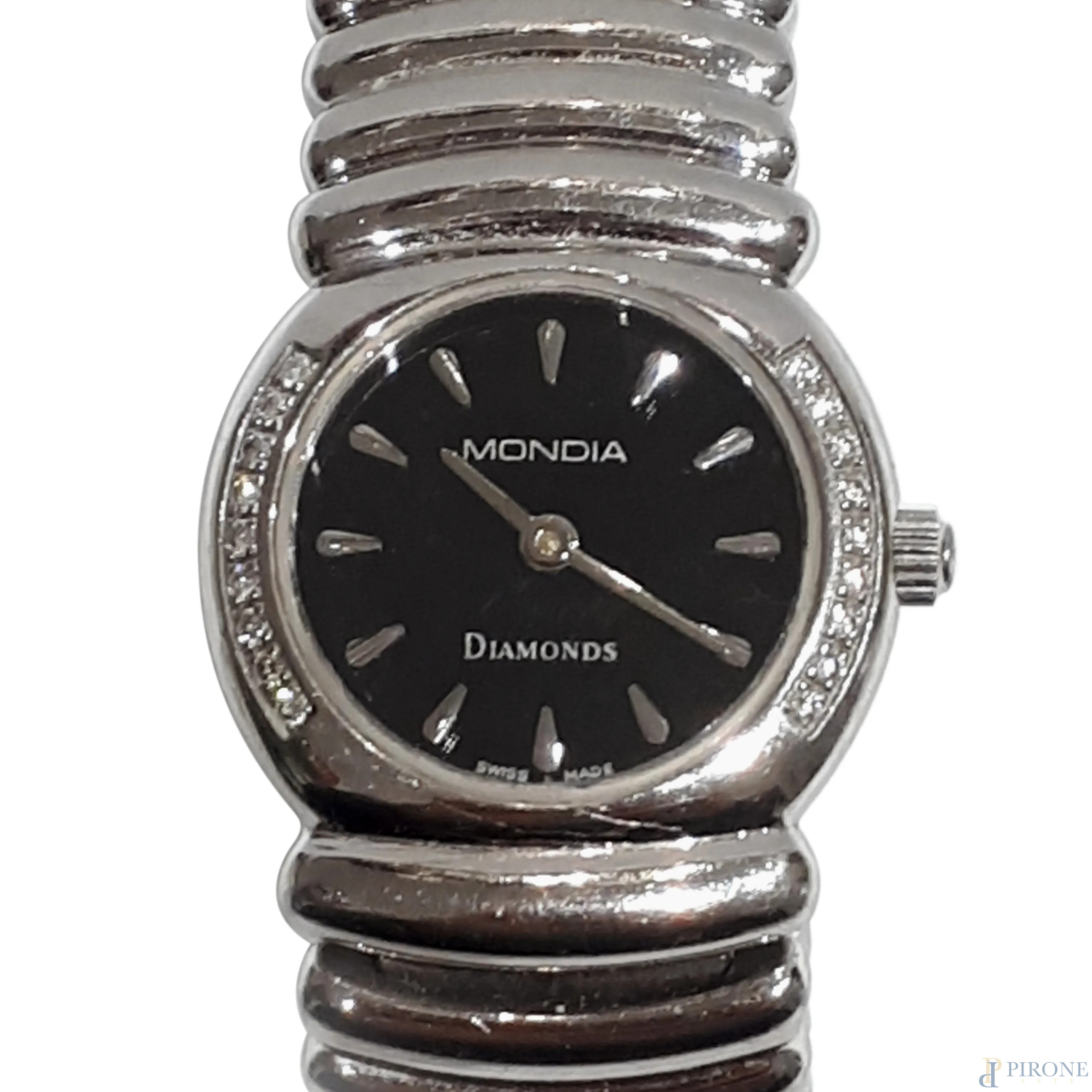 Orologio vintage da polso Mondia da donna, Swiss Made, cassa rotonda in metallo argentato impreziosita da diamanti incastonati lungo la lunetta, quadrante nero con indici applicati e firma MONDIA-DIAMONDS, movimento svizzero al quarzo, bracciale in acciaio, produzione anni 80