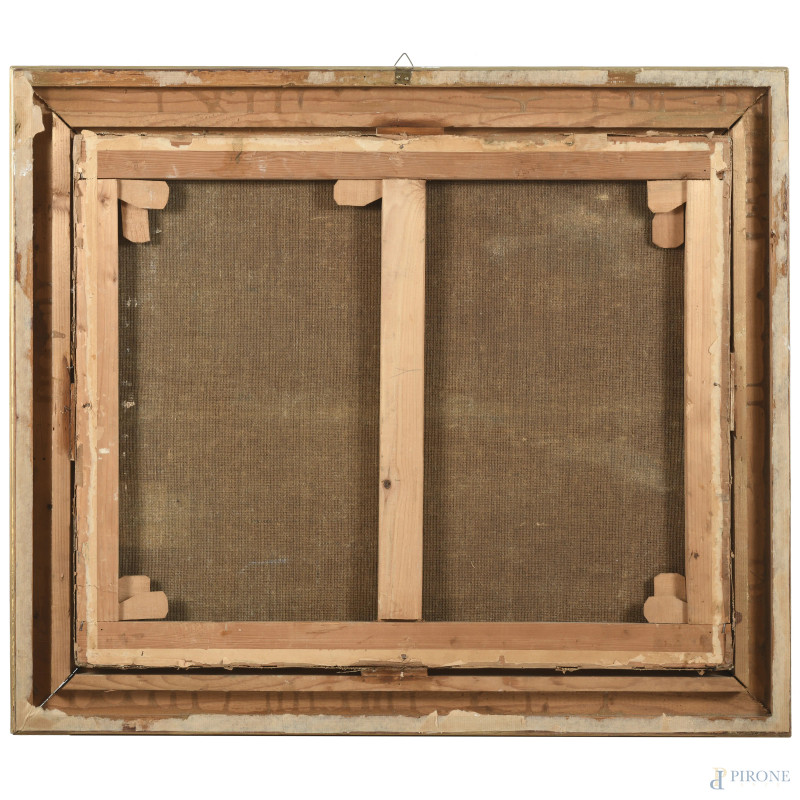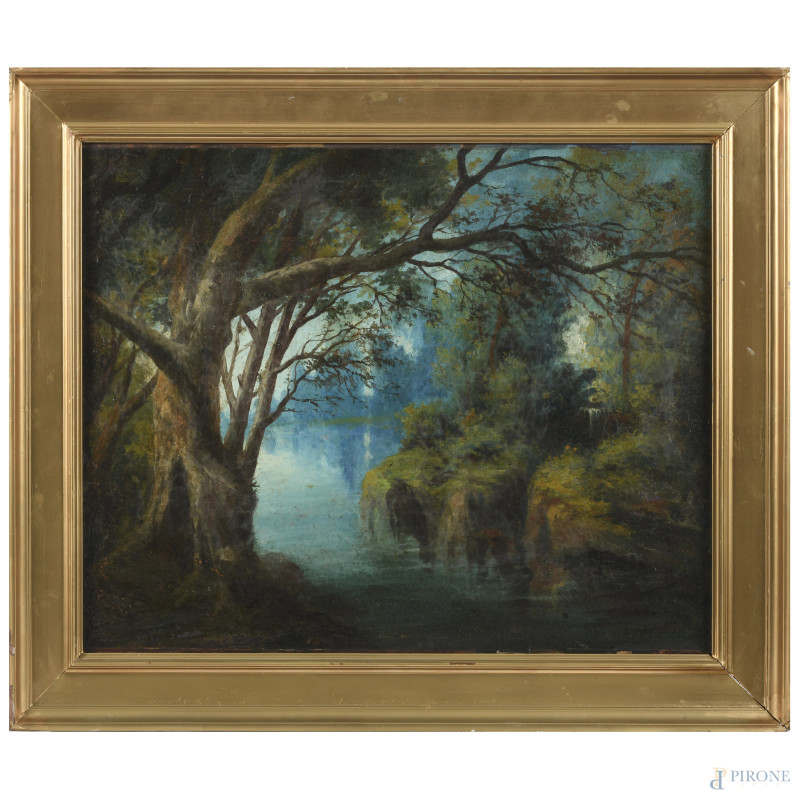 Paesaggio boschivo, XX secolo, olio su tela, cm 53x66,5, entro cornice, (lievi abrasioni e piccole cadute di colore)