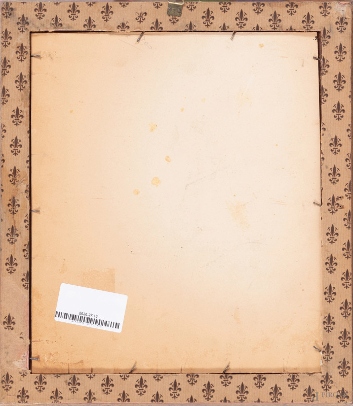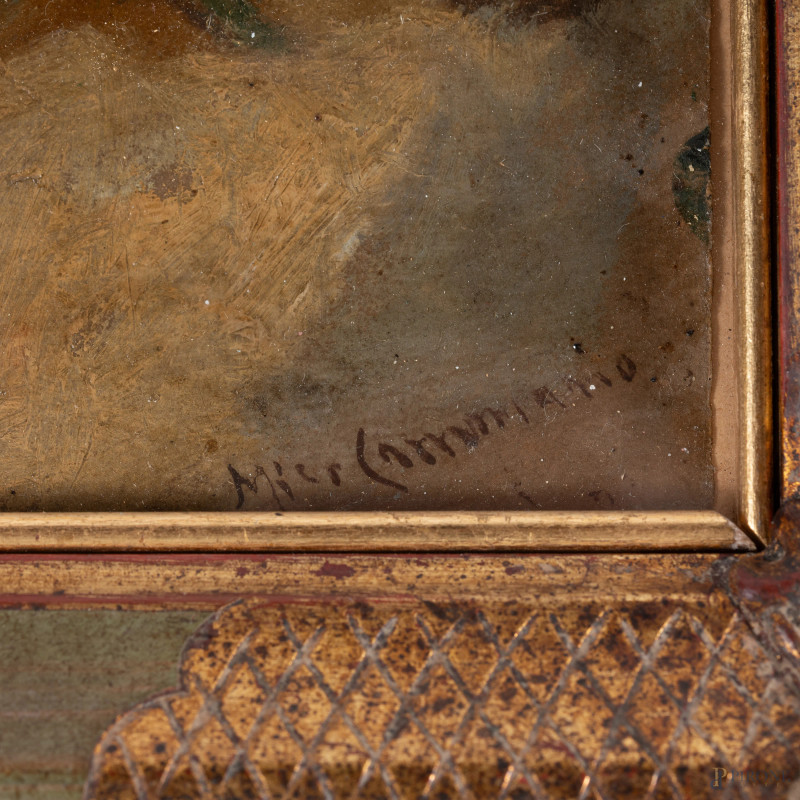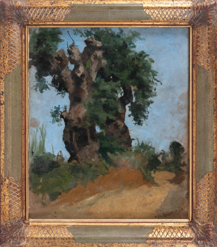 Paesaggio con albero, XX Secolo, olio su cartone, cm 20x28, firmato in basso a destra, entro cornice, (ondulazioni del supporto)