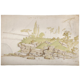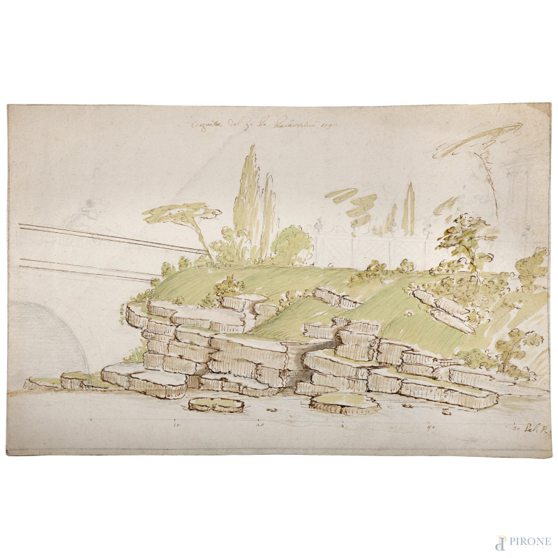 Paesaggio, tecnica mista su carta, XX secolo, cm 28x43, (strappi, abrasioni, segni di usura, foxing, piegature)