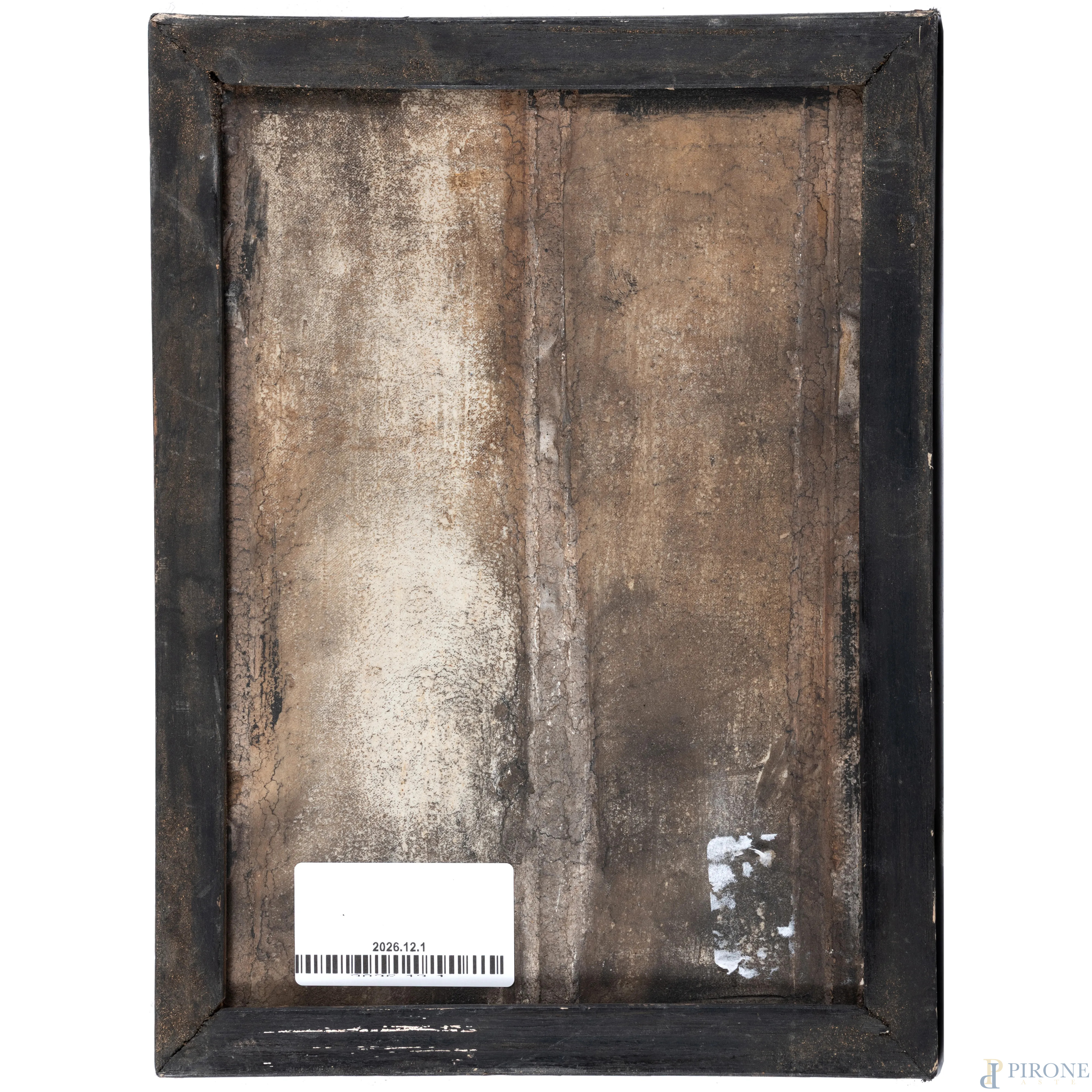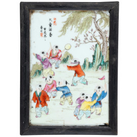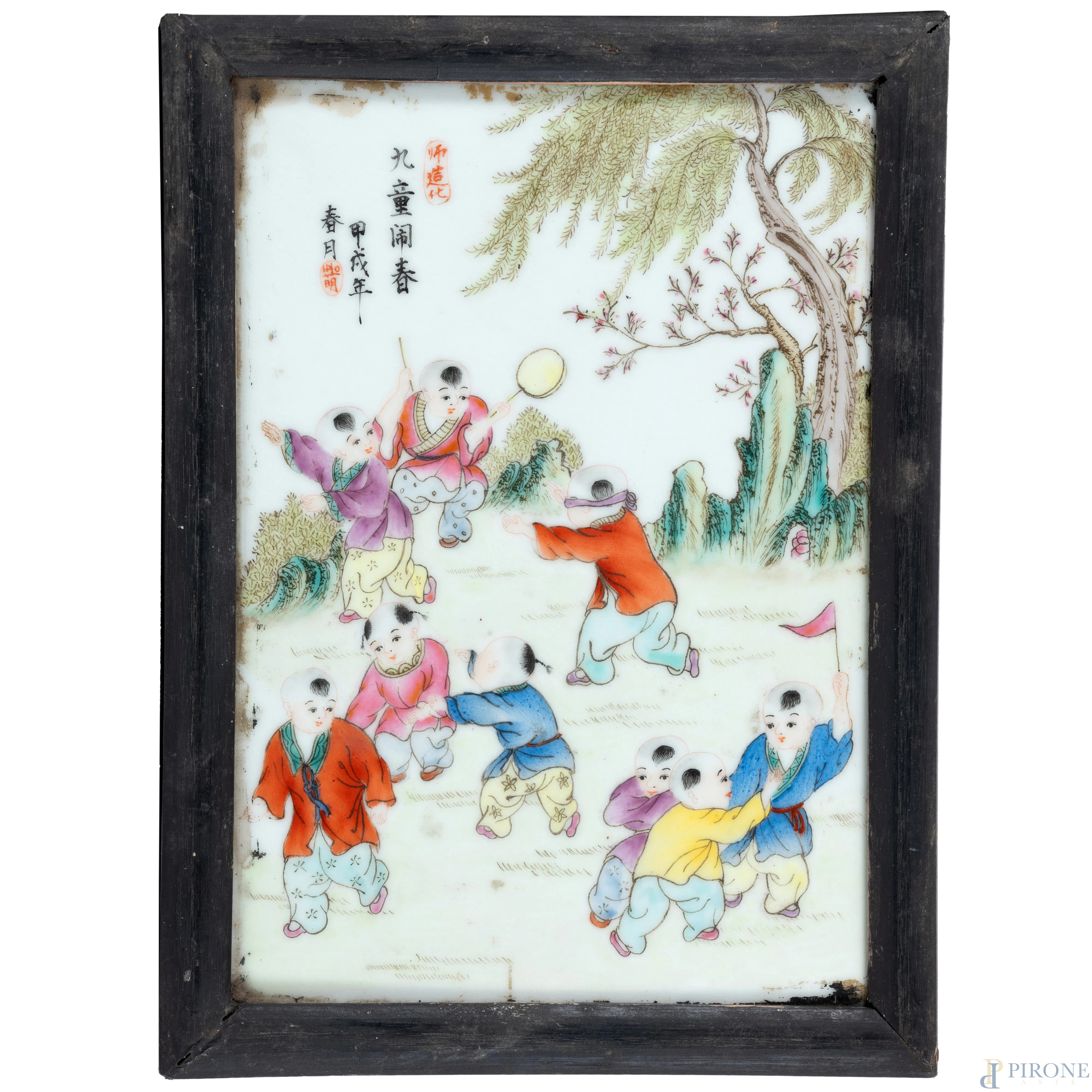 Pannello in ceramica decorata con scena di gioco di bambini, XX secolo, cm 24x16,5, entro cornice, (segni di usura, difetti)