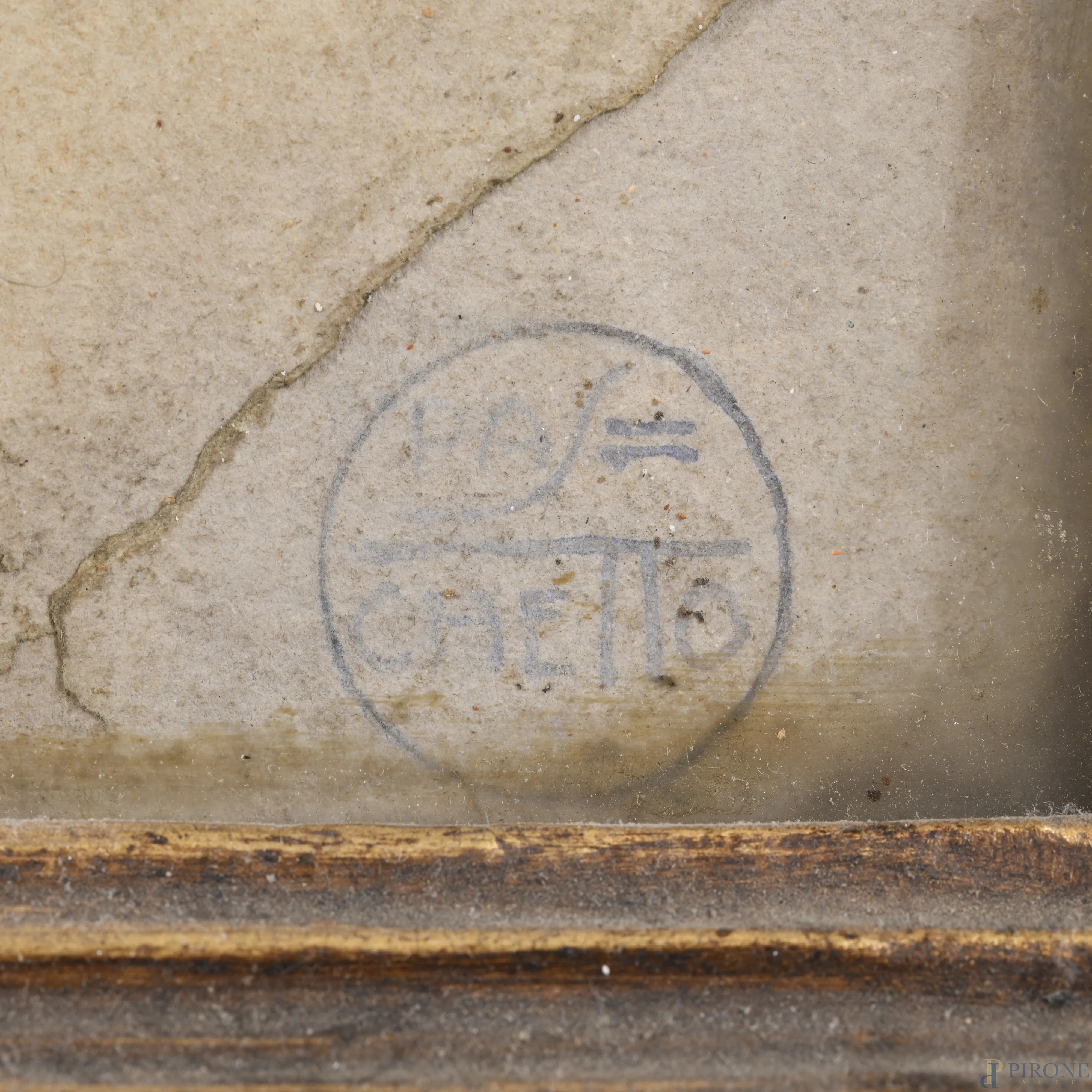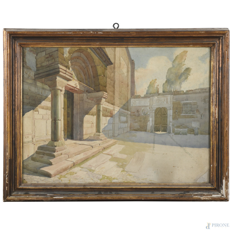 Paolo Antonio Paschetto (1885-1963), Nel chiostro, tecnica mista su cartone, cm 52x71, firmato in basso a destra, entro cornice, (ondulazioni del supporto, foxing, tracce di umidità)