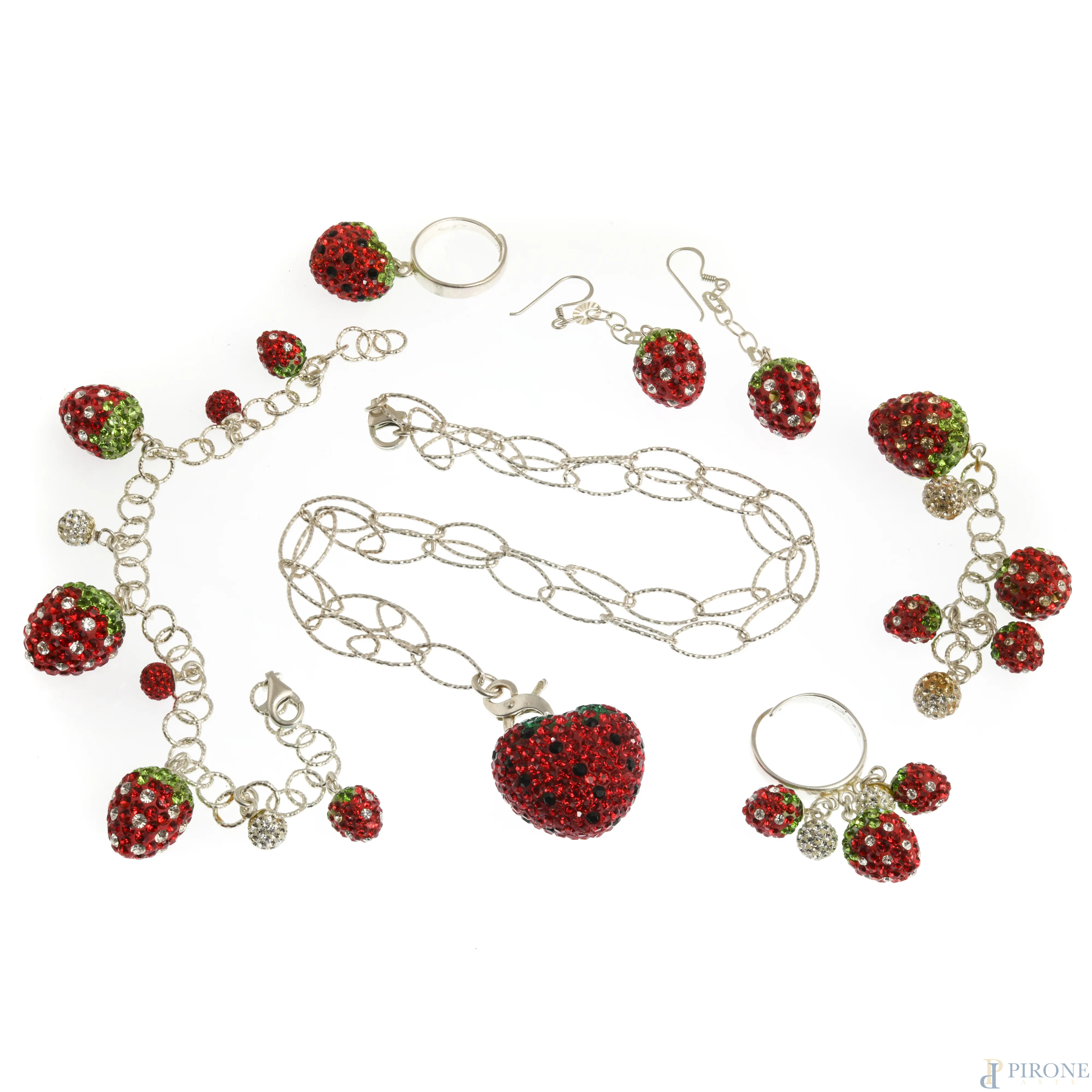 Parure composta da catenina con ciondolo, bracciale, coppia di orecchini e due anelli in argento 925/000 con pendenti a guisa di fragole in resina e brillantini, lunghezza massima cm 60, peso lordo complessivo gr 70, (rotture)
