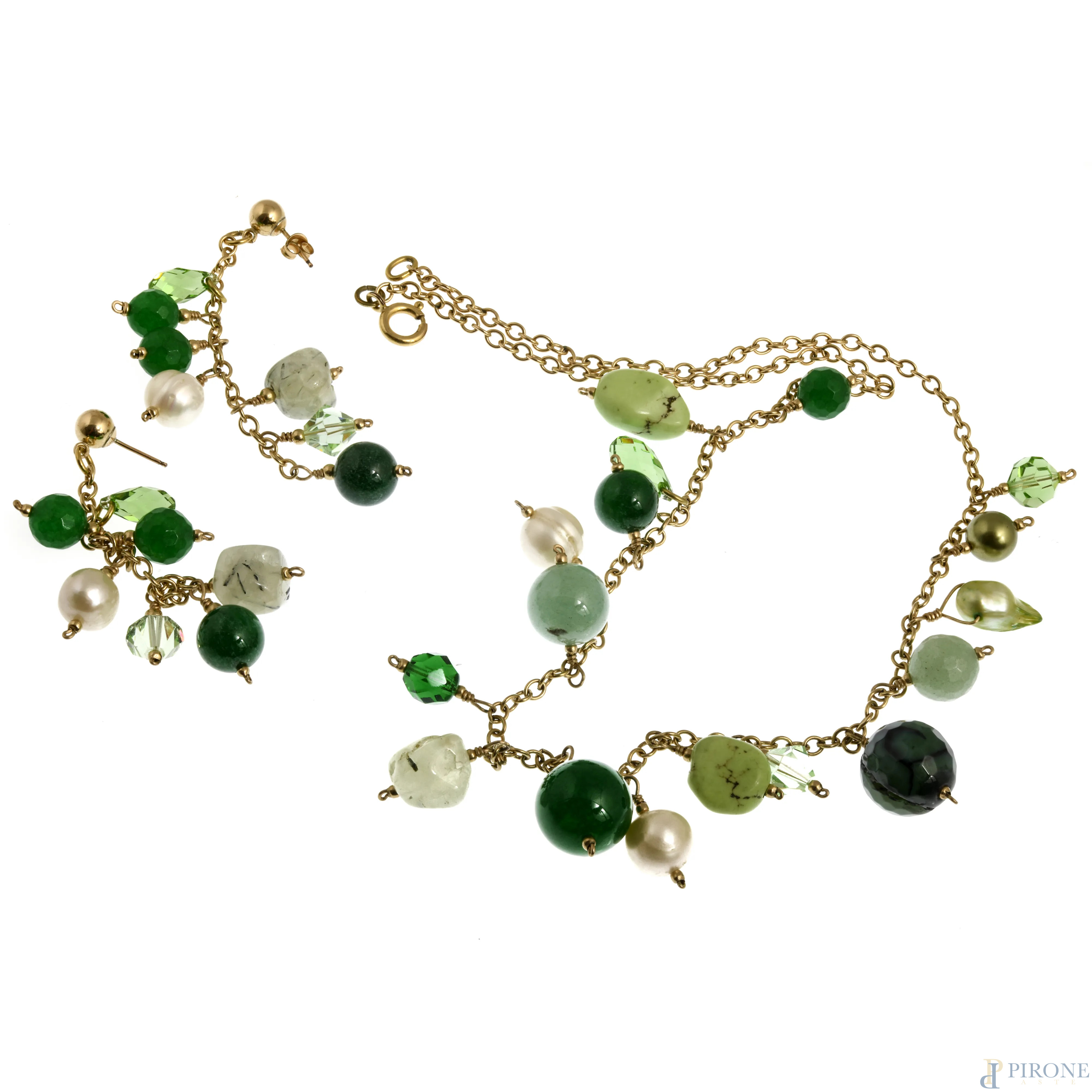 Parure composta da collana e orecchini in oro 14 kt , pietre dure nei toni del verde e perle, lunghezza orecchini cm 7, lunghezza collana cm 49, peso complessivo lordo gr 48, (mancanza di una farfallina)