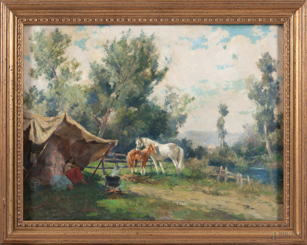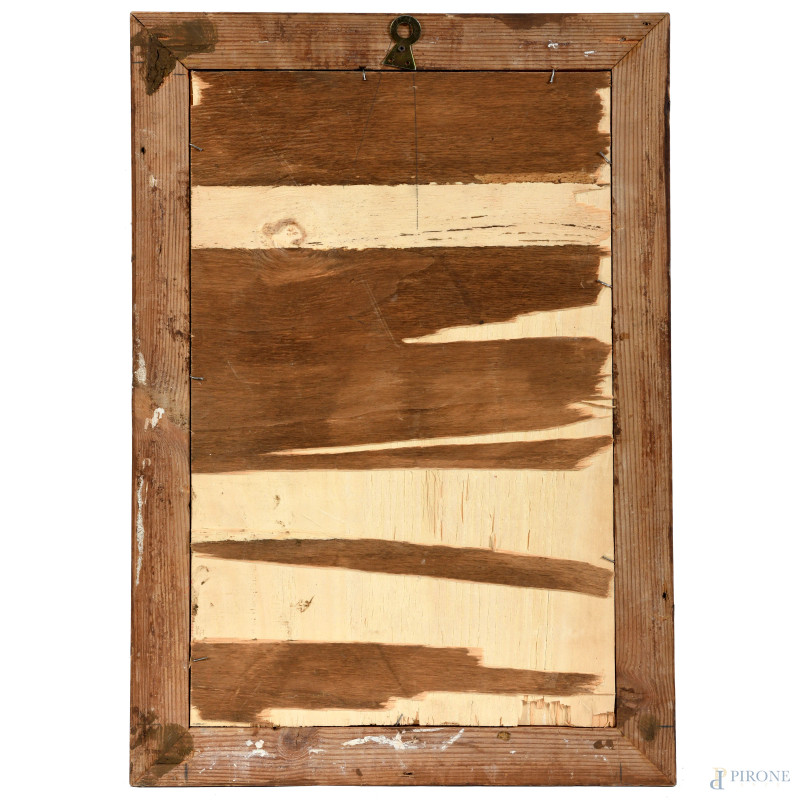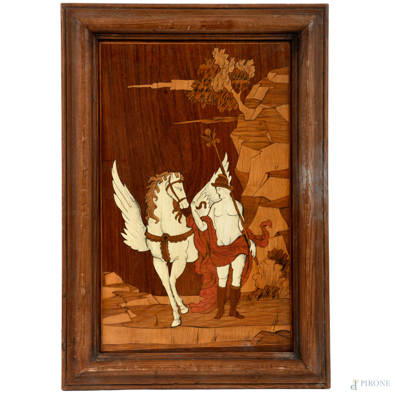 Pegaso e Mercurio, XX secolo, intarsio e pirografo su legno, 47x30, entro cornice, (segni di usura)