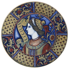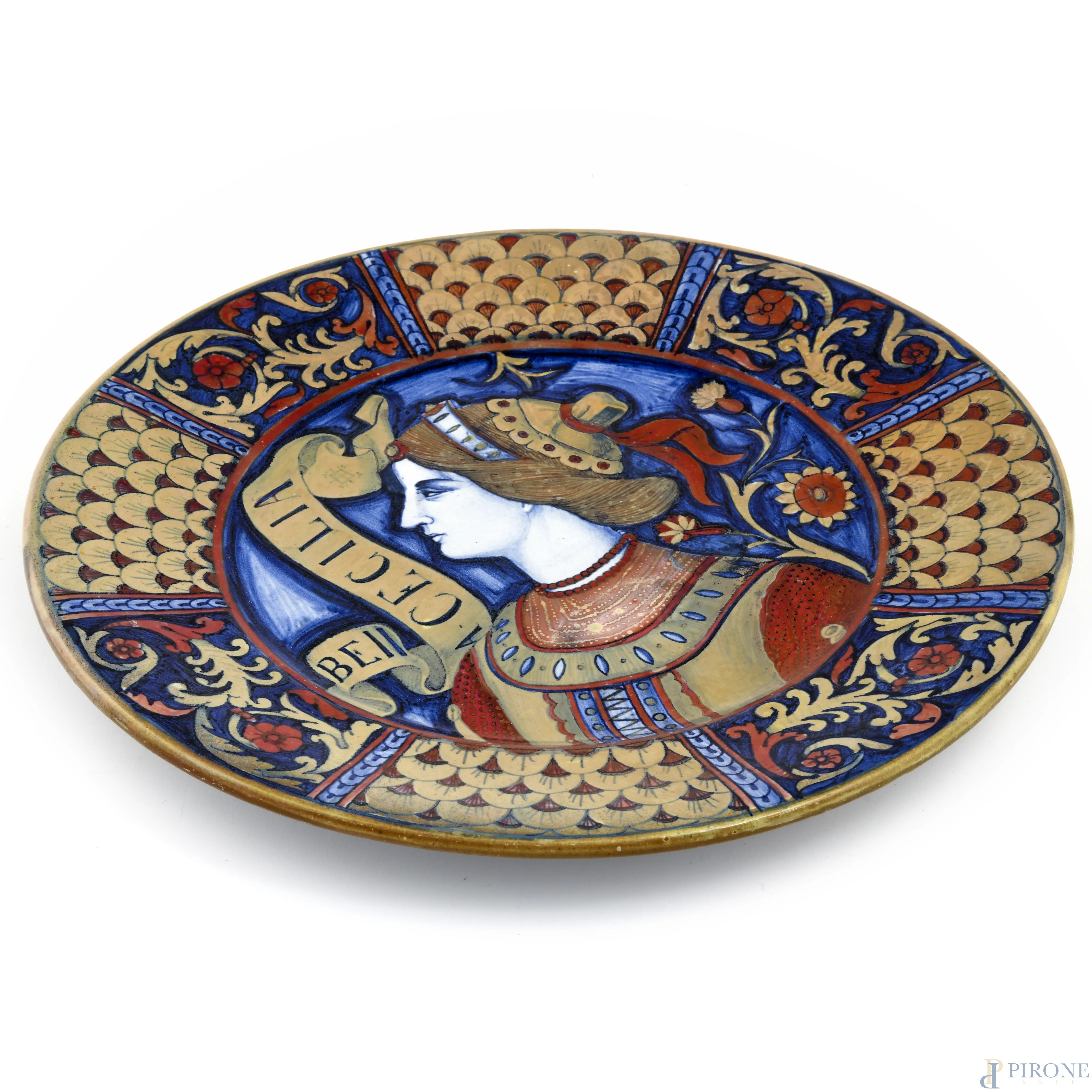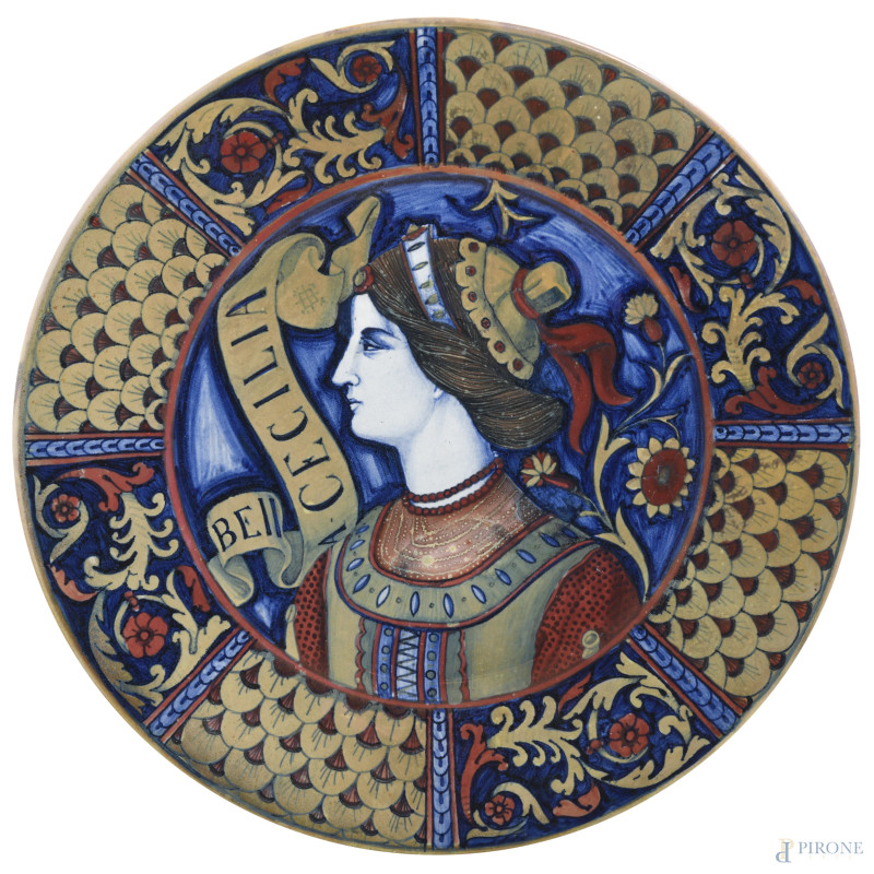 Piatto a lustro raffigurante Bella Cecilia. Manifattura di Gualdo Tadino, XX secolo, diametro cm 37, (segni di usura, graffi)