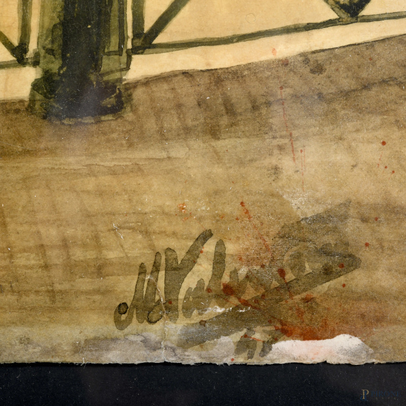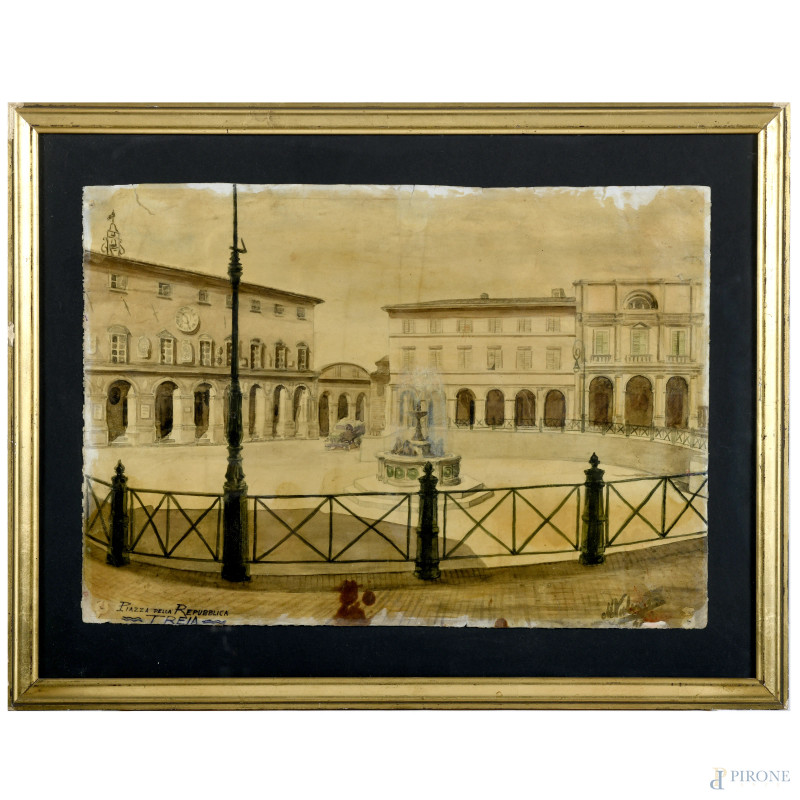 Piazza della Repubblica a Treia, tecnica mista su carta, XX secolo, cm 38x54, firmato e datato "48" in basso a destra, titolato in basso a sinistra, entro cornice, (segni di usura, piegature, piccole lacerazioni)