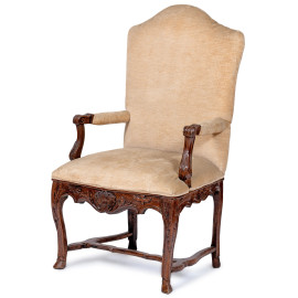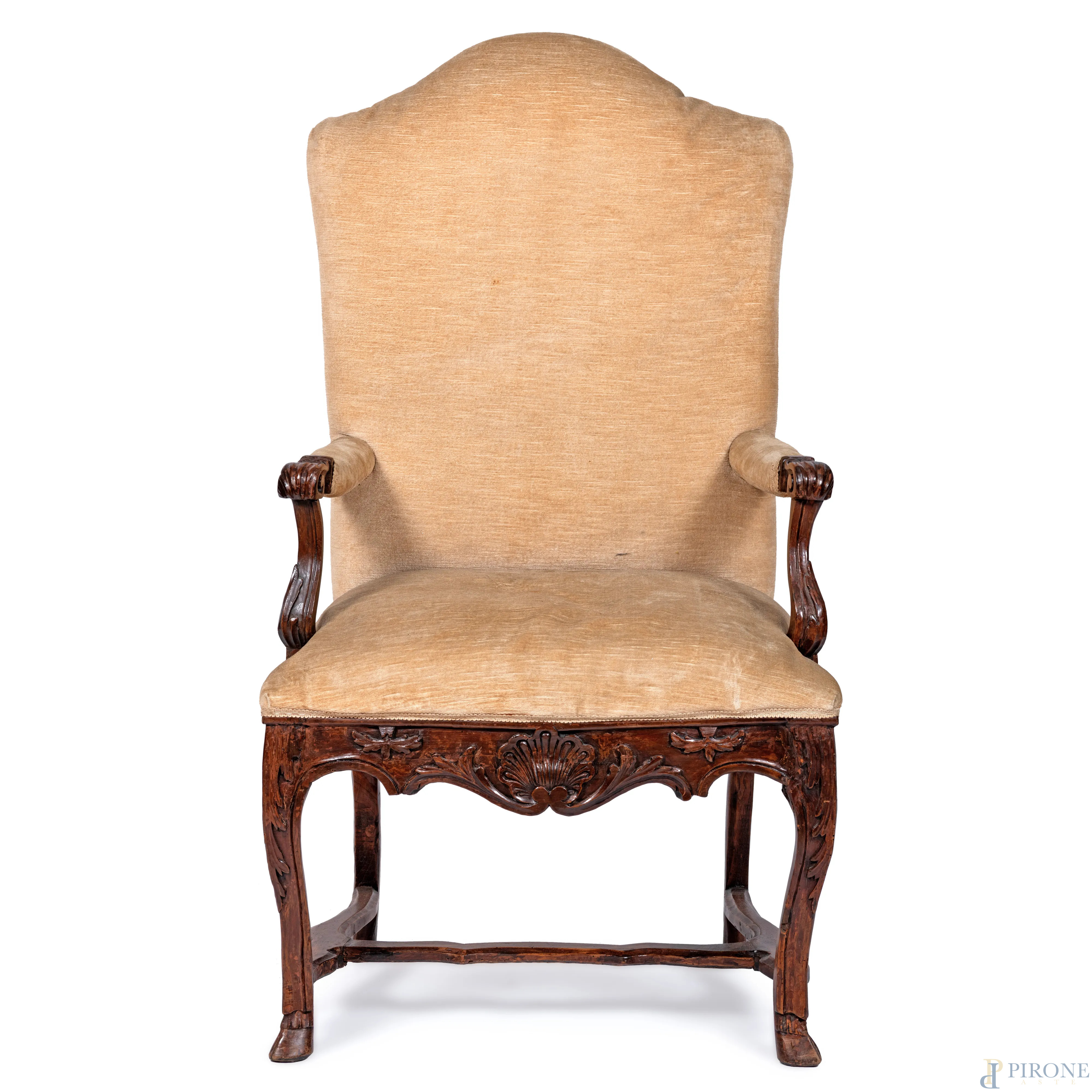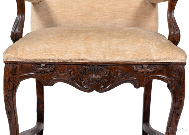Poltrona in noce con gambe raccordate. Schienale, seduta e braccioli imbottiti e rivestiti in tessuro panna, XX secolo, cm 122x70x55, (segni di usura, difetti)
