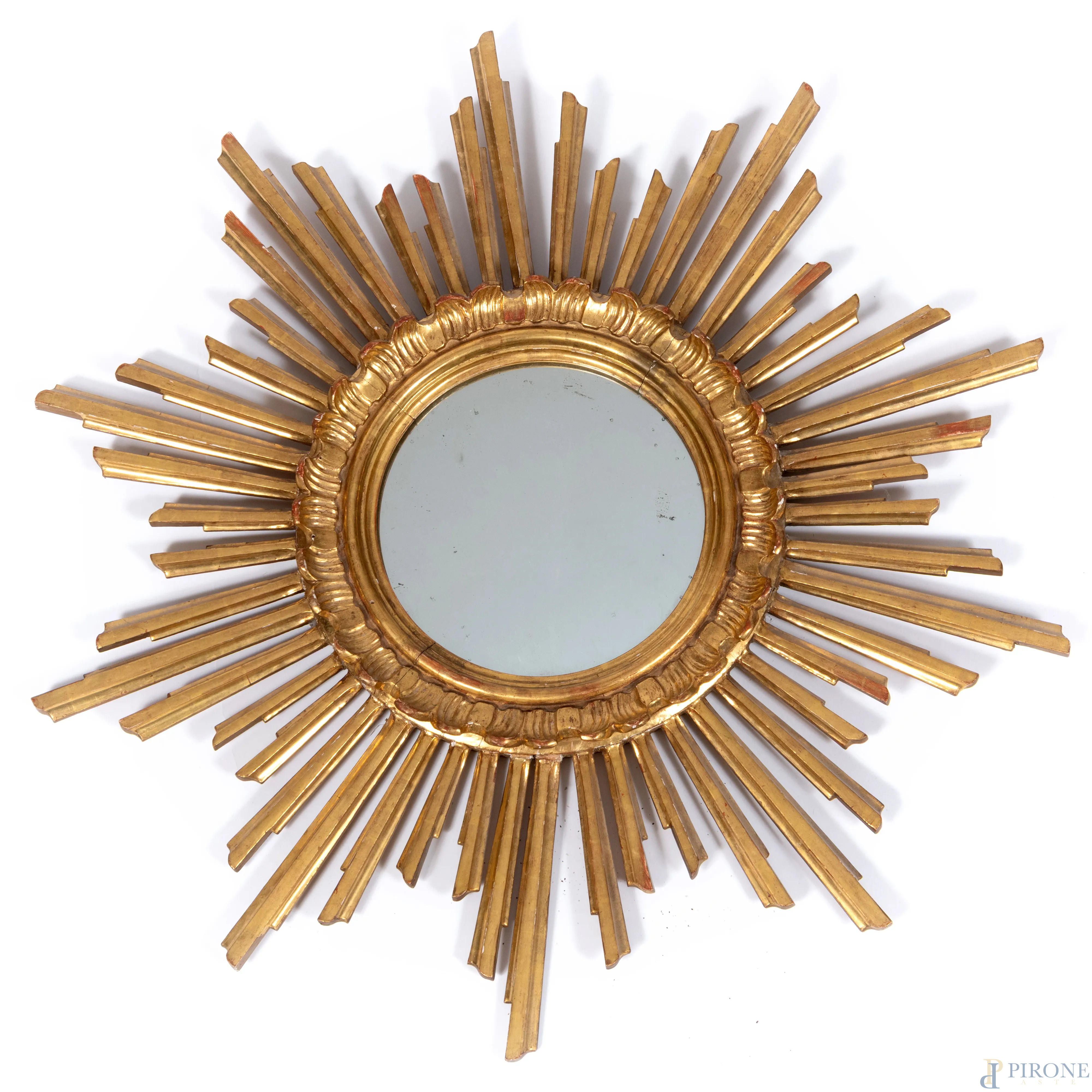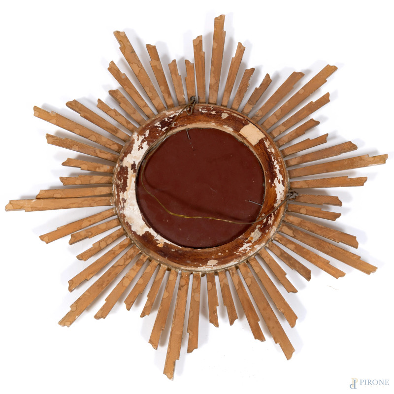 Raggiera in legno dorato e intagliato con specchio centrale, XX secolo, diametro massimo cm 67, (segni di usura, cadute di doratura)