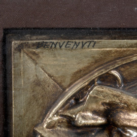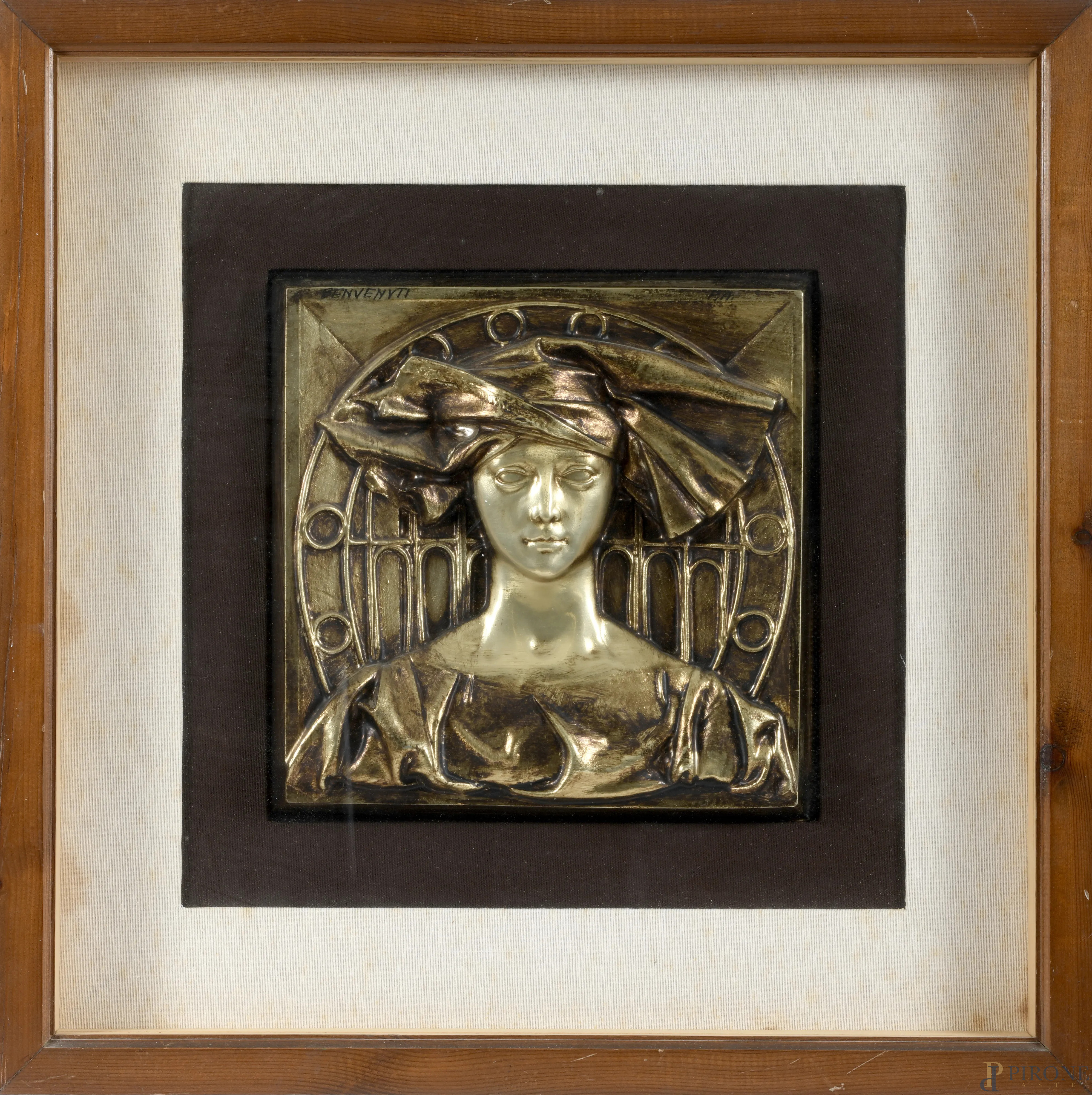 Riccardo Benvenuti, Ritratto di donna, bassorilievo in metallo dorato, es. P.A., cm 29x29, firmato in alto a sinistra, entro cornice