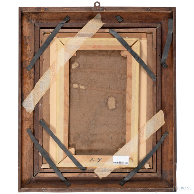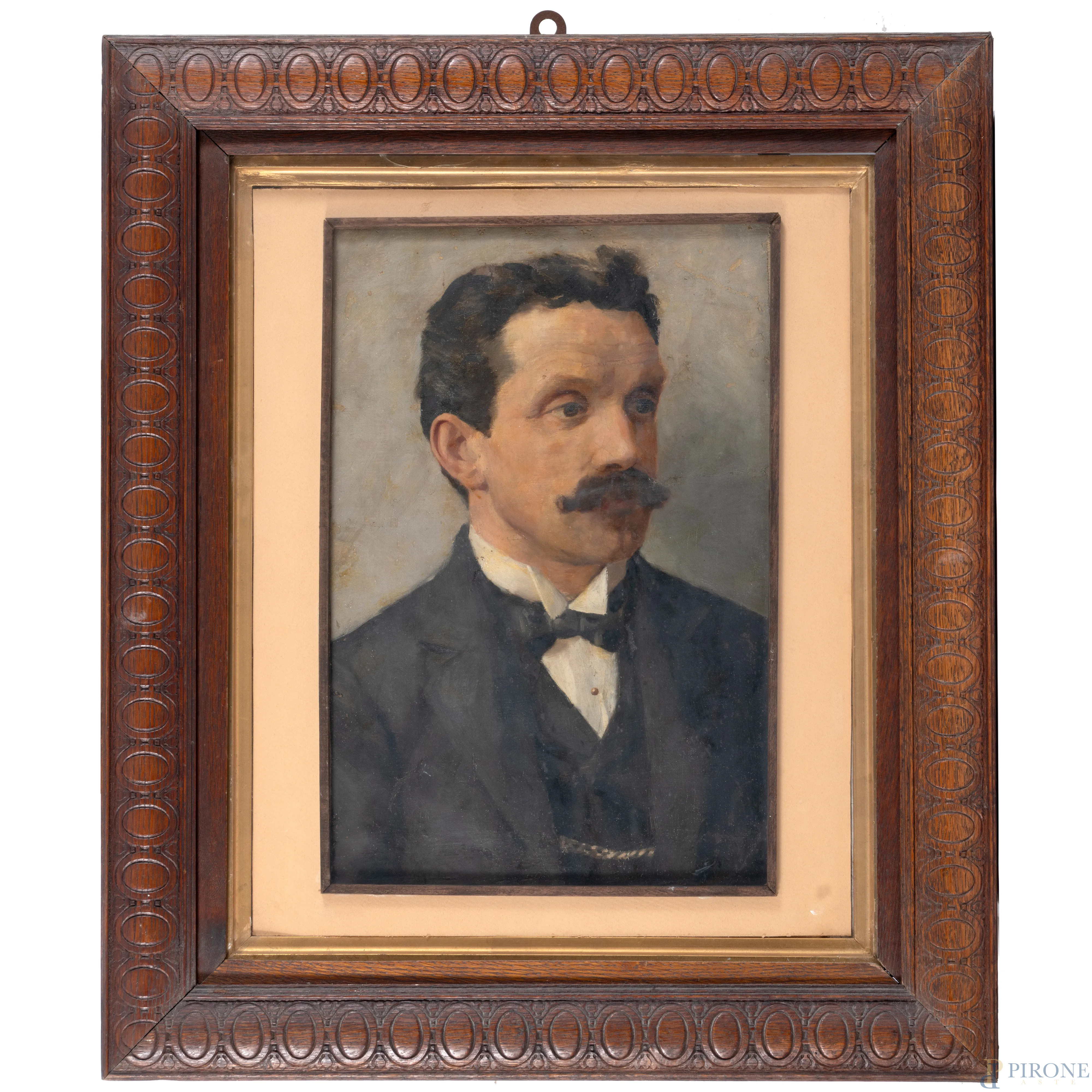 Ritratto virile, XX secolo, olio su tela, cm 48x31, entro cornice, (ondulazioni della tela, cadute di colore, sollevamenti di colore, restauri)