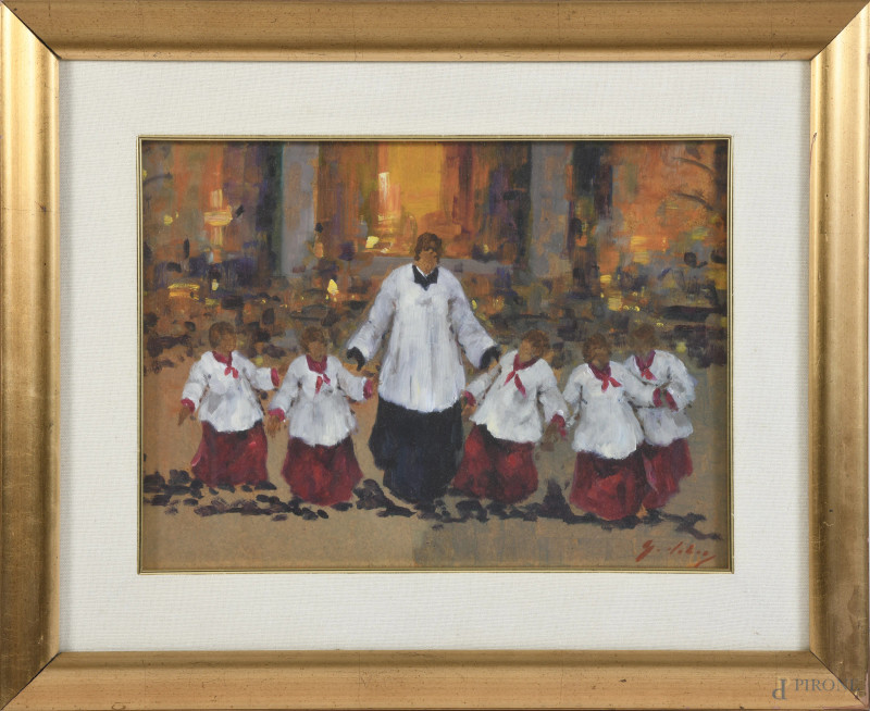 Sacerdote con chirichetti, XX secolo, olio su faesite, cm 30x40,5, firmato in basso a destra, entro cornice