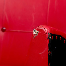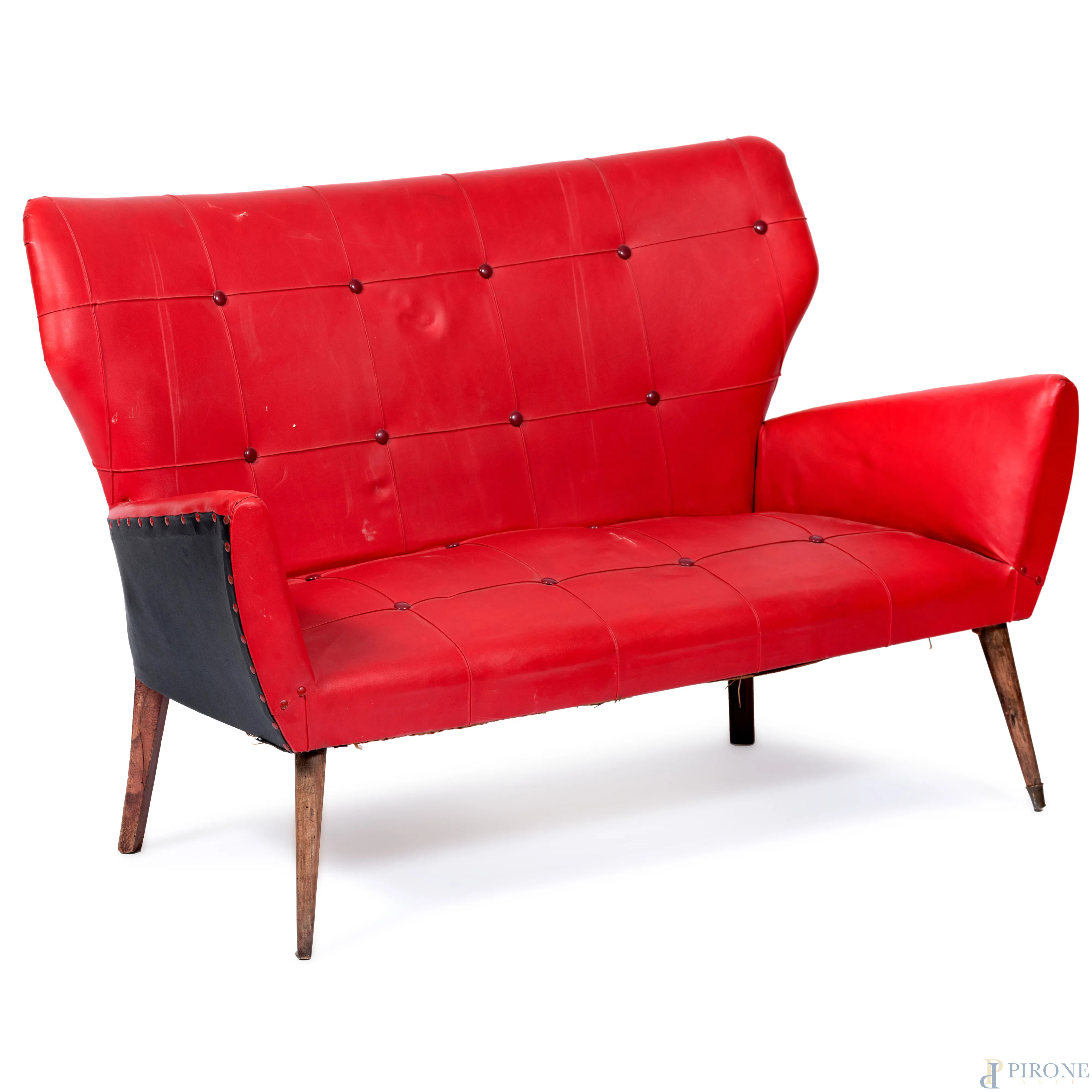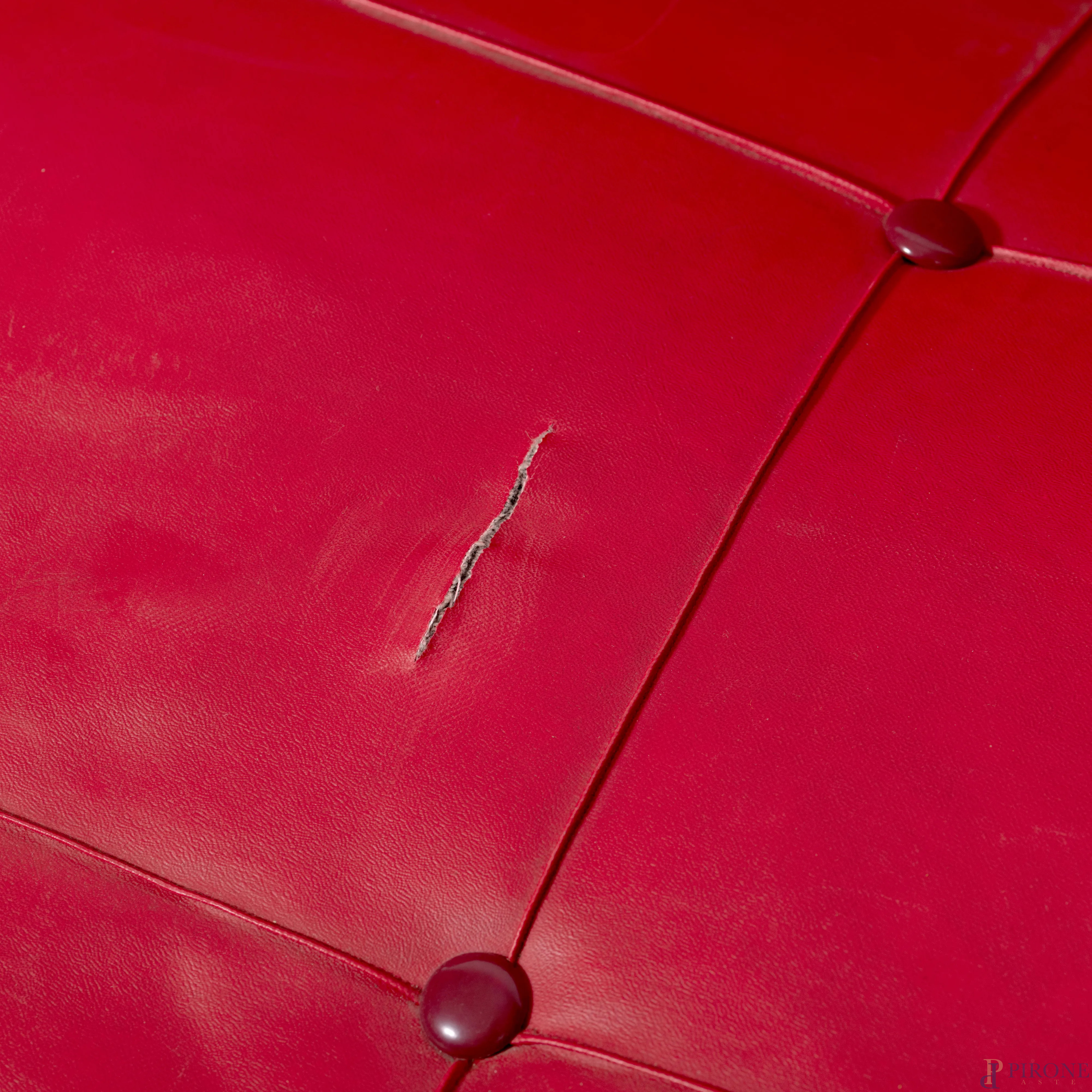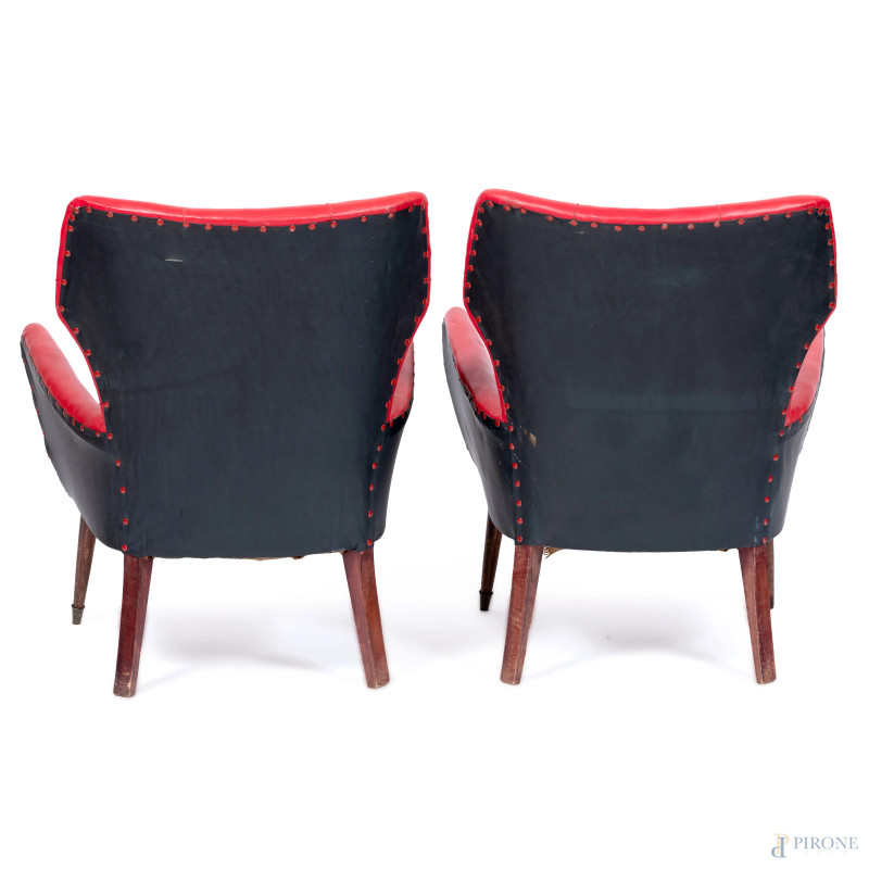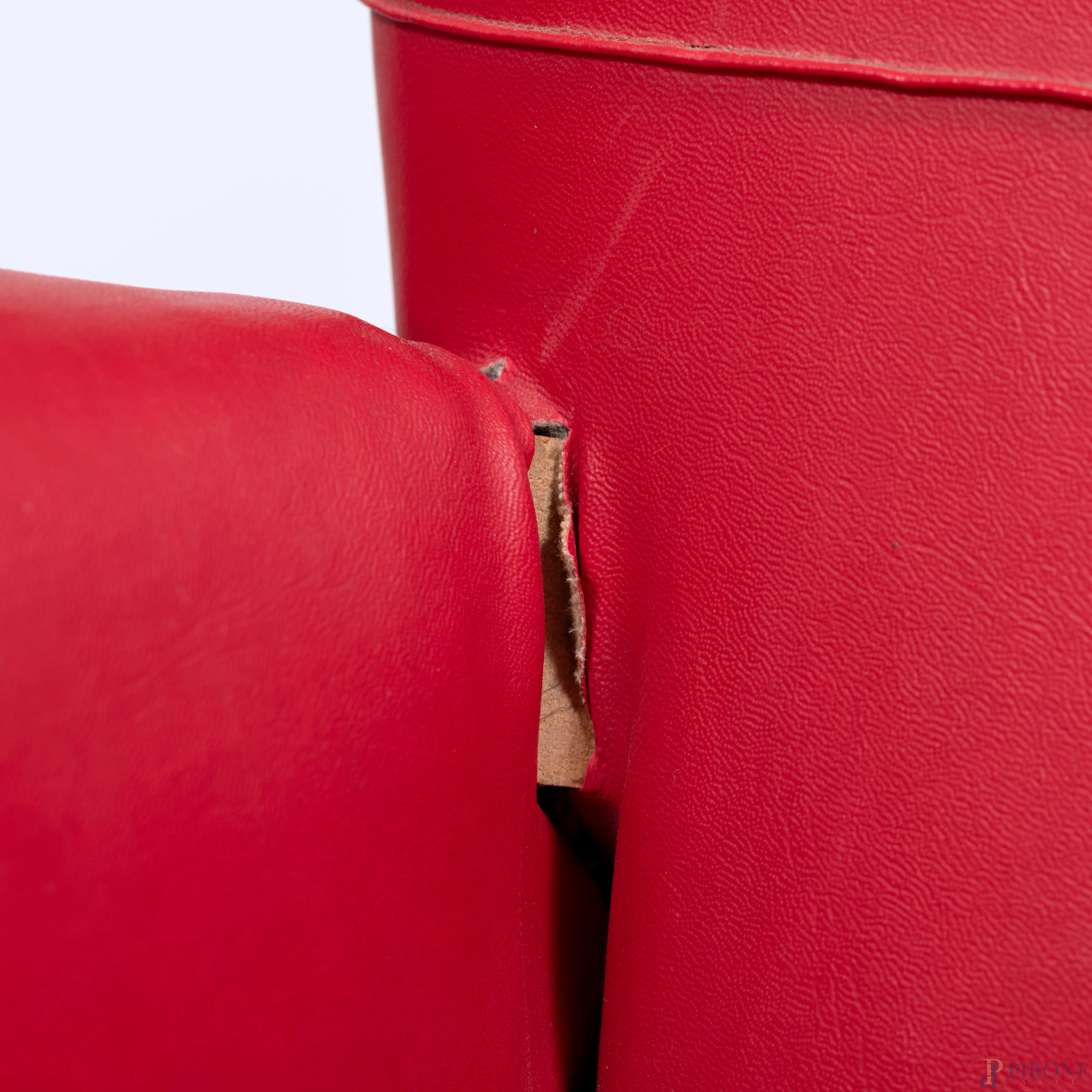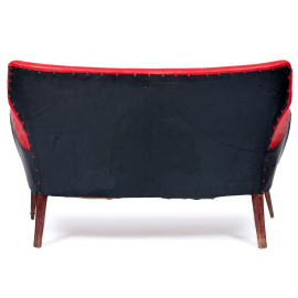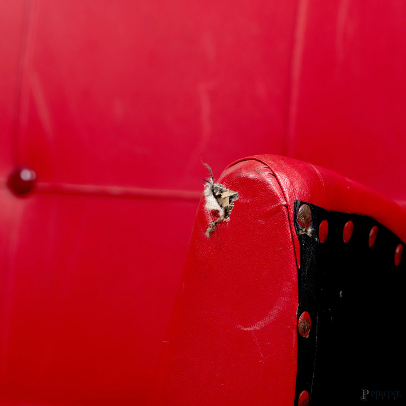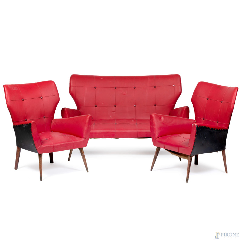 Salotto composto da divano e coppia di poltrone con struttura in legno e rivestimento in similpelle rossa, XX secolo, misure massime cm 83x130x57, (segni di usura. difetti)