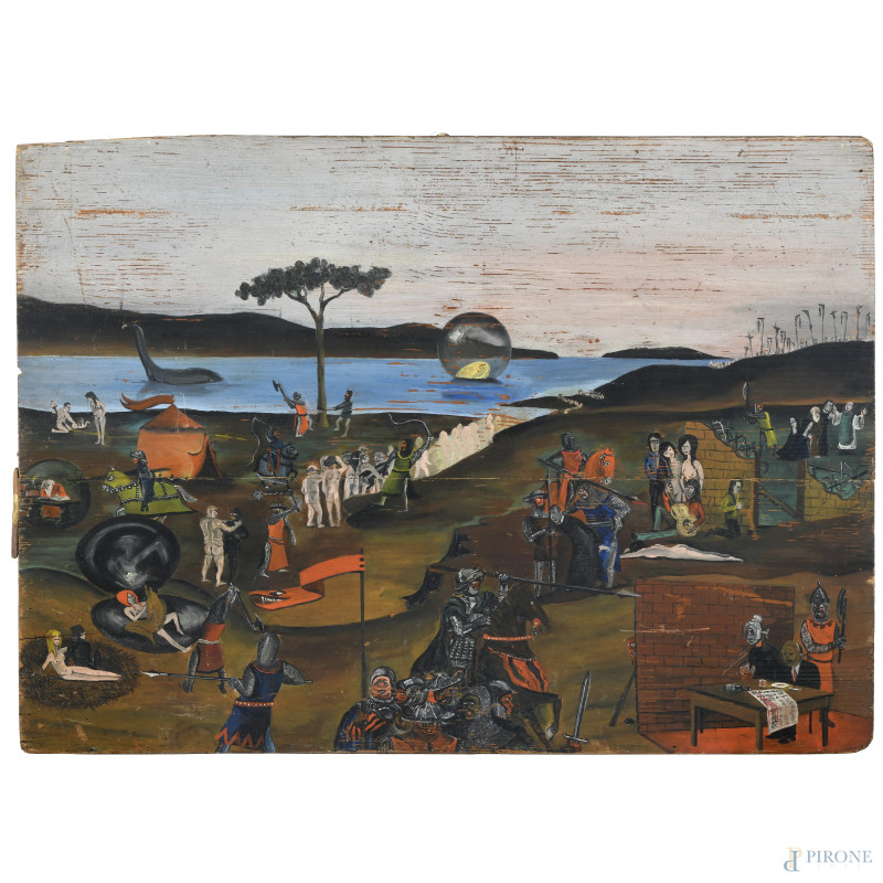 Scena onirica, XX secolo, olio su doppia tavola, cm 70,5x98, (abrasioni, scalfiture del supporto)