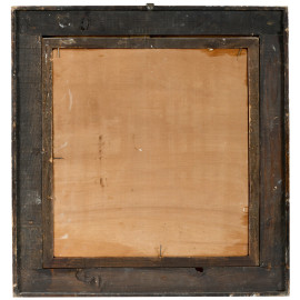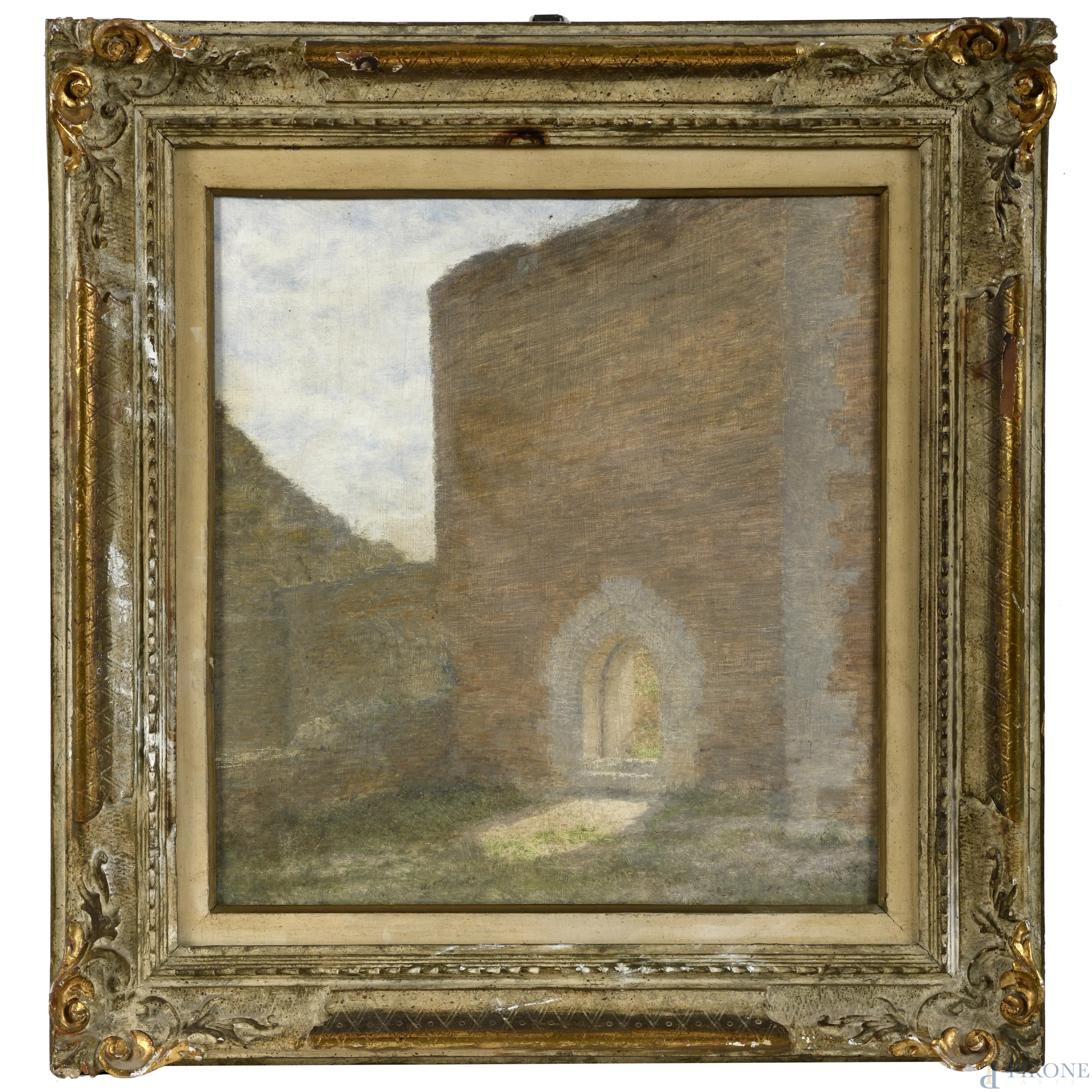 Scorcio di abbazia, XX secolo, olio su compensato, cm 38,5x36, entro cornice