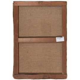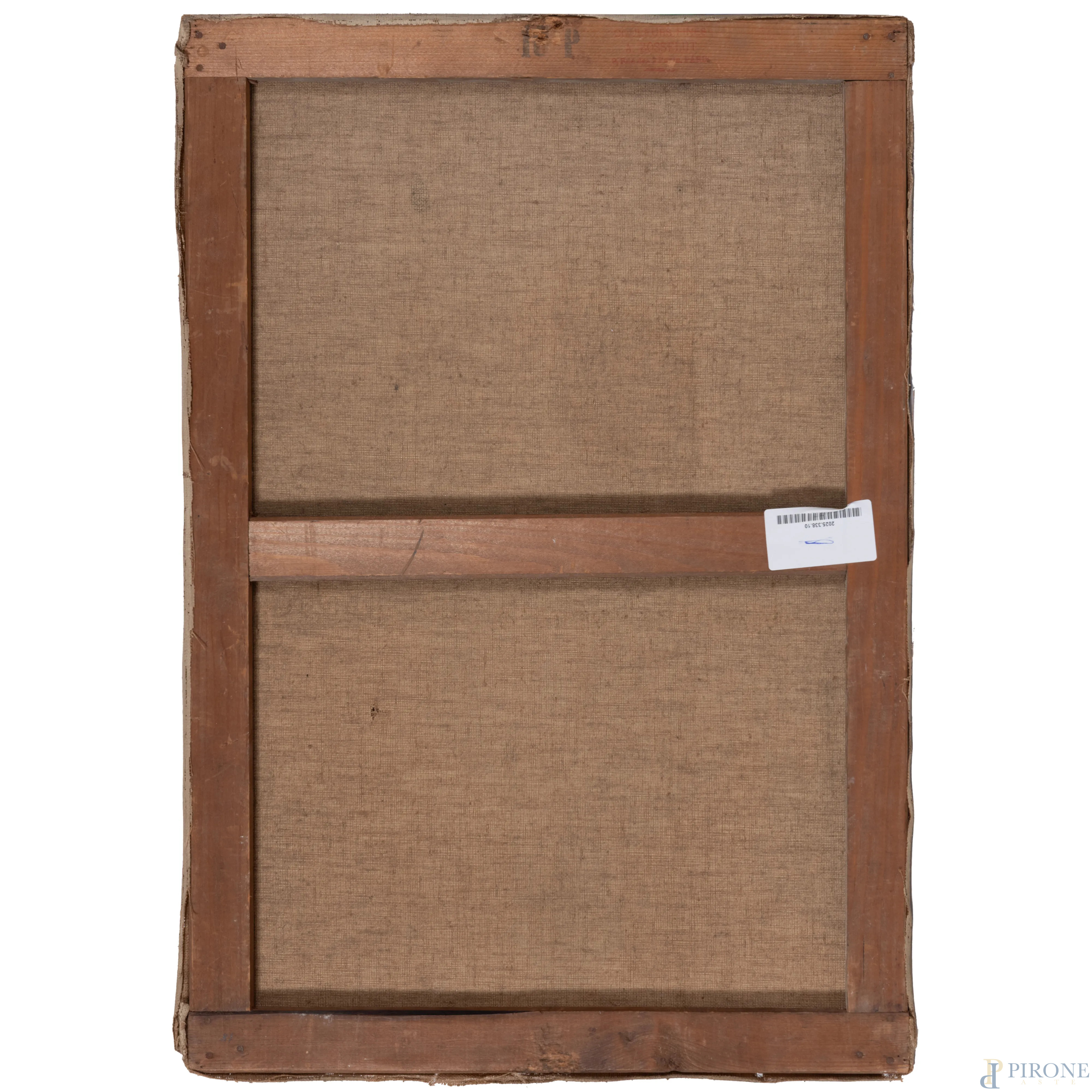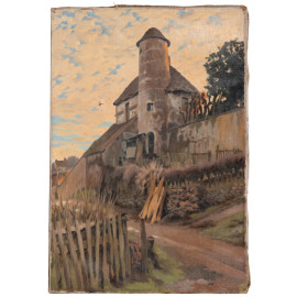 Scorcio di casolare con torre, XX secolo, olio su tela, cm 55x38, (graffi, craquelure, difetti, lacerazione)