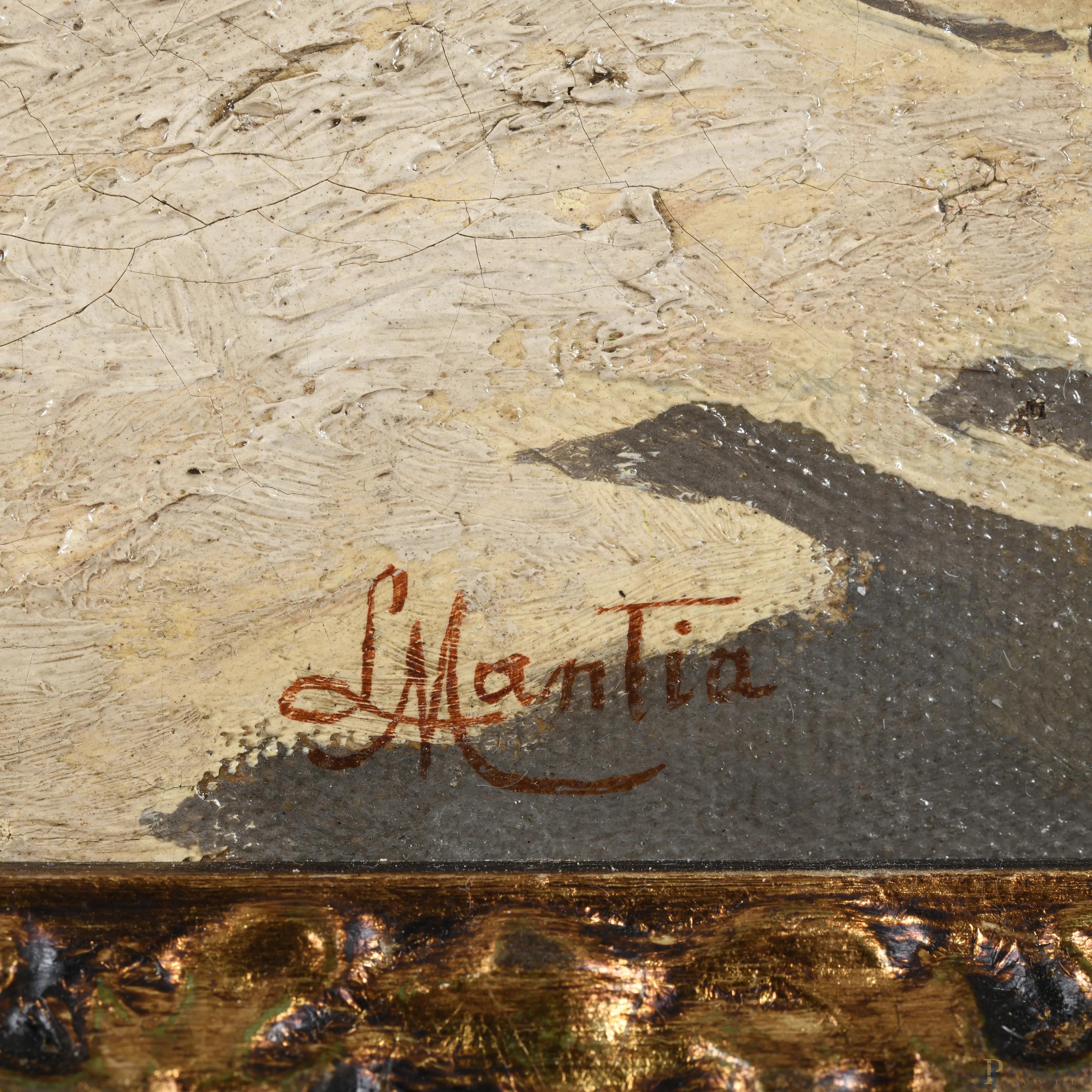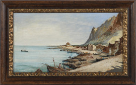 Scorcio di costa, XX secolo, olio su tela, cm 25x46, firmato in basso a destra, entro cornice, (craquelure, sollevamenti di colore, segni di battitura del telaio)