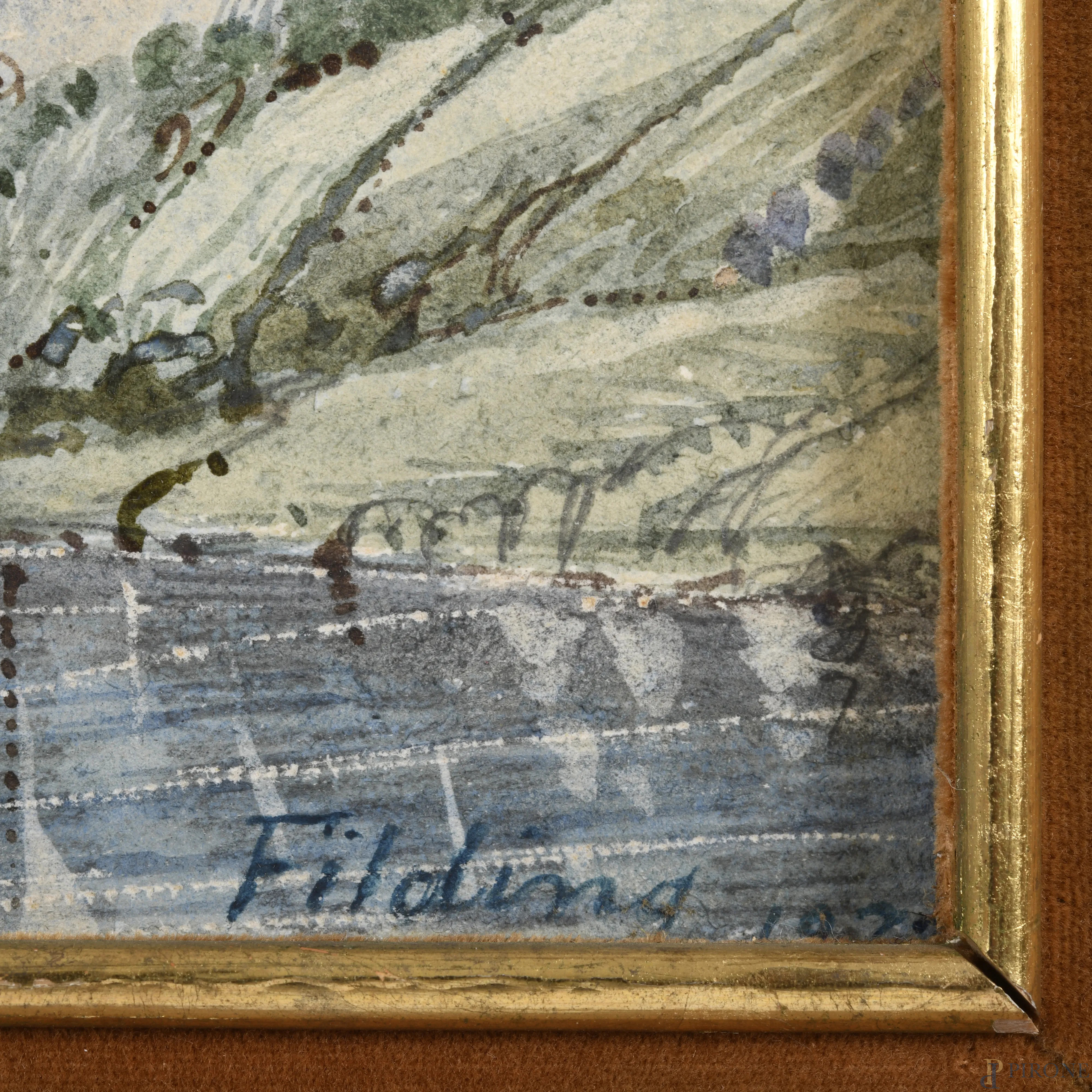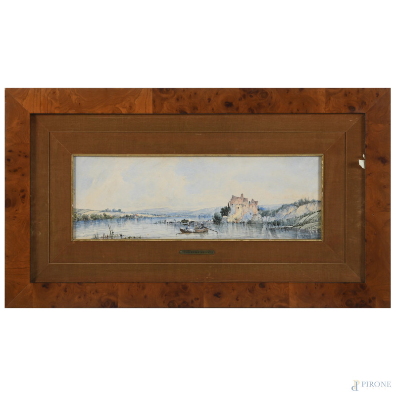 Scorcio di lago con figure, XIX-XX secolo, acquerello su carta, cm 19x56, firmato e datato in basso a destra, entro cornice, (tracce di umdiità, ossidazione, ondulazione della carta)