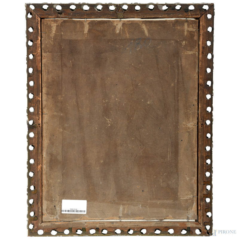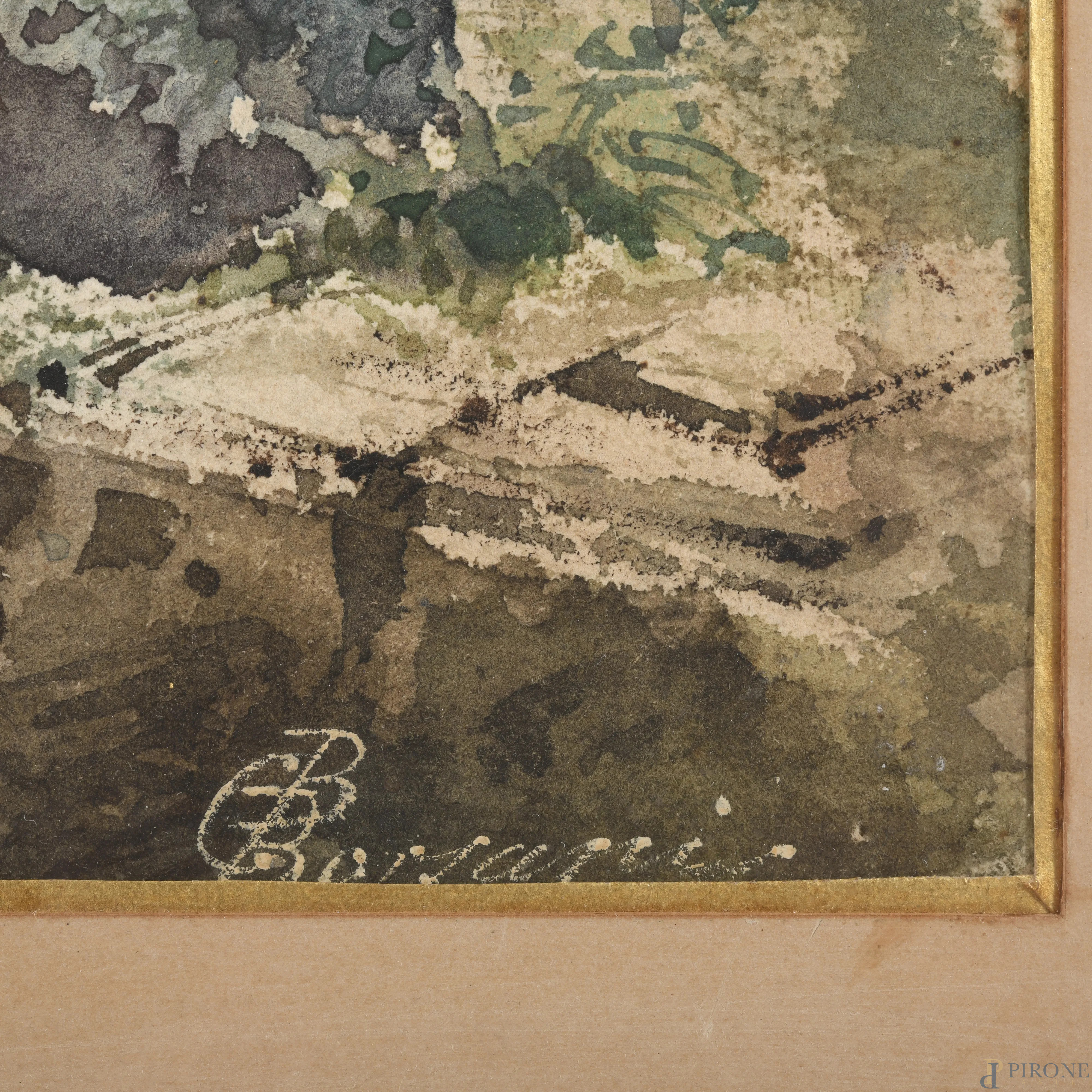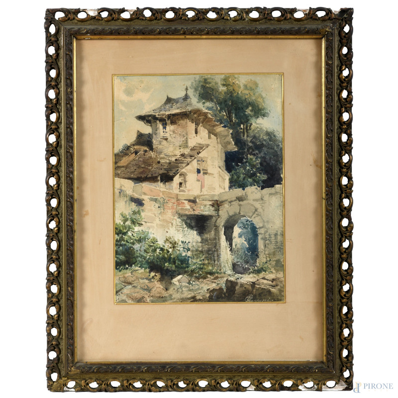 Scorcio di paese, XX secolo, acquerello su carta, cm 45,5x34 compreso passepartout, firmato in basso a destra, entro cornice,(ondulazioni della carta, tracce di umidità, piccoli fori)