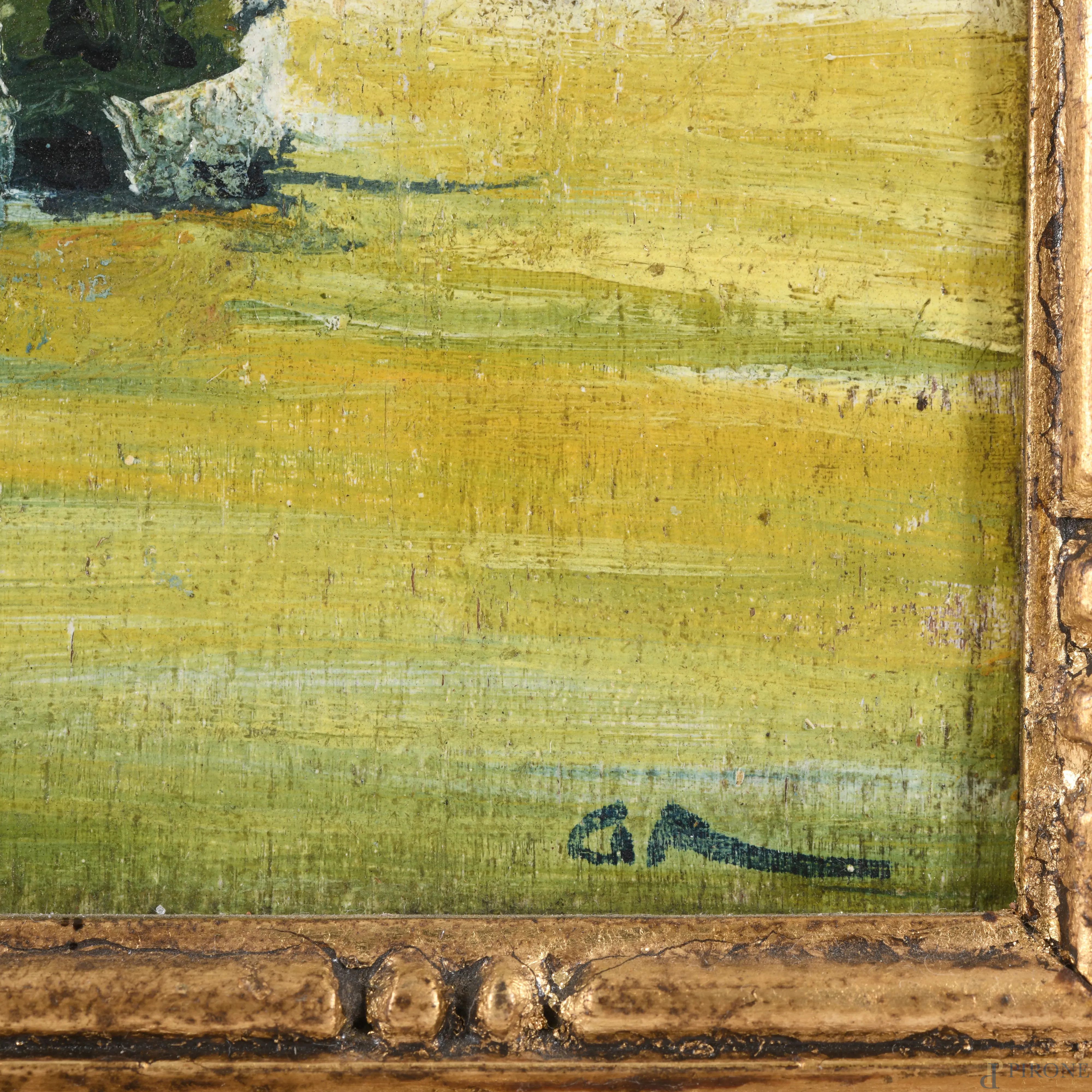 Scorcio di villa con fontana, XX secolo, olio su compensato, cm 17x20, siglato in basso a destra, entro cornice, (segni di usura, difetti, restauri)