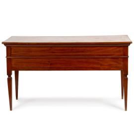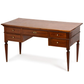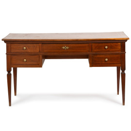 Scrivania in noce con filettature in bosso al piano. Fronte a un cassetto centrale fiancheggiato da coppia di cassetti in colonna, cm 77x140x70,5, (segni di usura, graffi, difetti)