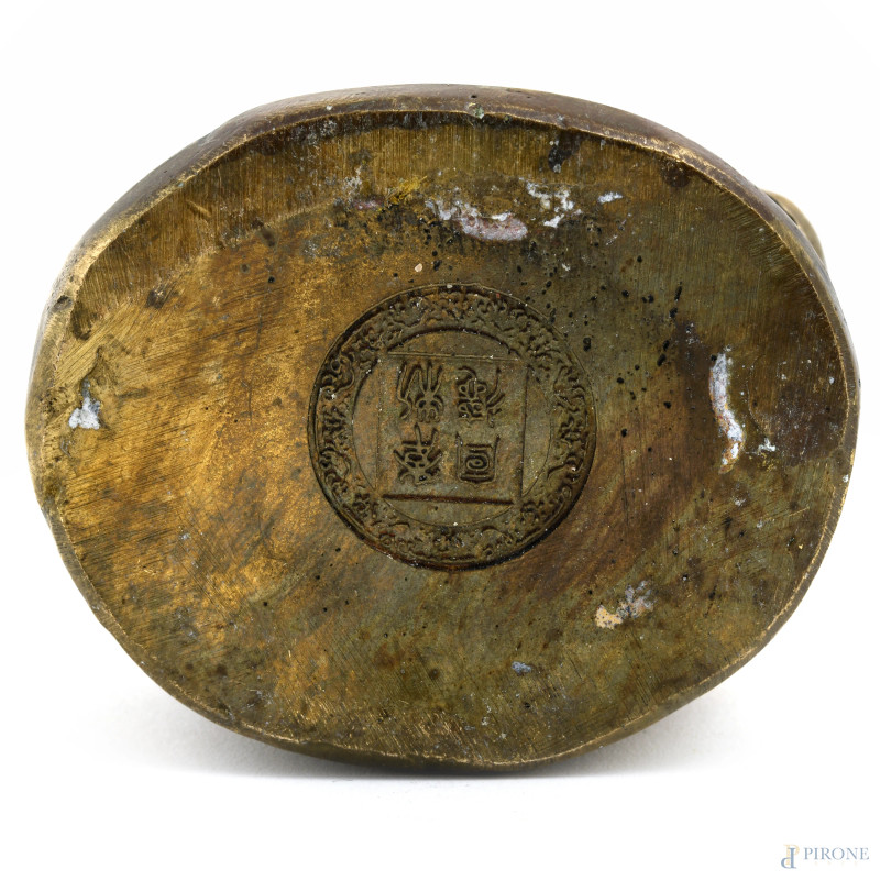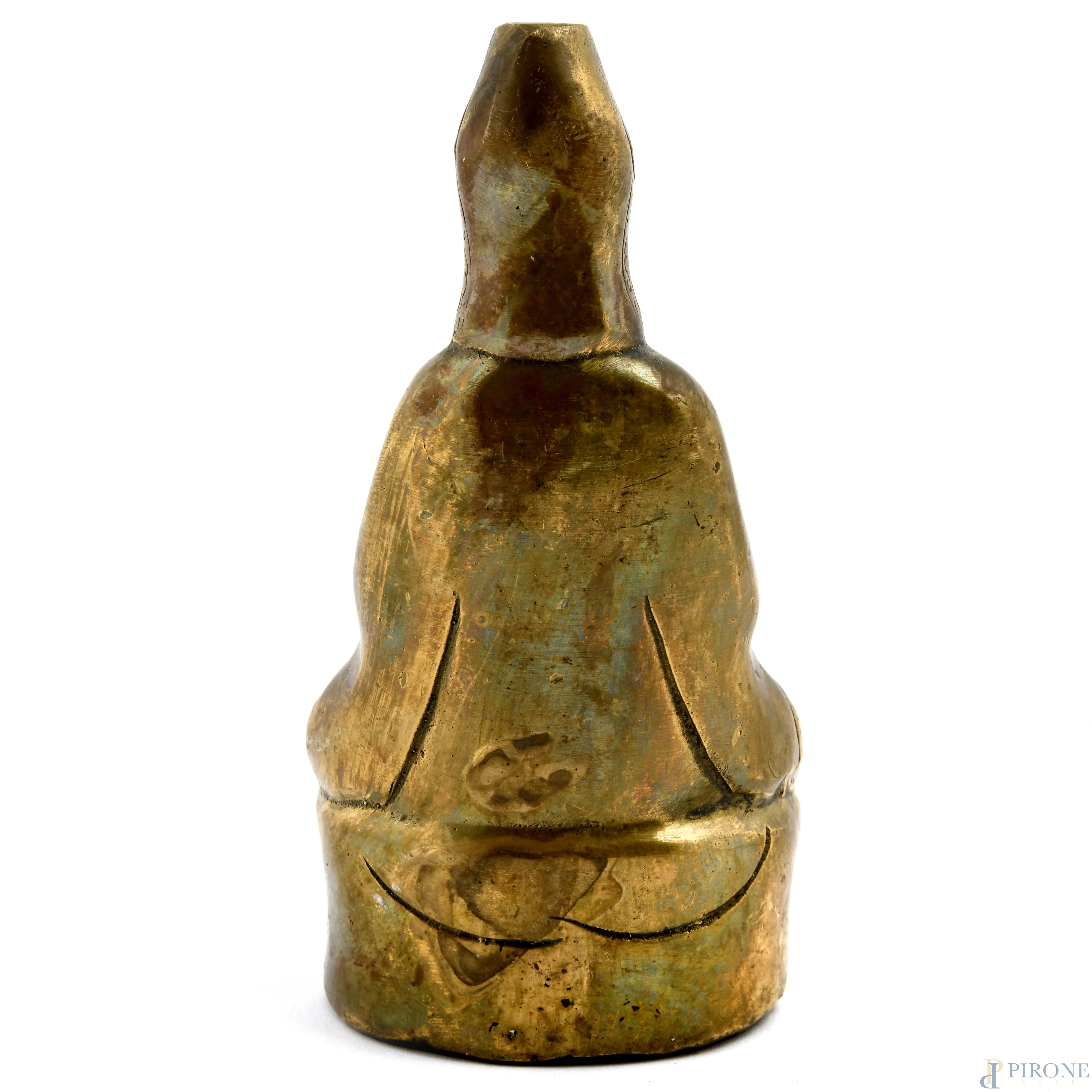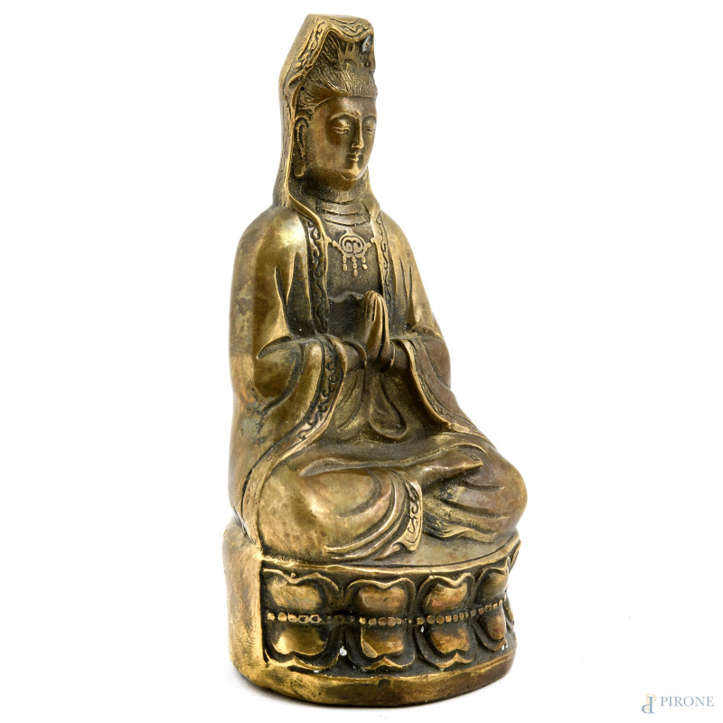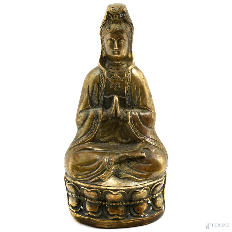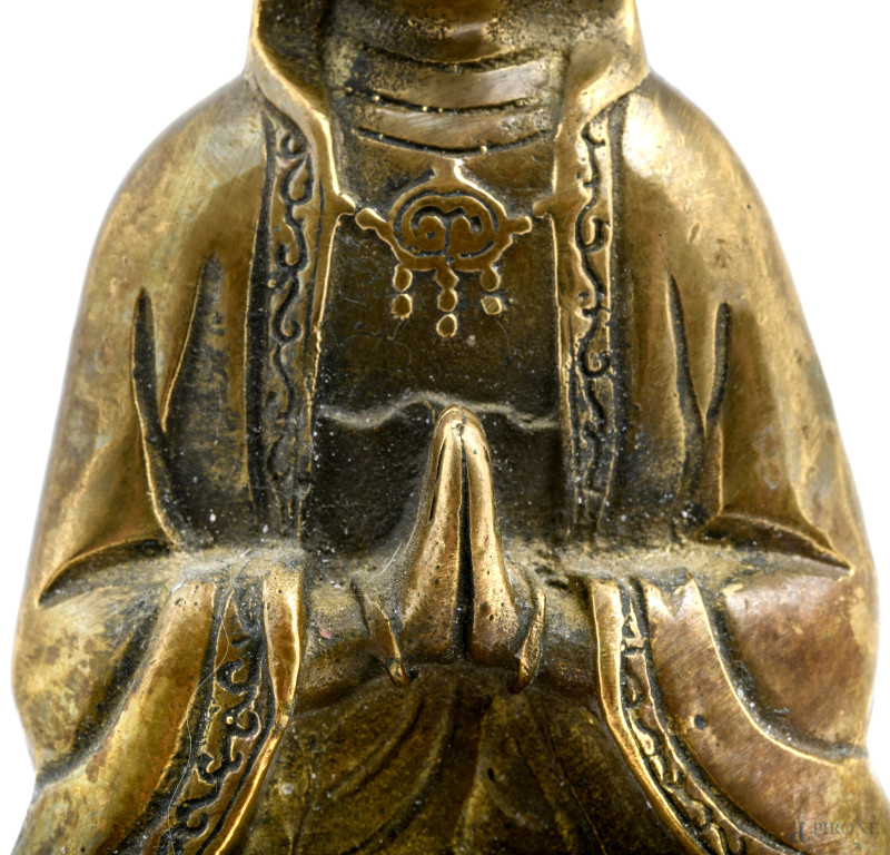 Scultura in metallo dorato raffigurante figura femminile a mani giunte. Cina, XX secolo, altezza cm 16