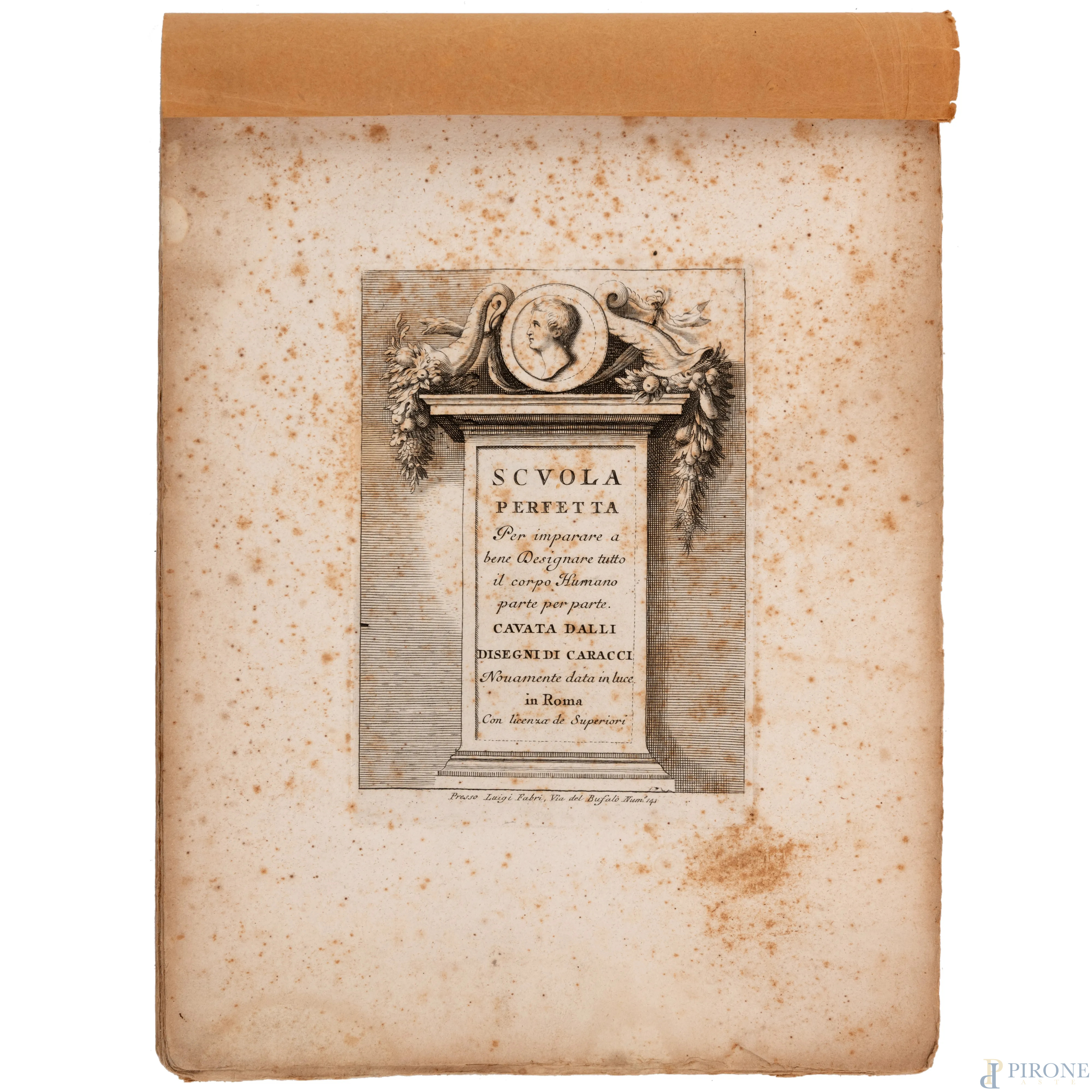 Scuola Perfetta per imparare a bene designare tutto il corpo Humano cavata dalli disegni di Carracci, (segni di usura, strappi, gore, foxing, tracce di umidità)