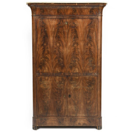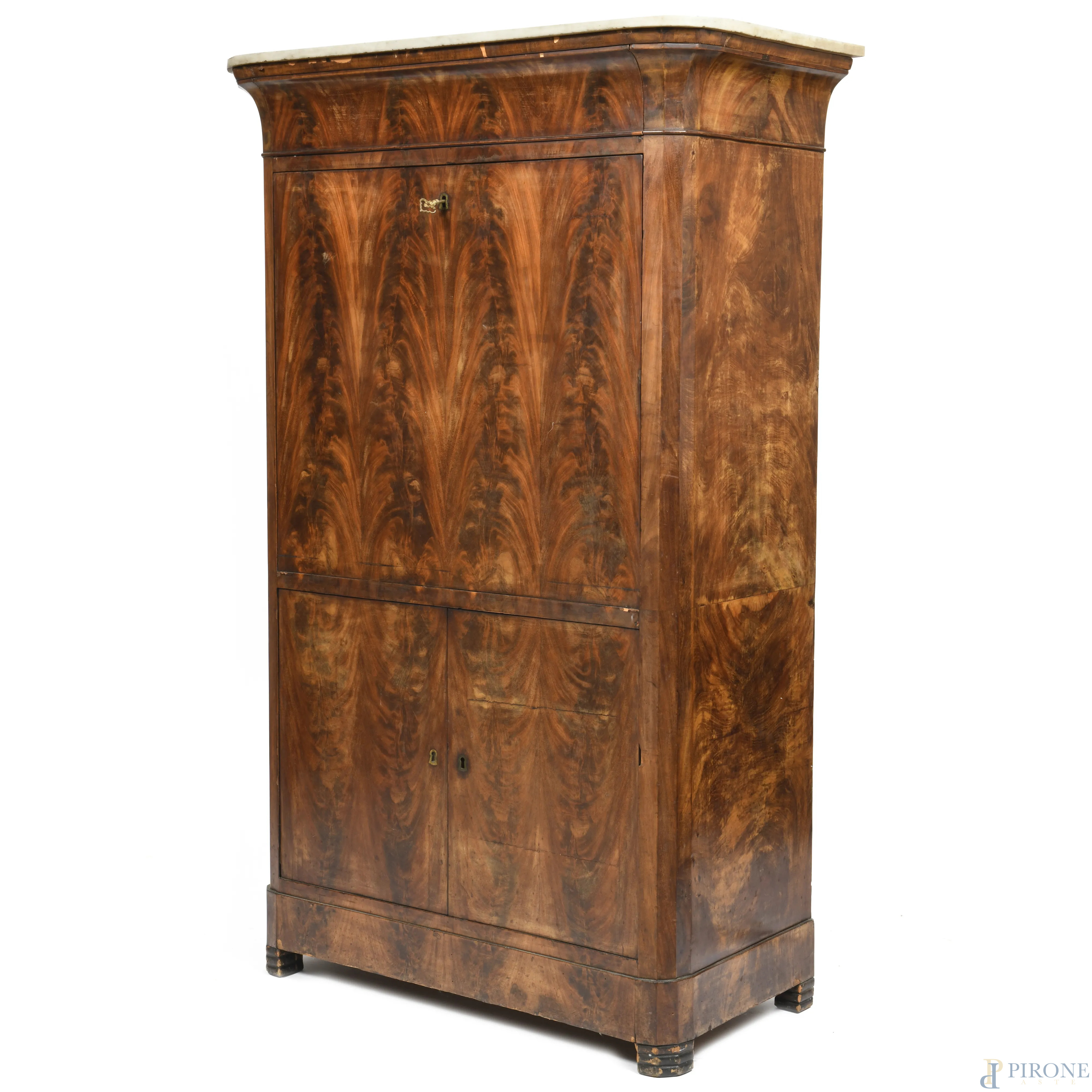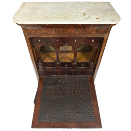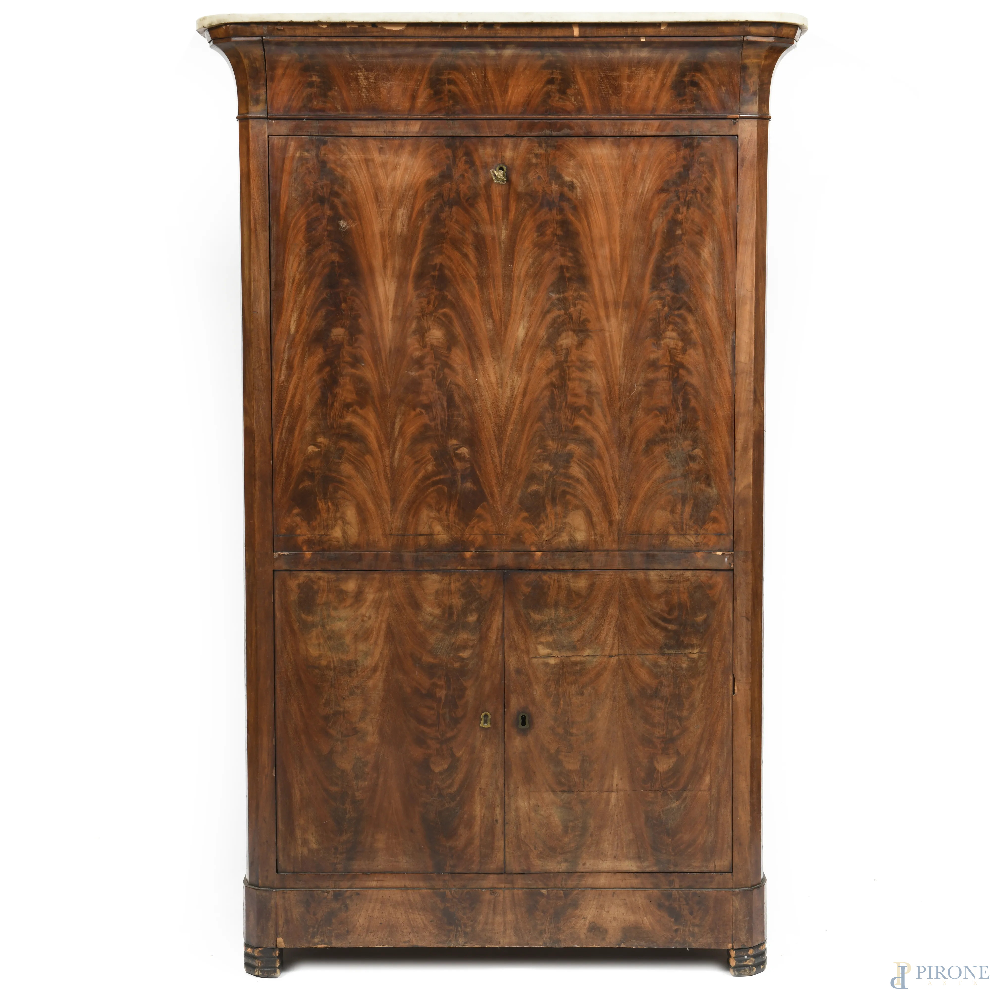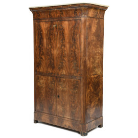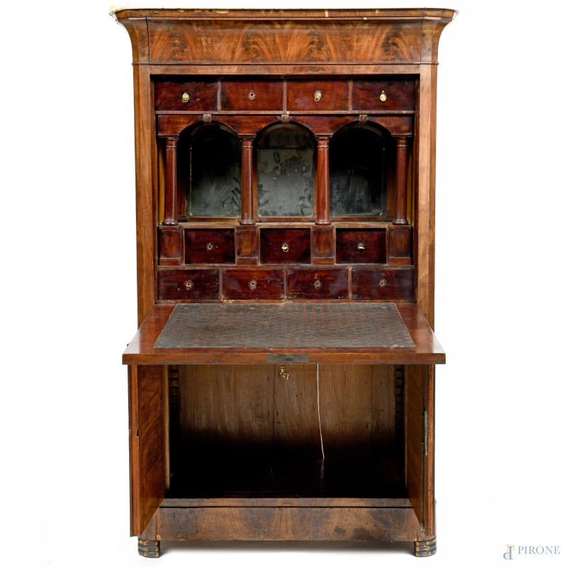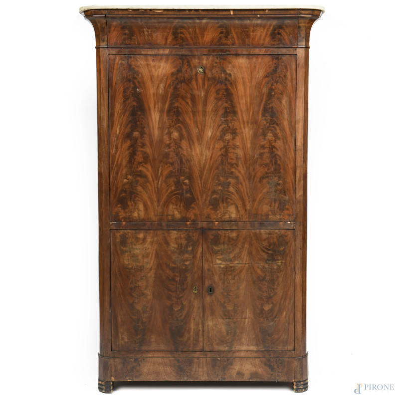 Secretaire impiallacciato in piuma di mogano con copertura apicale in marmo. XIX secolo, cm 167x104x53,5, (segni di usura, difetti, scalfiture)
